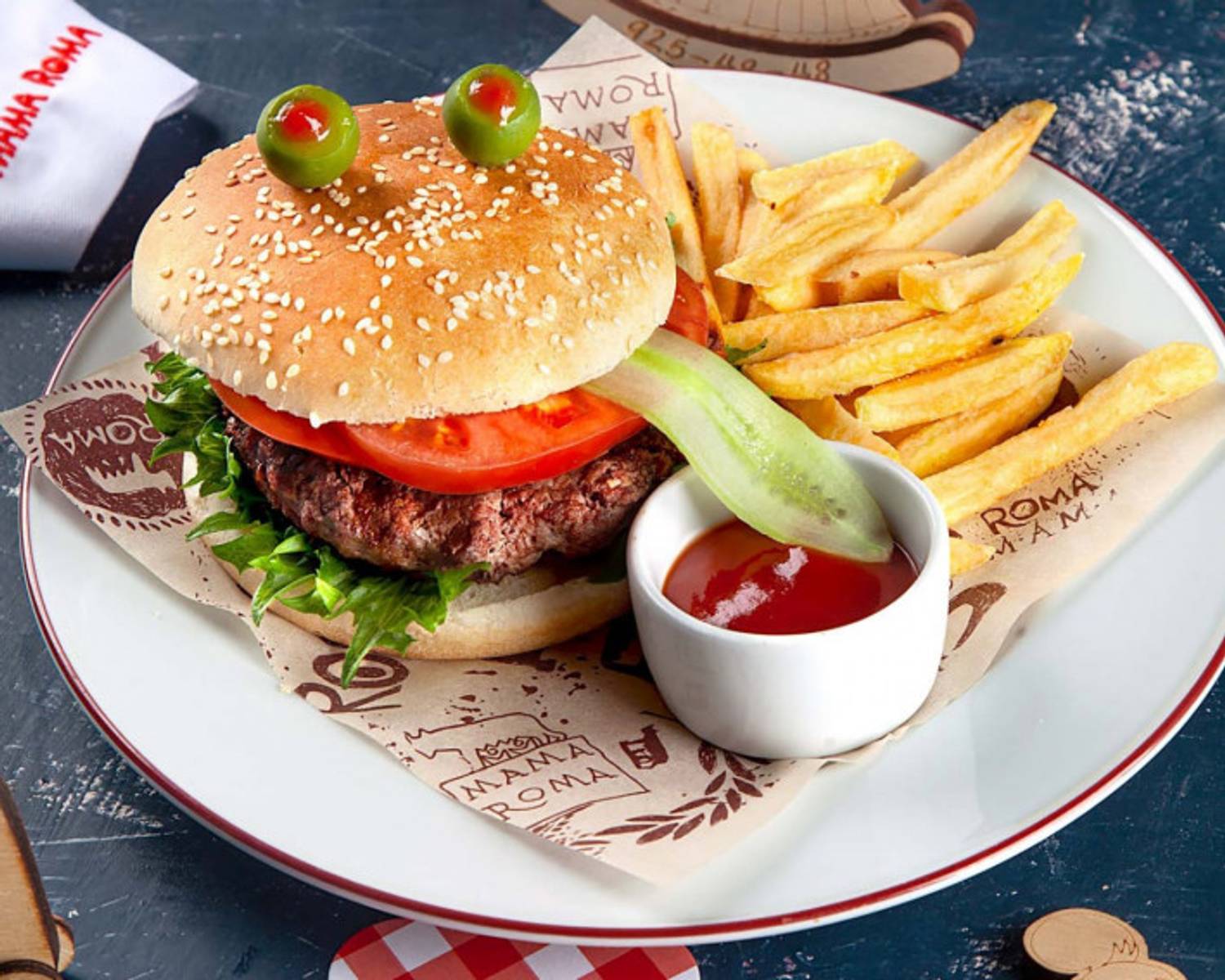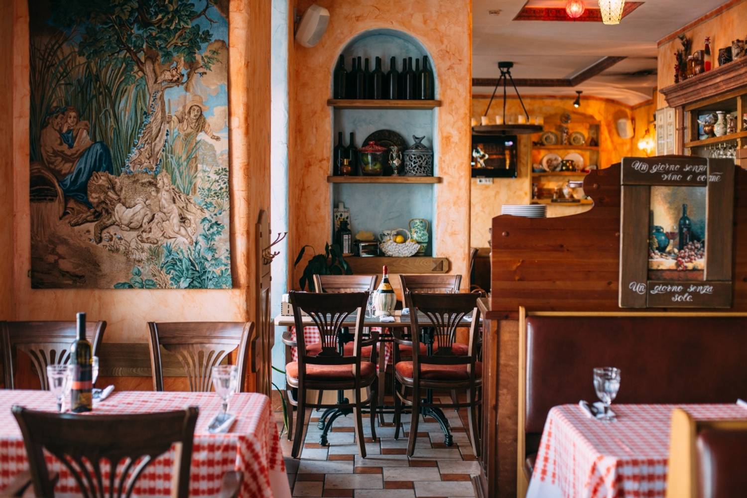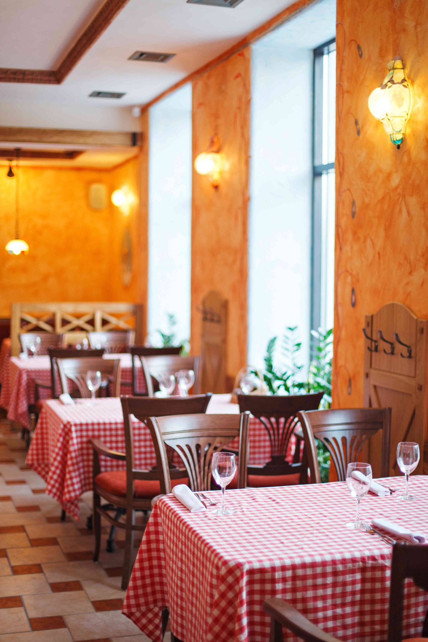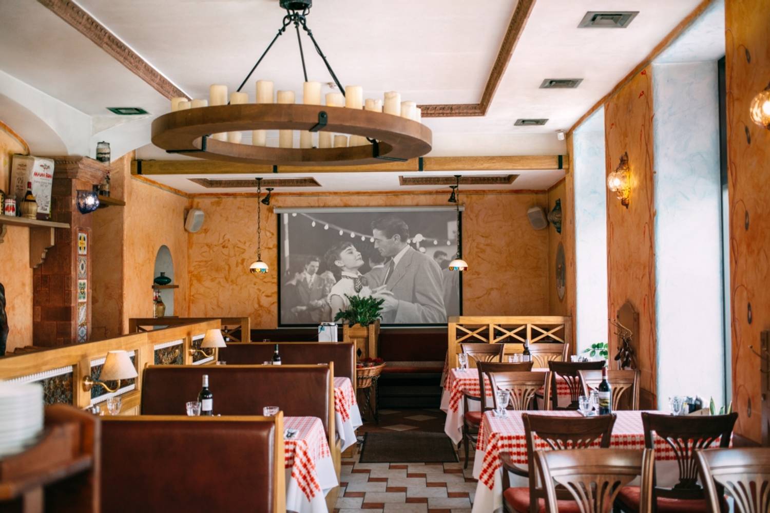 Атмосфера. Узнаваемый стиль сети передан через яркие красно-белые скатерти, деревянные стулья и черно-белые фотографии. Интерьер дополняют детали в духе старой Италии: плиточные орнаменты и пейзажи на стенах.