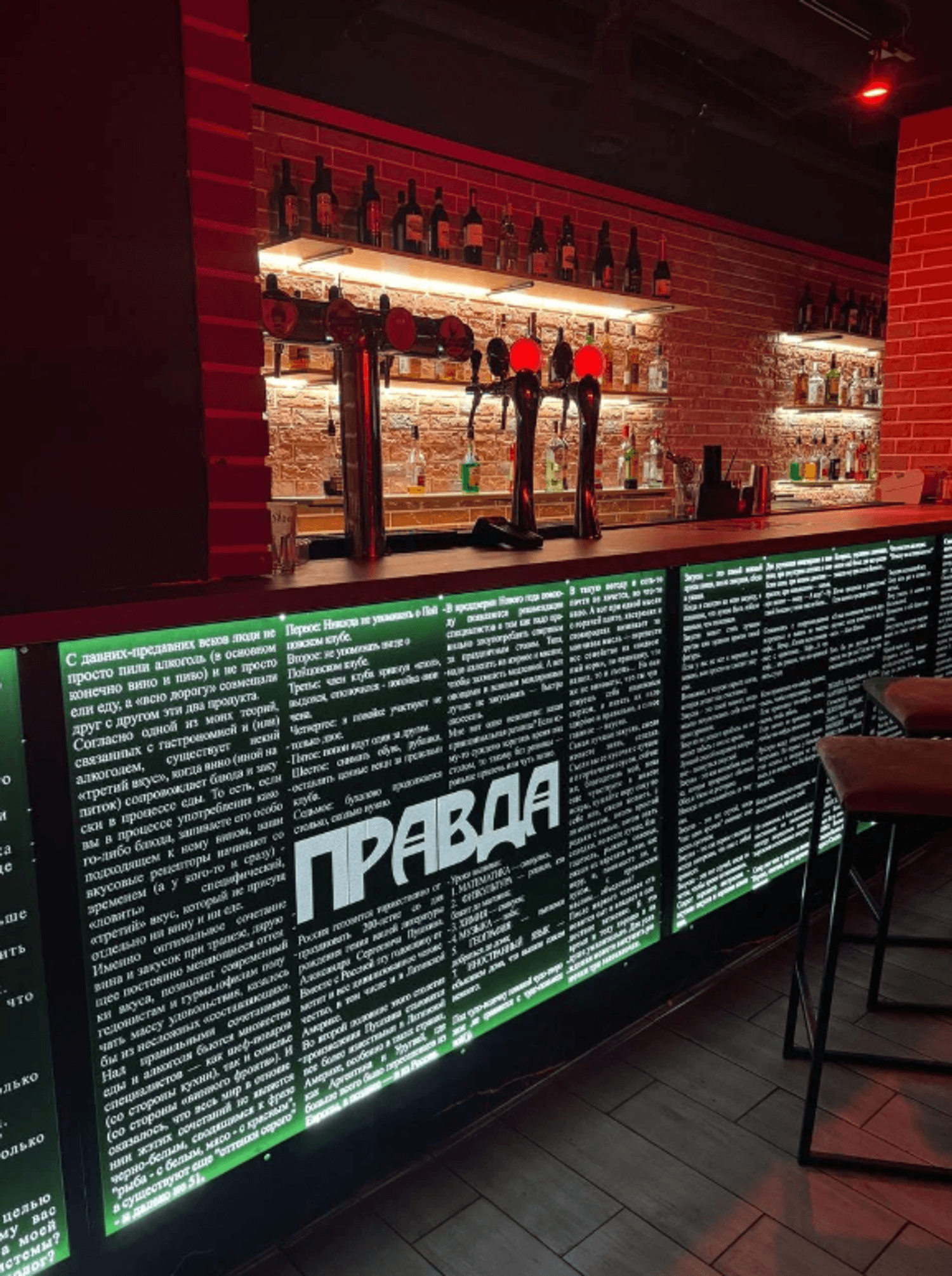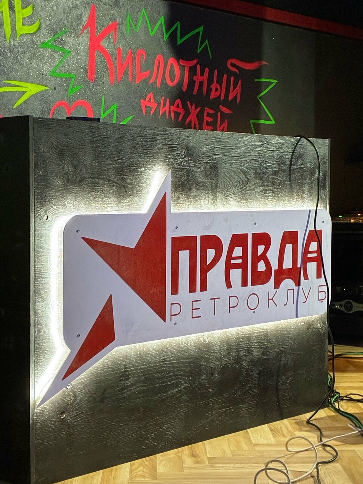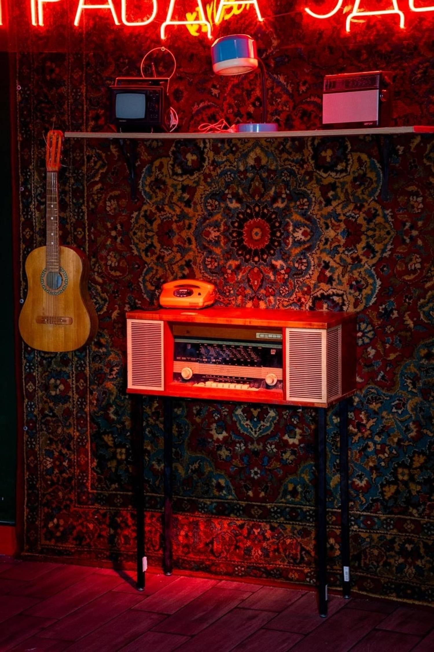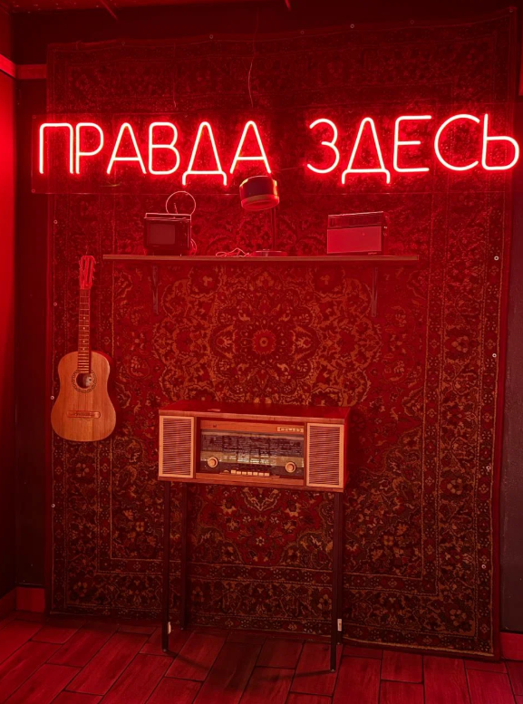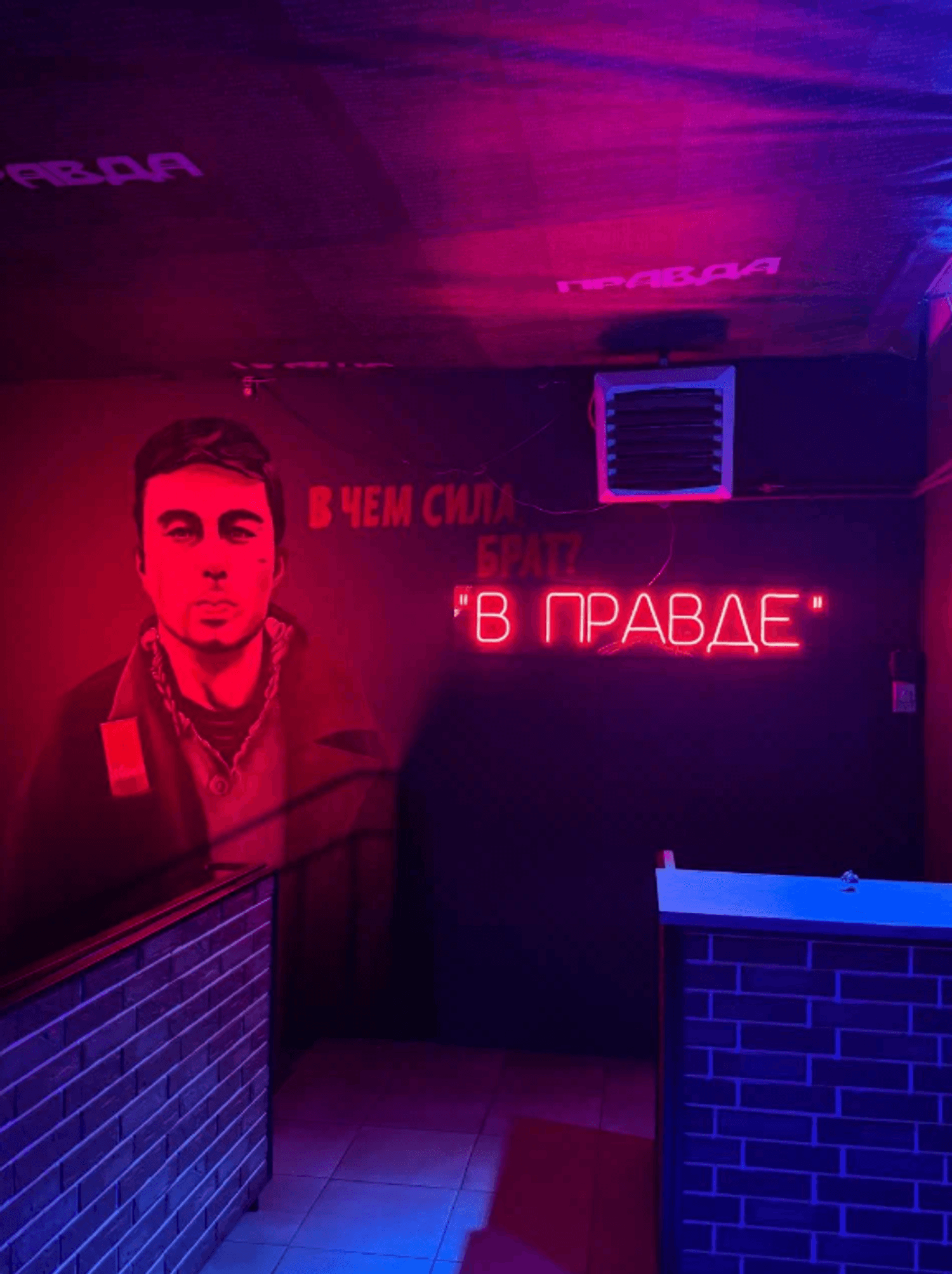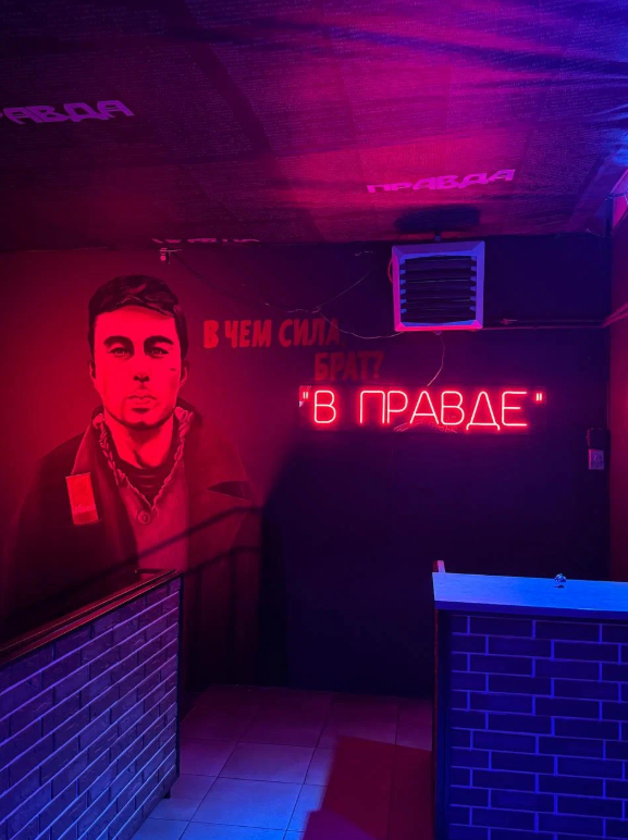 Атмосфера. На входе гостей встречает граффити с Сергеем Бодровым и знаменитая неоновая цитата: «В чем сила, брат? В правде». Зал наполнили ретро-артефактами: на полу нарисовали «классики», на стене — Марио, а одну из стен украсили ковровым покрытием с гитарой и радио.
