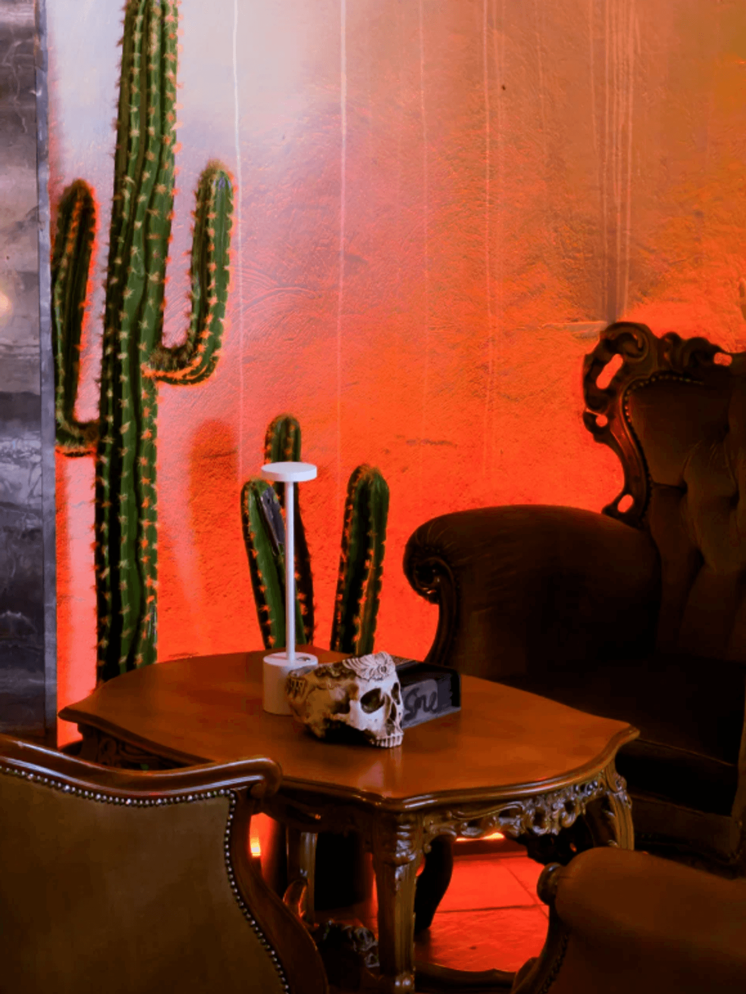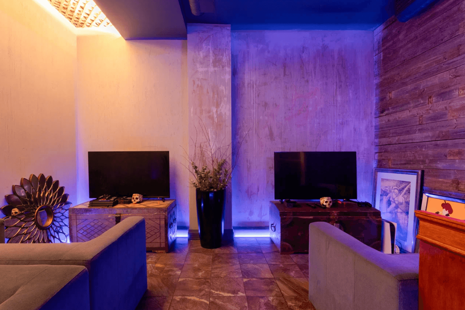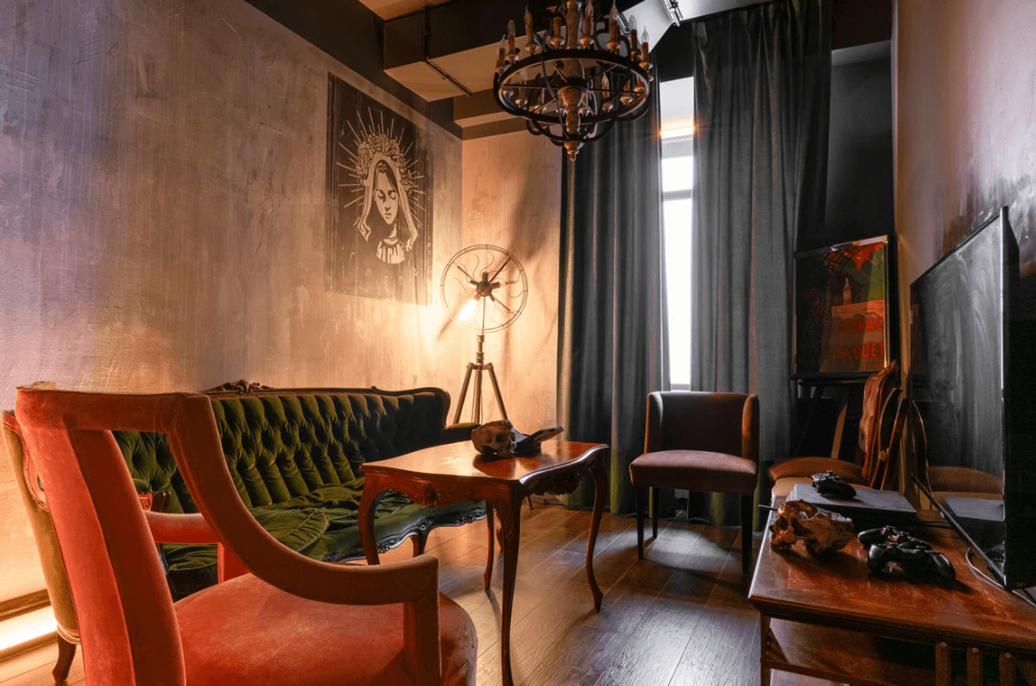 Атмосфера. Здесь несколько зон: темная гостиная с изображениями скелетов, светлый зал и игровая комната с приставками. Интерьер дополняют свечи, черепа, большой кактус, цветы и люстры с жемчужными подвесками, которые вписываются в таинственный стиль.