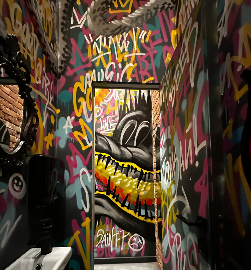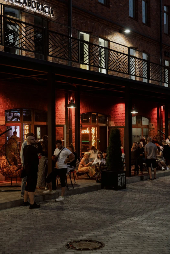 Атмосфера. Интерьер бара отражает авангардный дух: кирпичные стены, неоновая надпись с названием и барная стойка из стеклоблоков. Акцентная золотая люстра и разноцветная подсветка бара создают динамичную обстановку. По выходным здесь проходят живые выступления бэндов, а в летнее время гости могут отдохнуть во дворе пространства Seno.