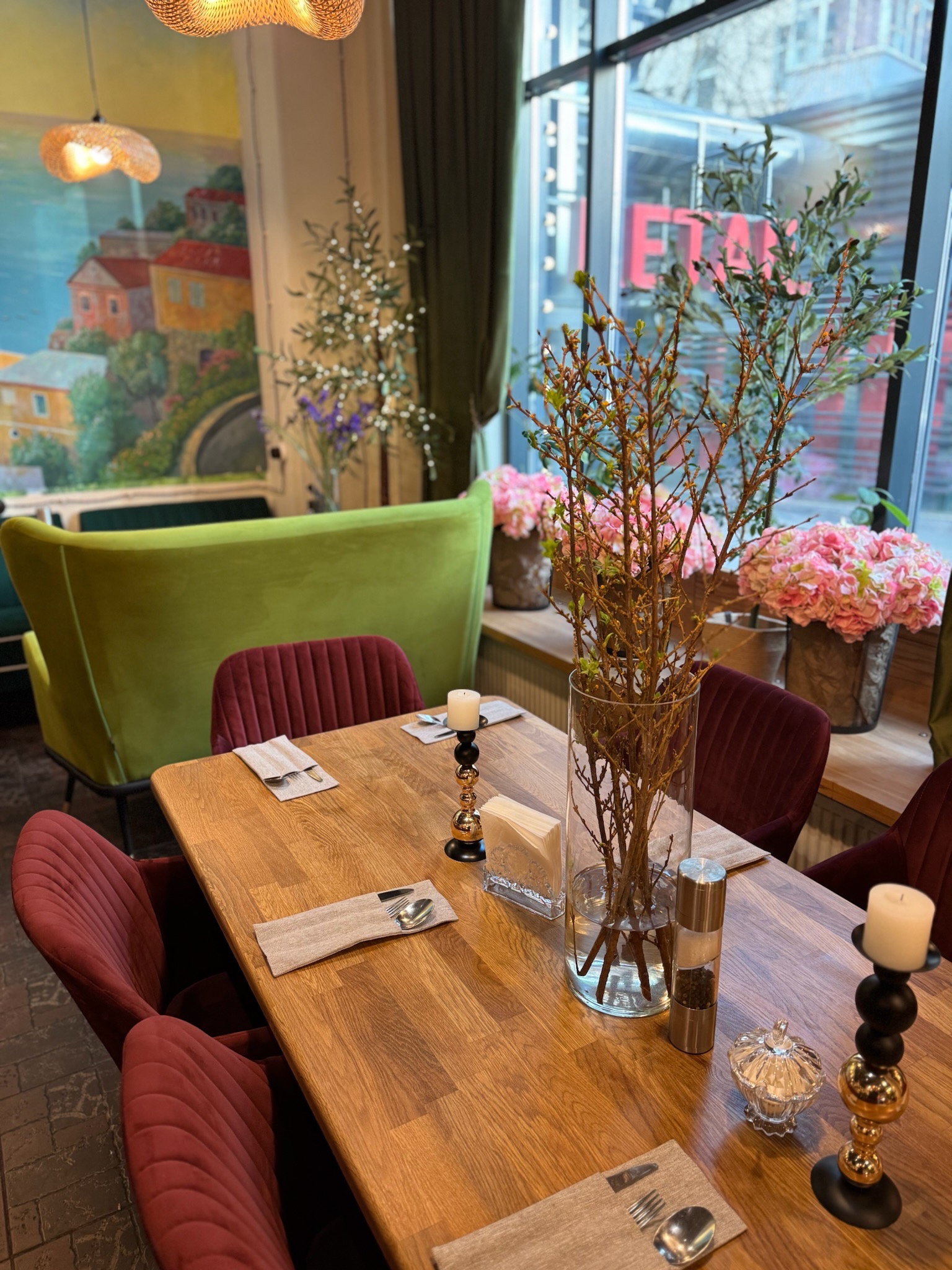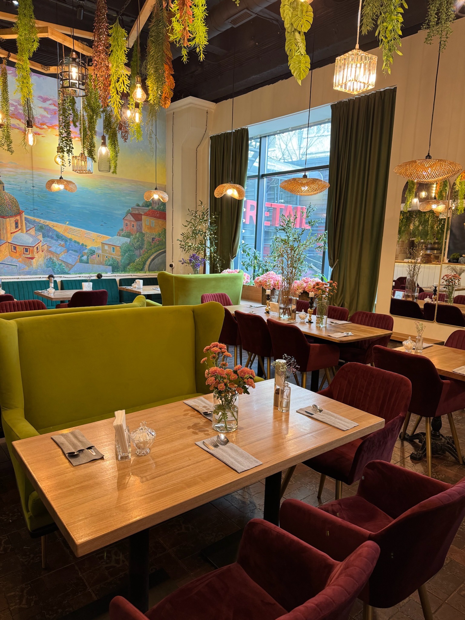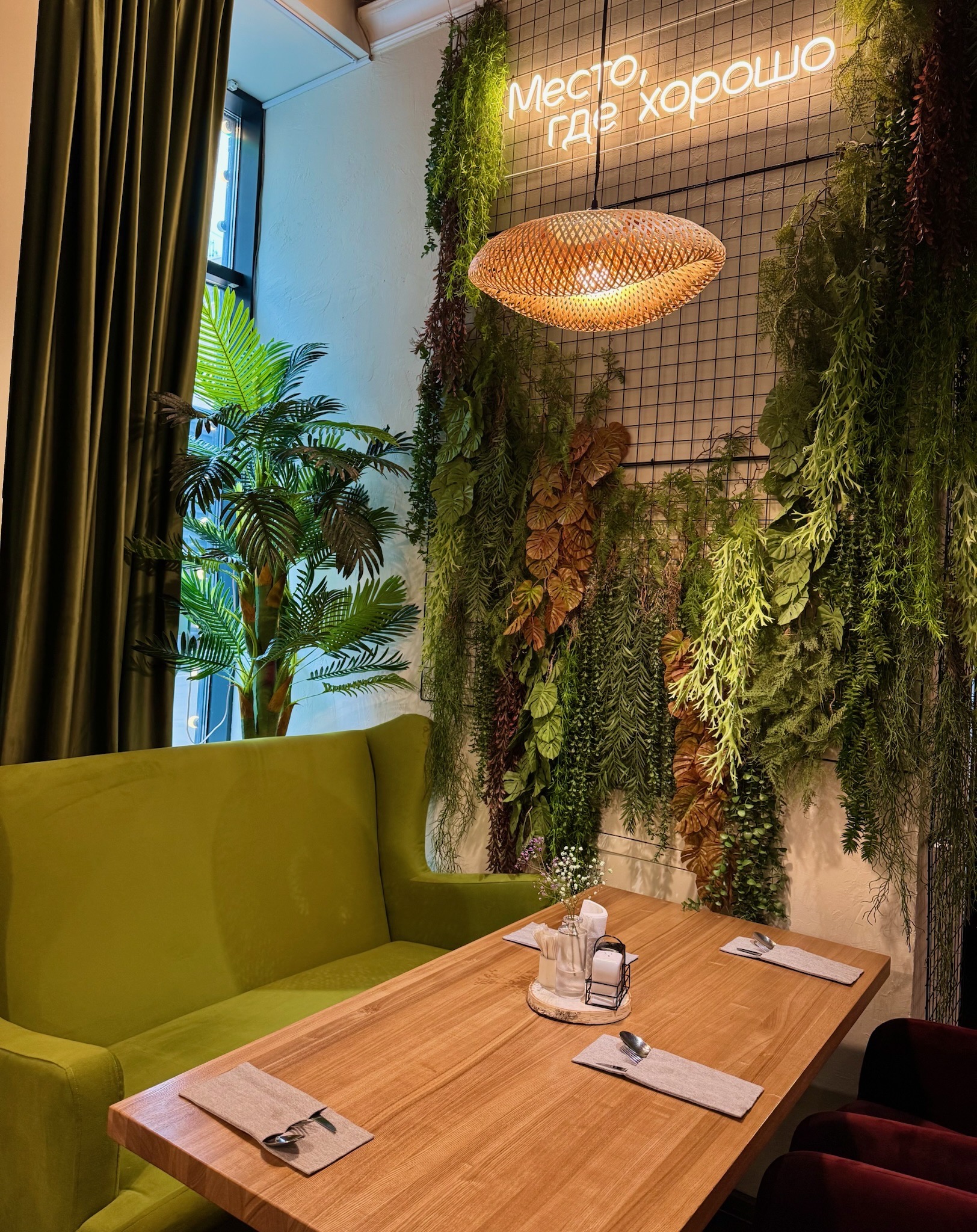 Атмосфера. В интерьере превалируют теплые зеленые и бежевые оттенки, а свисающие с потолка растения и уютные диваны добавляют ощущение домашнего комфорта.