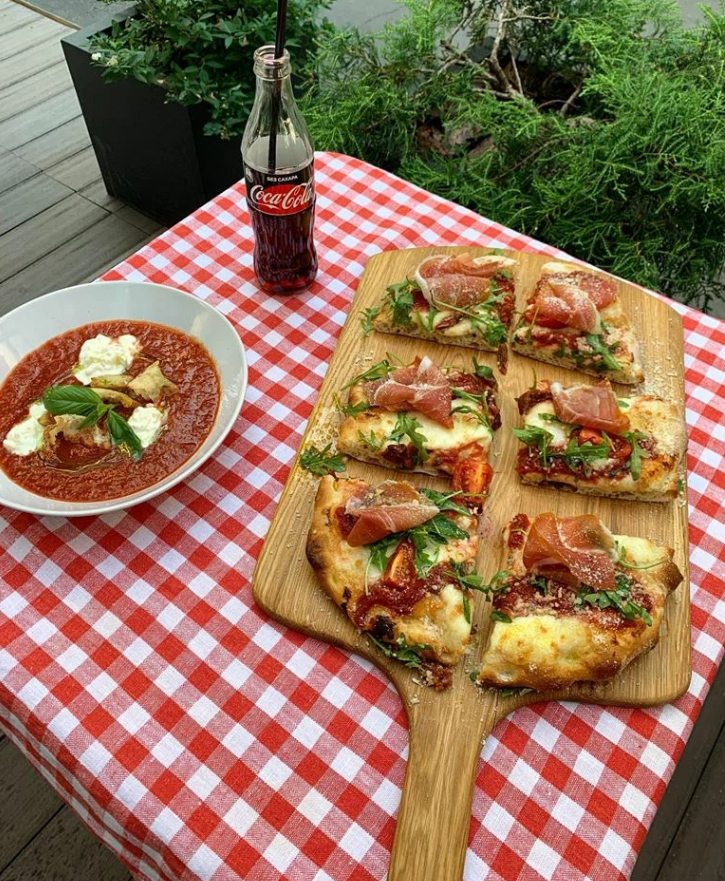 Еда и напитки. В меню — классические итальянские блюда: пицца «Маргарита», ризотто с белыми грибами, паста «Болоньезе», а также авторские блюда от шефа, например, пицца с утиной грудкой и инжиром. На закуску предложат томатный суп, салат с хрустящими баклажанами или ризотто с креветками. В баре собрана коллекция исключительно итальянских вин.