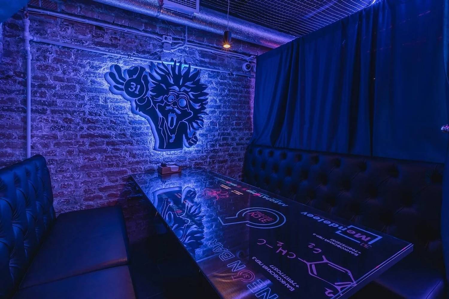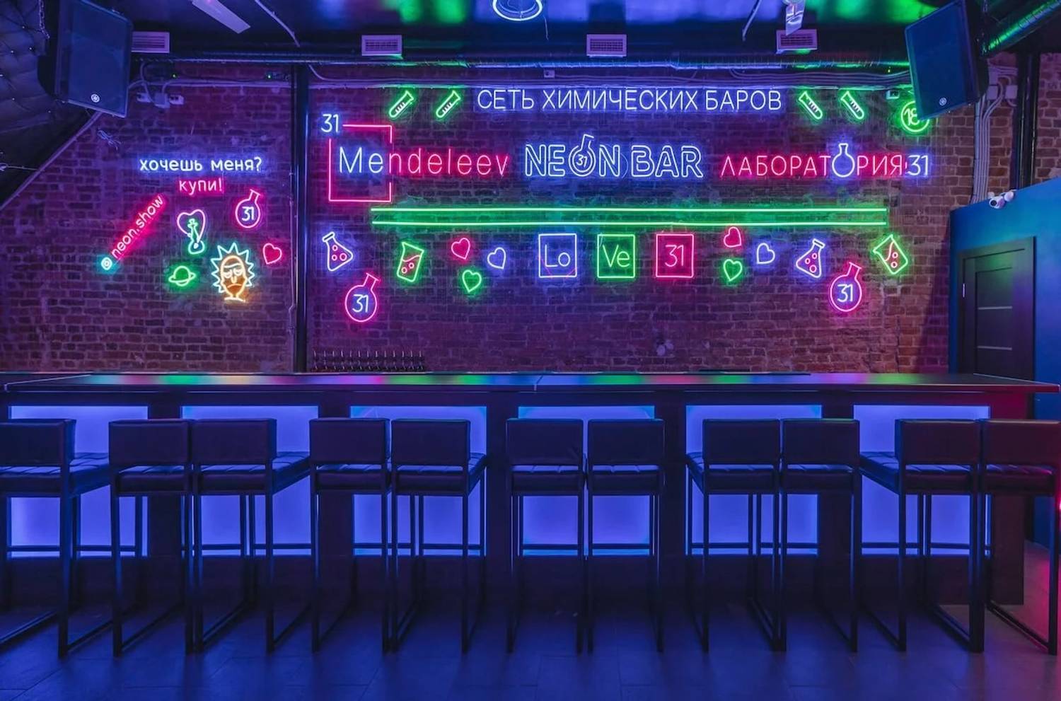 Еда и напитки. Главный герой меню — авторские коктейли, карта которых стилизована под таблицу Менделеева. Напитки подают в пробирках и дымящихся колбах, а их названия отсылают к химическим элементам. К ним закажите сырные палочки с брусничным соусом, хрустящие гренки, пасту или куриный шашлык.
