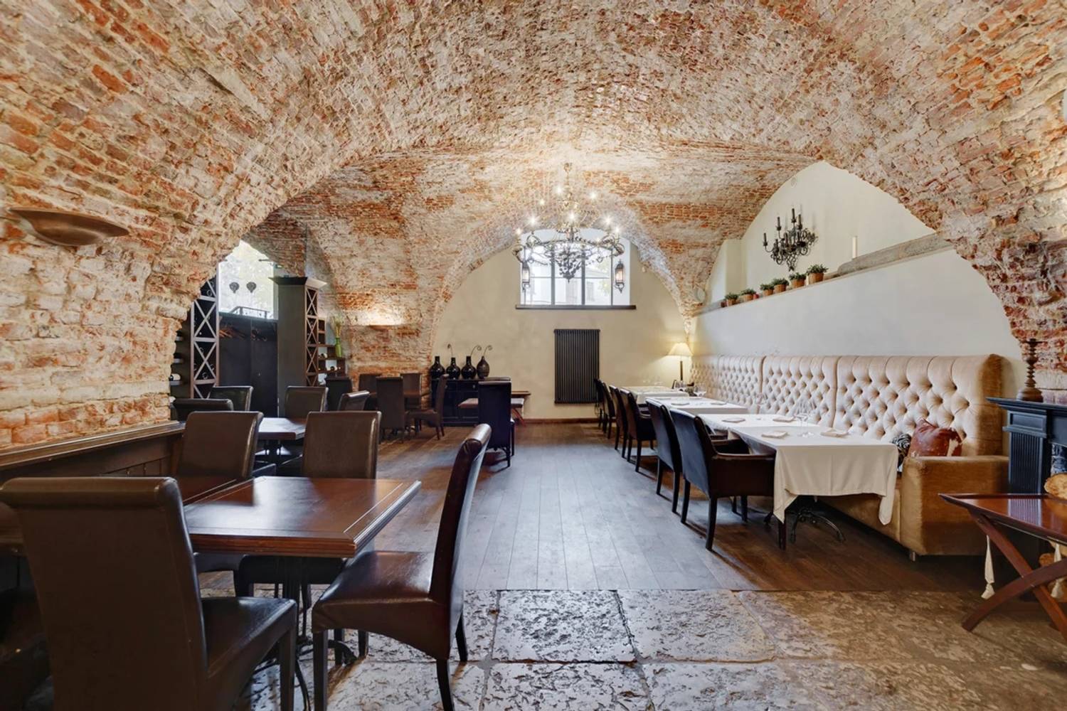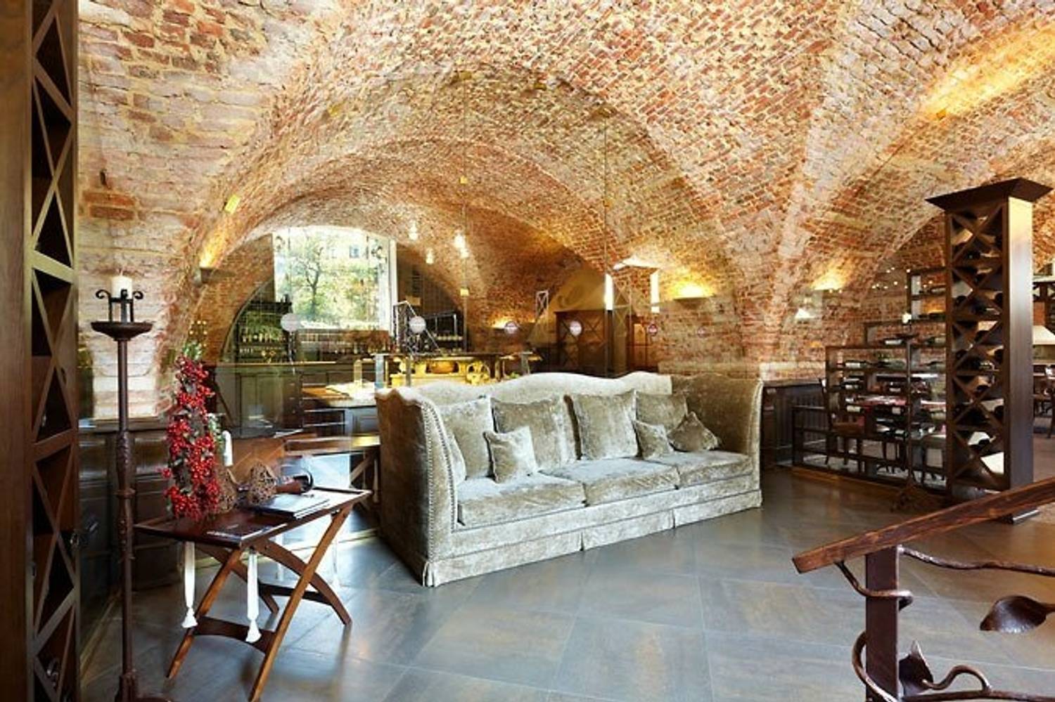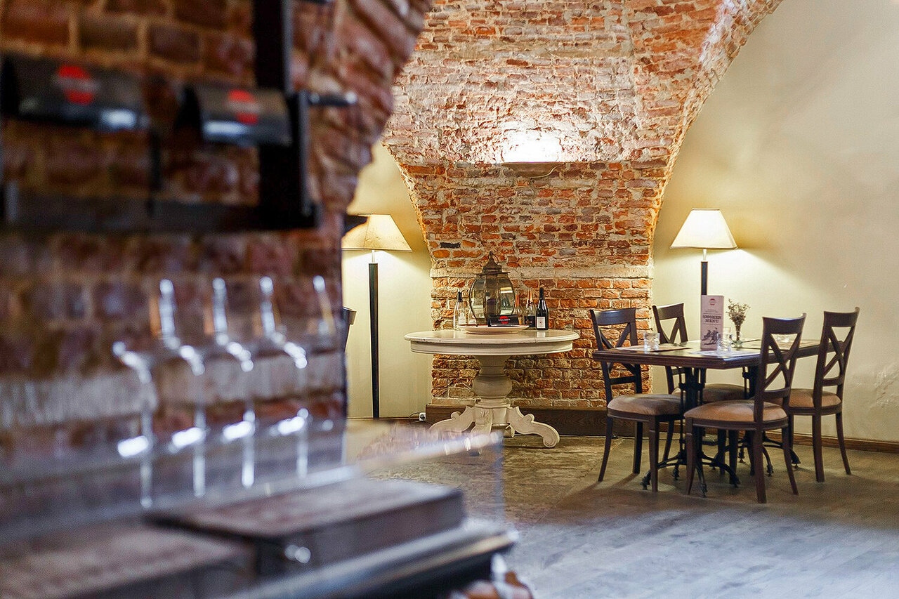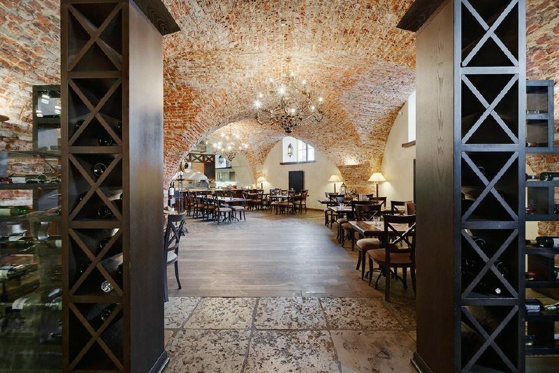 Атмосфера. Сводчатые потолки с кирпичной кладкой, хрустальные люстры и итальянские мотивы создают ощущение ужина где-то в старинном замке или кирхе. Один из залов с открытой кухней позволяет наблюдать за работой поваров, а в винной зоне гостей ждет специальный дегустационный стол.