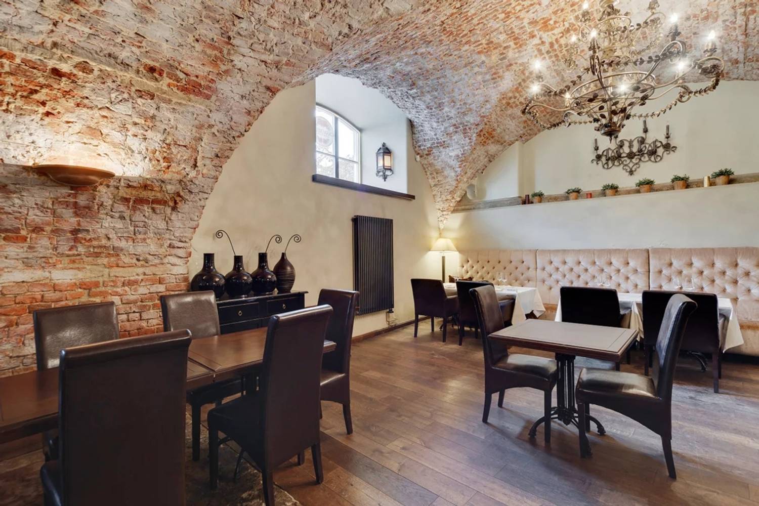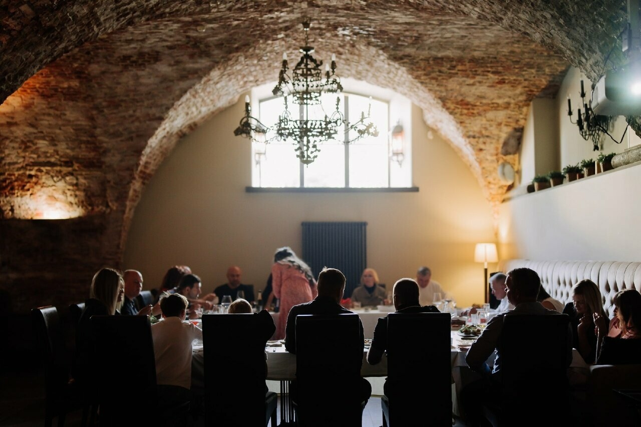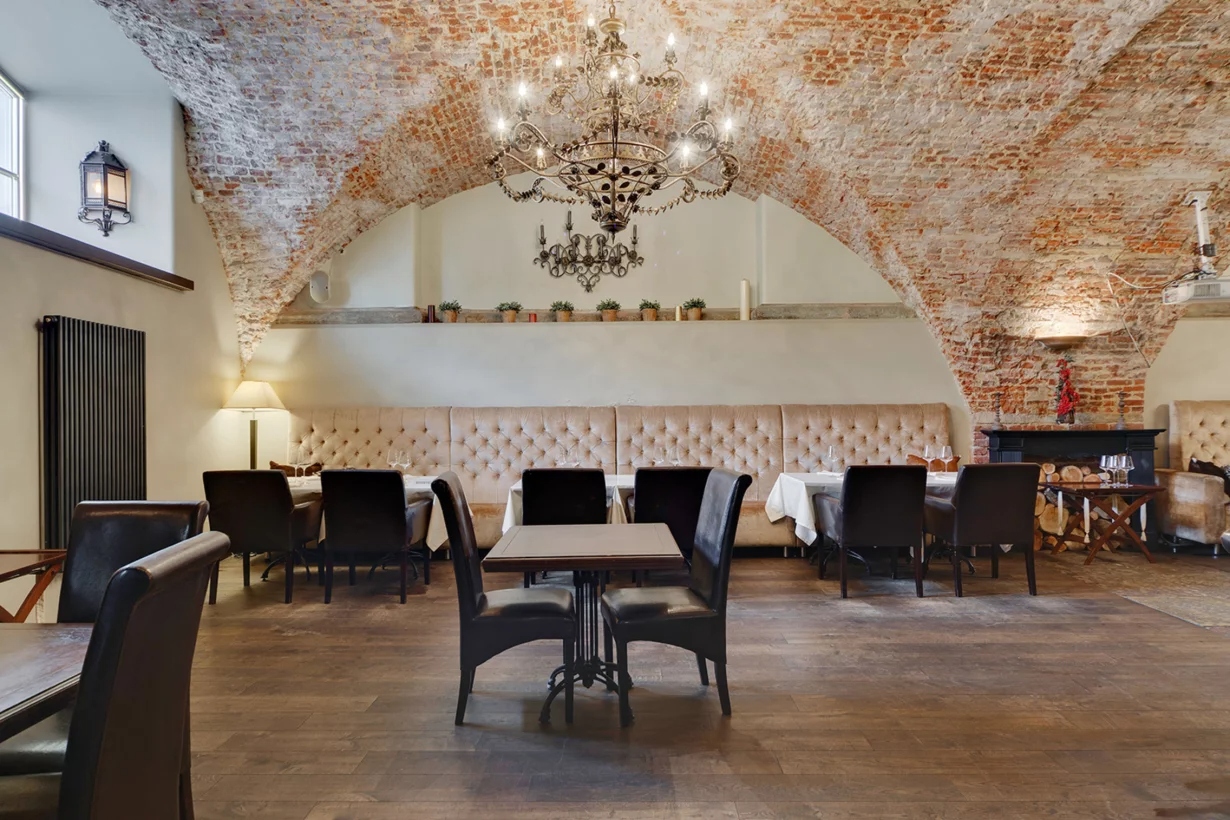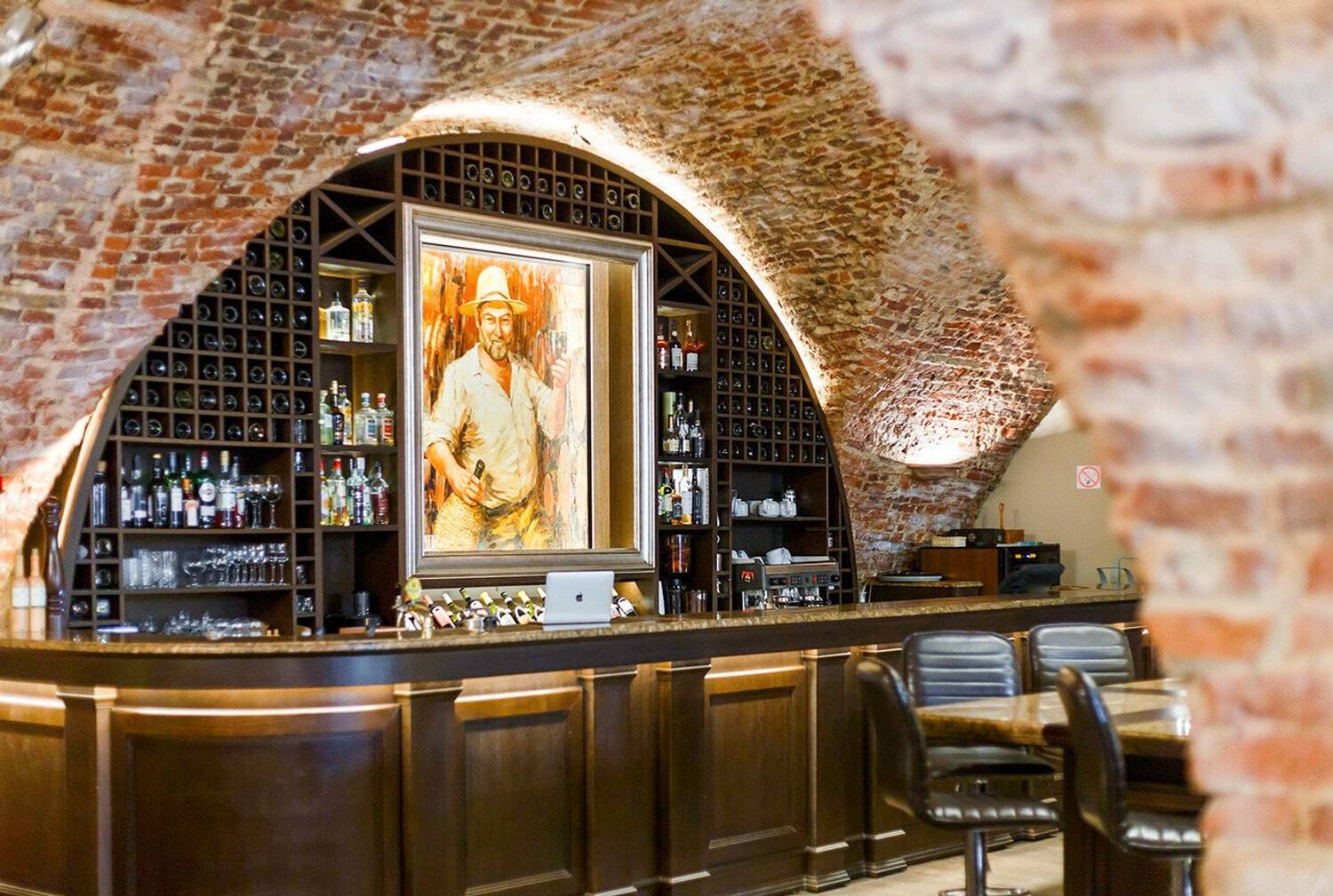 Атмосфера. Сводчатые потолки с кирпичной кладкой, хрустальные люстры и итальянские мотивы создают ощущение ужина где-то в старинном замке или кирхе. Один из залов с открытой кухней позволяет наблюдать за работой поваров, а в винной зоне гостей ждет специальный дегустационный стол.