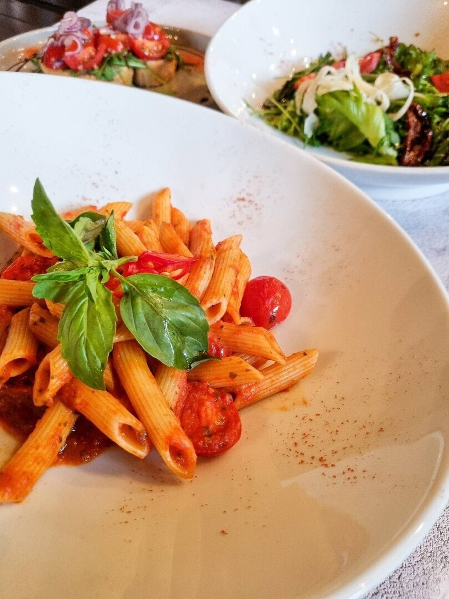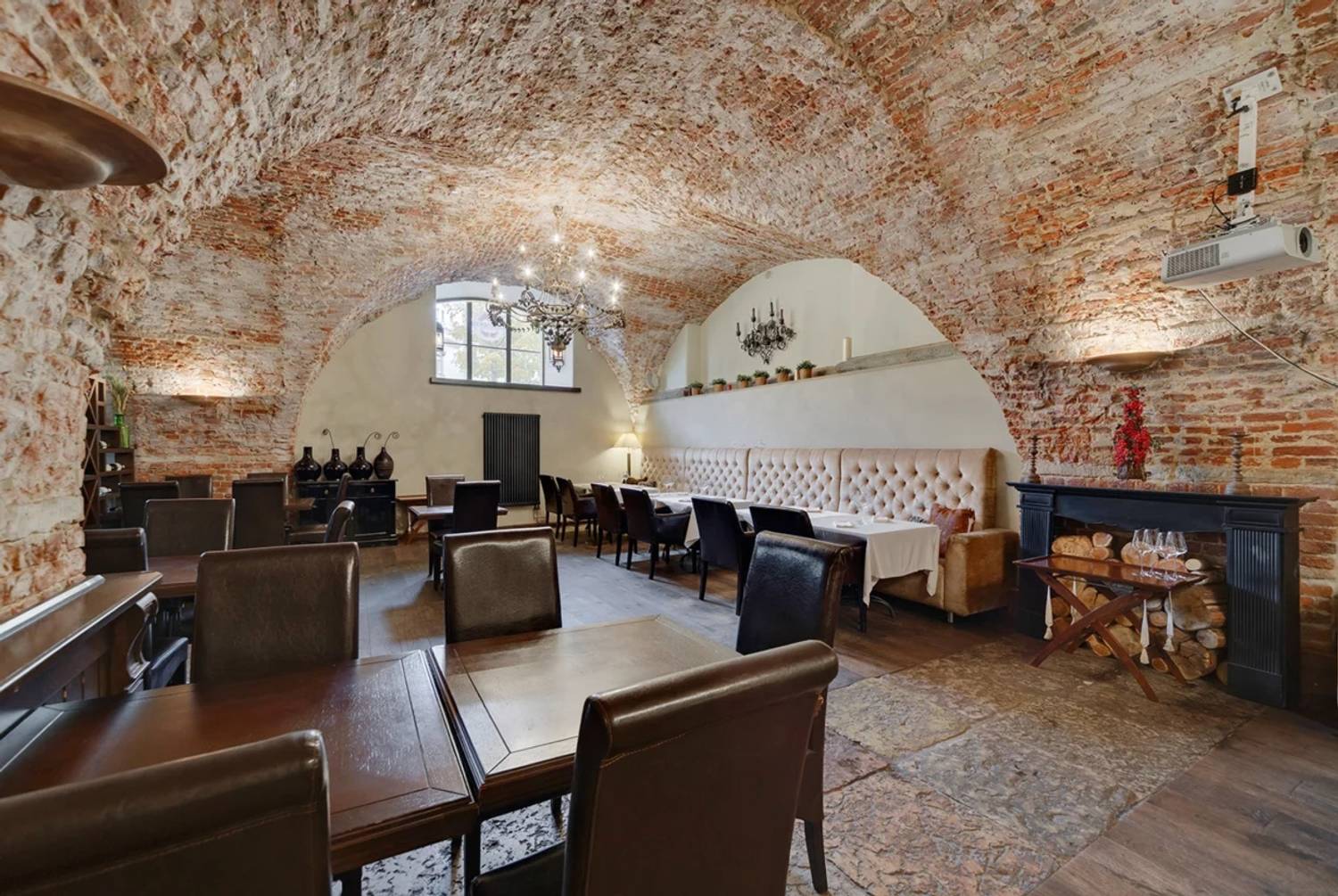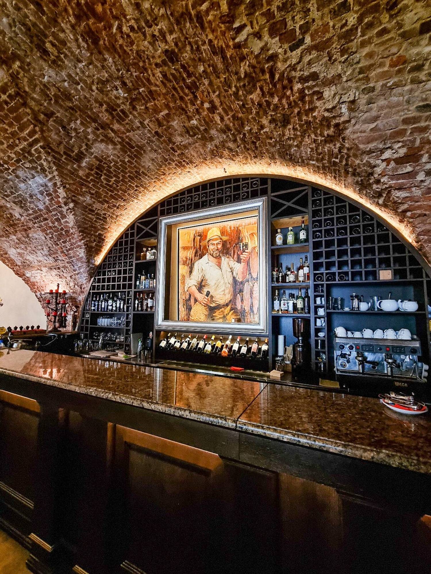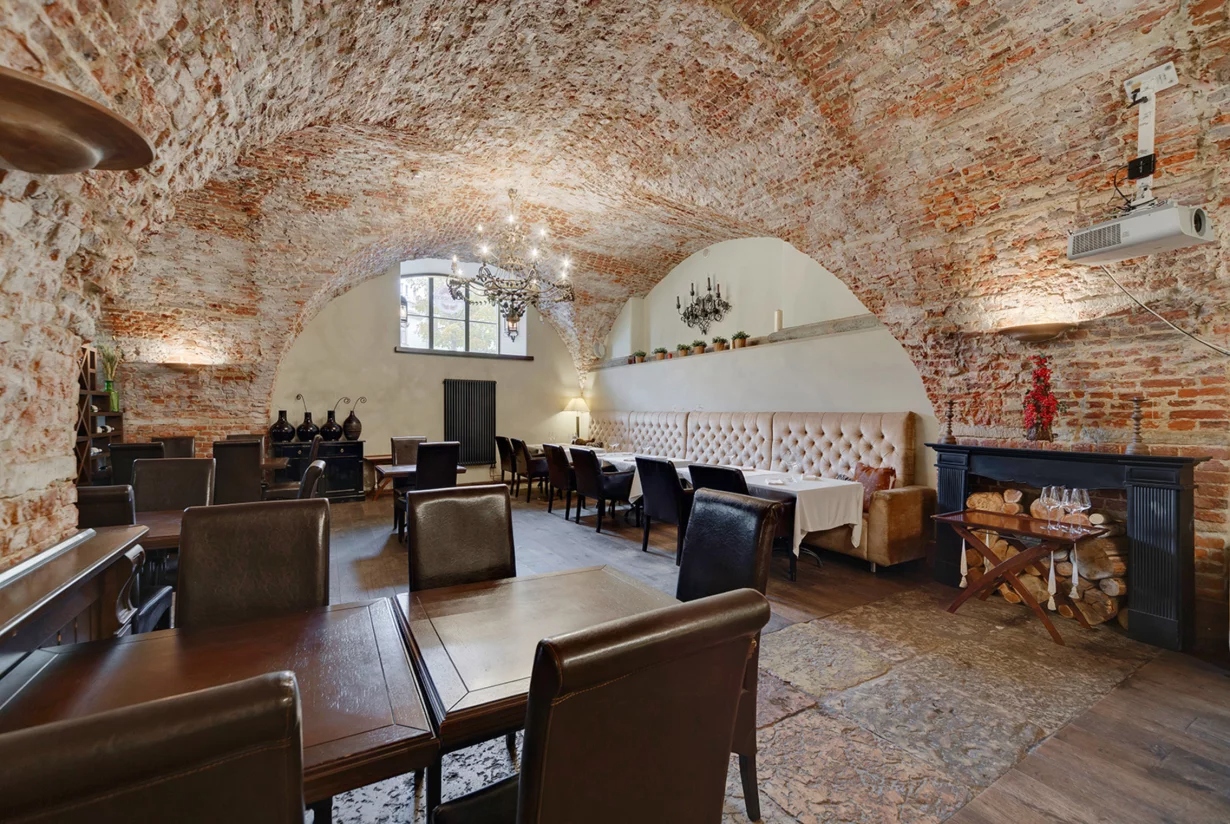 Атмосфера. Сводчатые потолки с кирпичной кладкой, хрустальные люстры и итальянские мотивы создают ощущение ужина где-то в старинном замке или кирхе. Один из залов с открытой кухней позволяет наблюдать за работой поваров, а в винной зоне гостей ждет специальный дегустационный стол.
