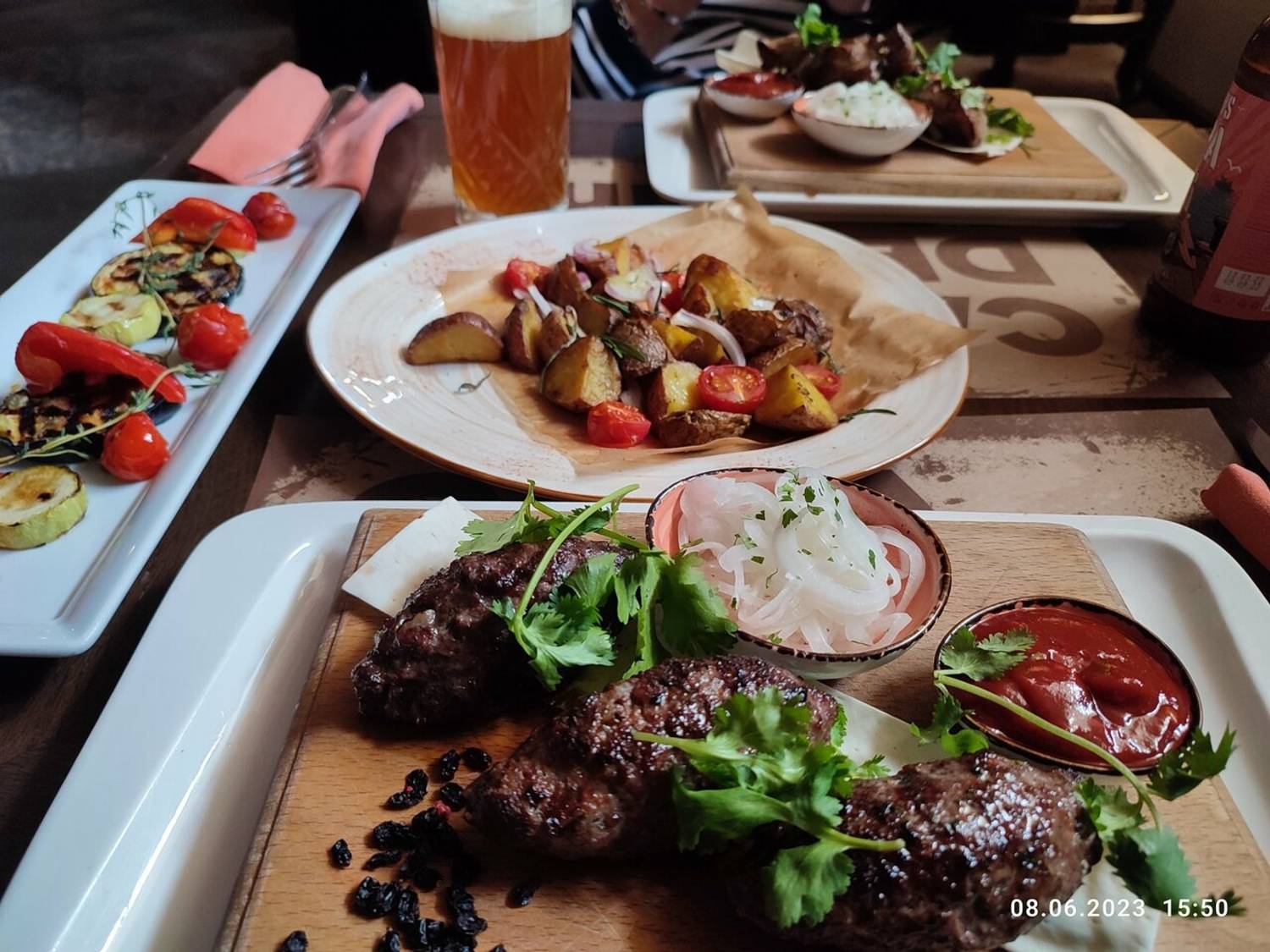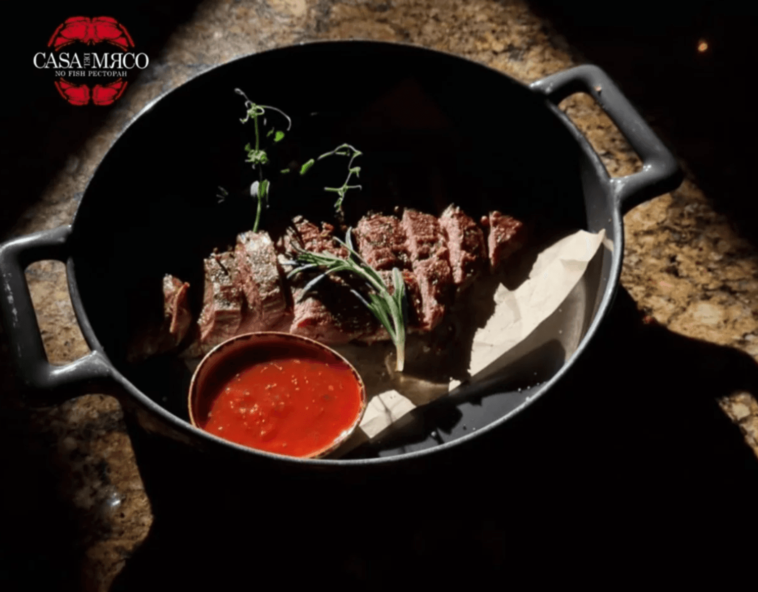 Еда и напитки. В меню представлены мясные специалитеты: тартары из оленины и говядины, стейки весом до 500 грамм, люля-кебабы и свиные ребра. Карта напитков включает европейские вина, российское крафтовое пиво в бутылках и классические коктейли.