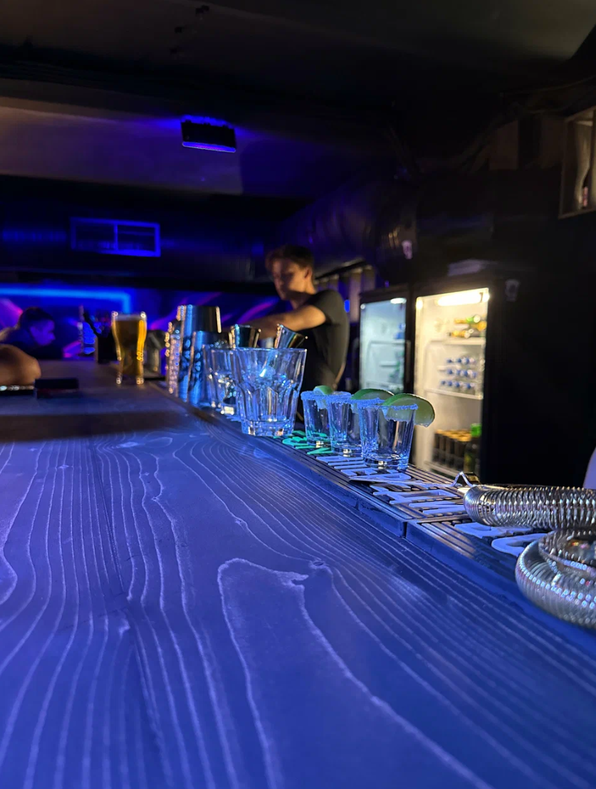 Атмосфера. В заведении царят яркие клубные вайбы благодаря неоновым акцентам и зажигательной музыке. Просторное помещение с кожаными диванами идеально подходит для встреч с друзьями или вечерних вечеринок.