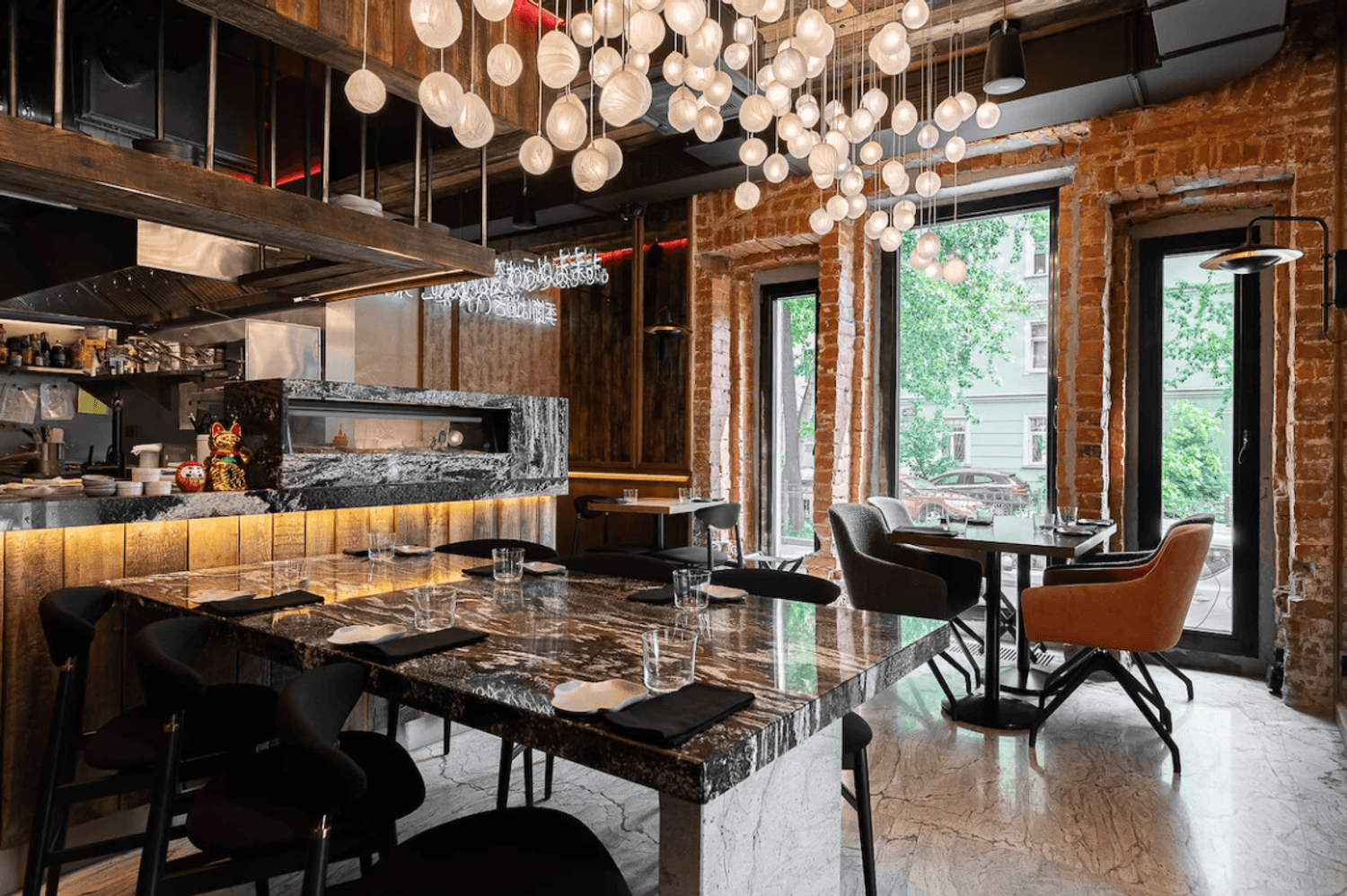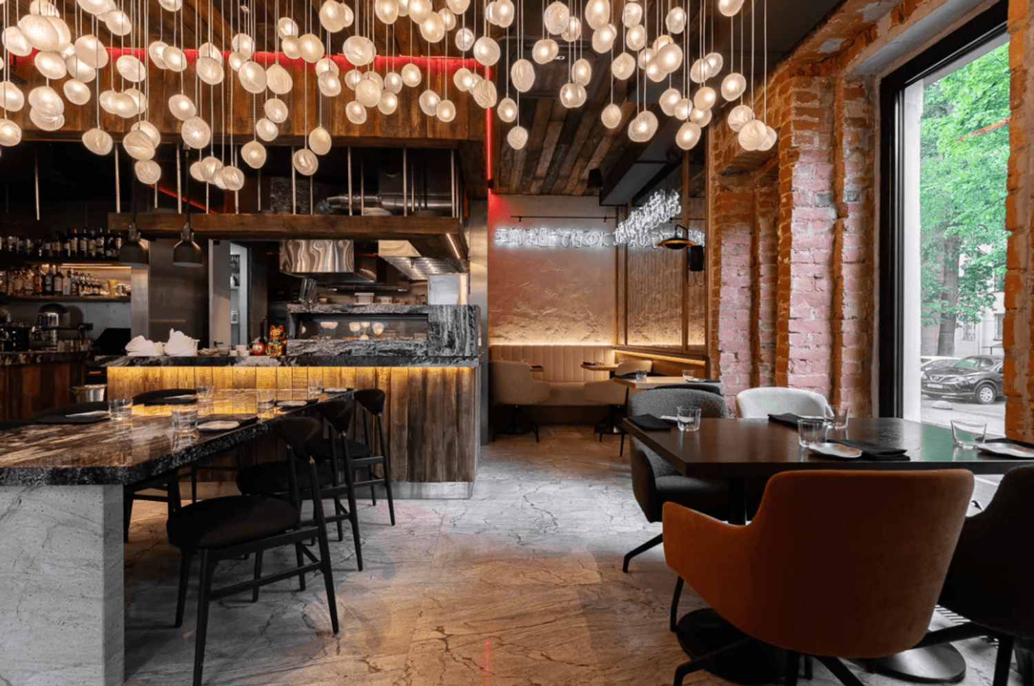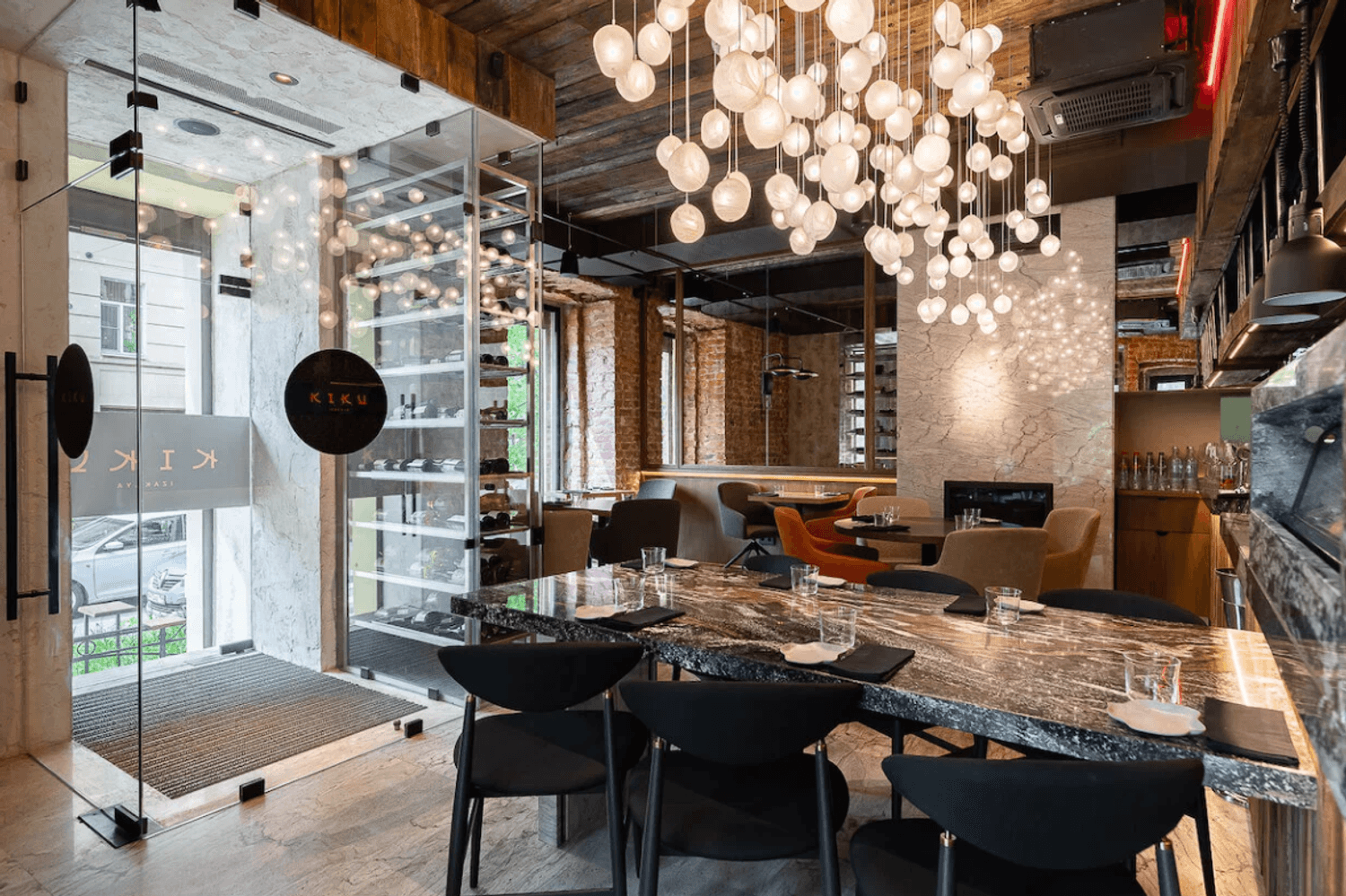 Интерьер "Kiku Izakaya" — это небольшой, но невероятно стильный уголок, оформленный дизайнером Ксенией Смирновой. Гранит, амбарная доска и матовые стеклянные лампы создают атмосферу, в которой хочется задержаться . Потолок с сотней шариков-ламп напоминает цветущую сакуру — а это уже детали, которые делают этот ресторан особенным.