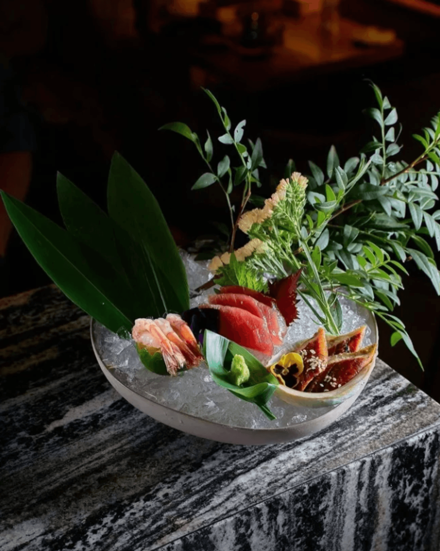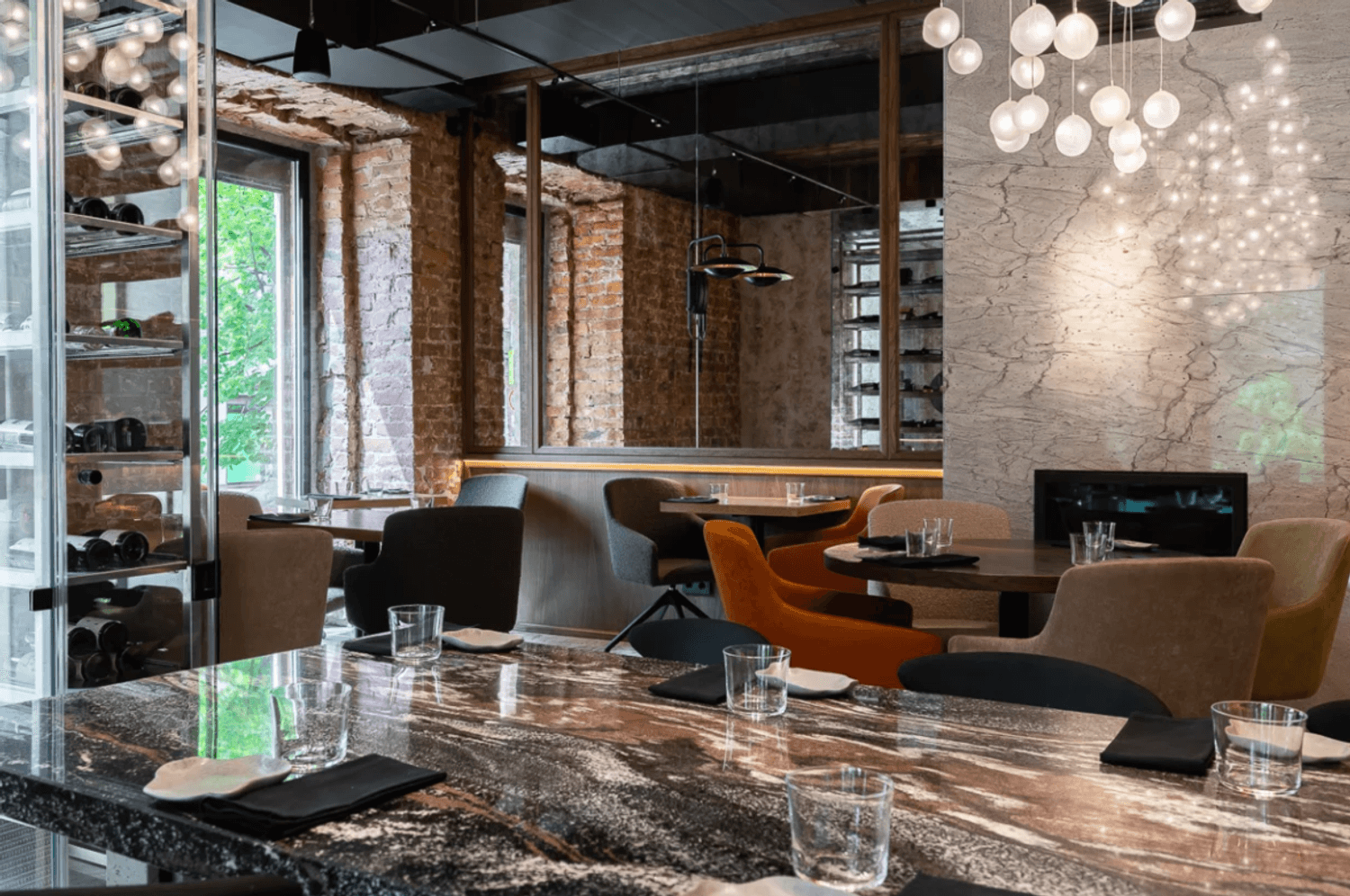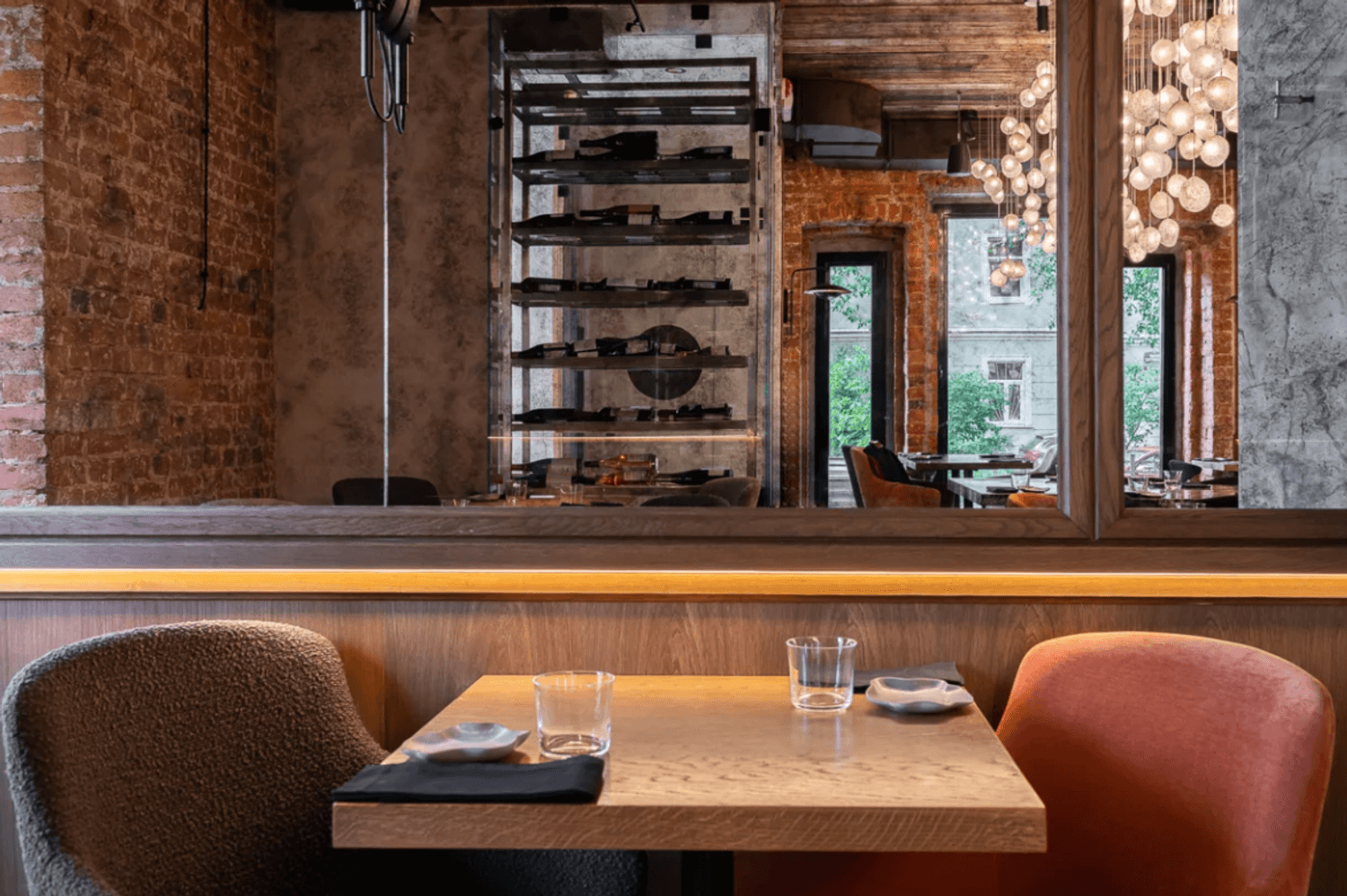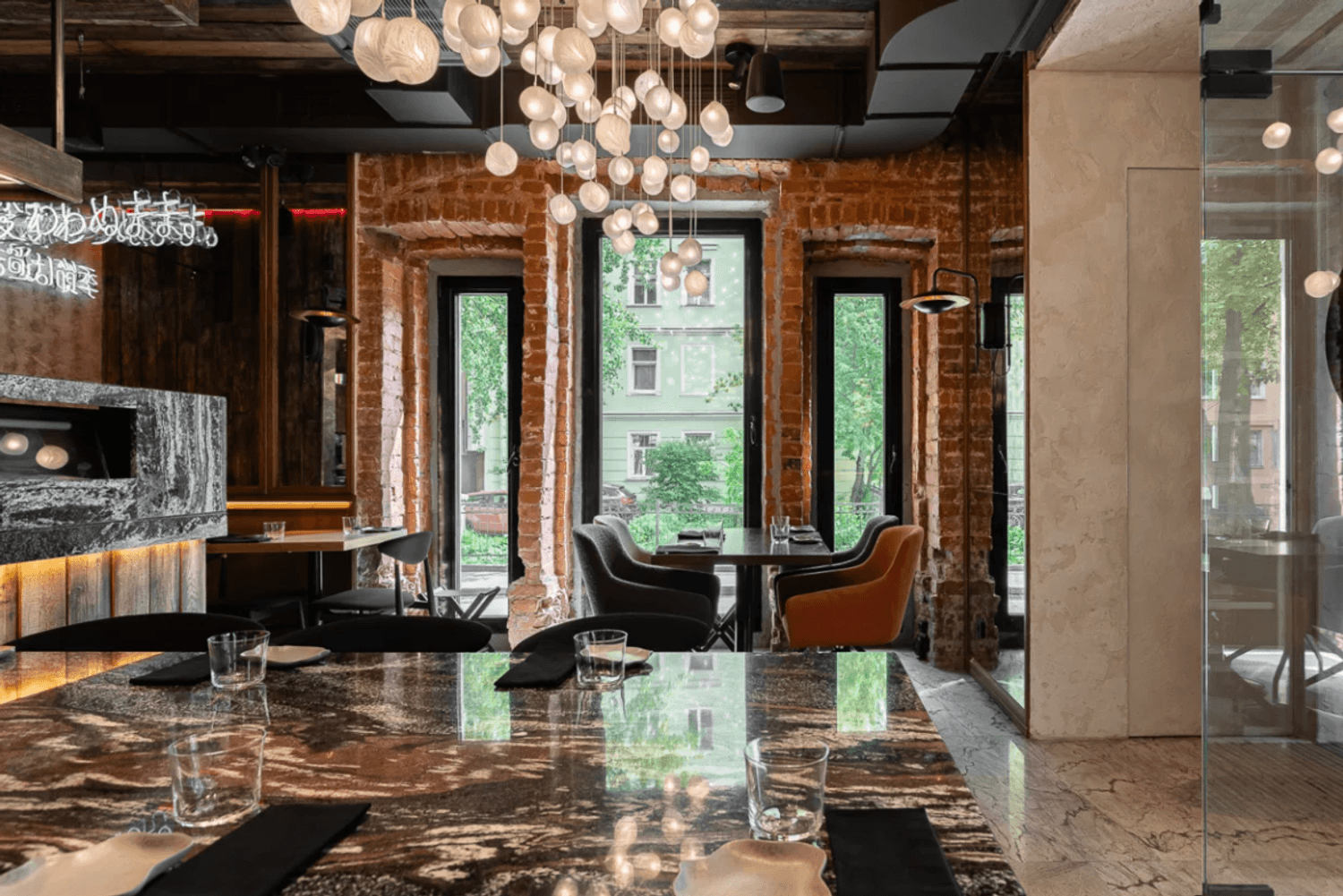 Интерьер "Kiku Izakaya" — это небольшой, но невероятно стильный уголок, оформленный дизайнером Ксенией Смирновой. Гранит, амбарная доска и матовые стеклянные лампы создают атмосферу, в которой хочется задержаться . Потолок с сотней шариков-ламп напоминает цветущую сакуру — а это уже детали, которые делают этот ресторан особенным.