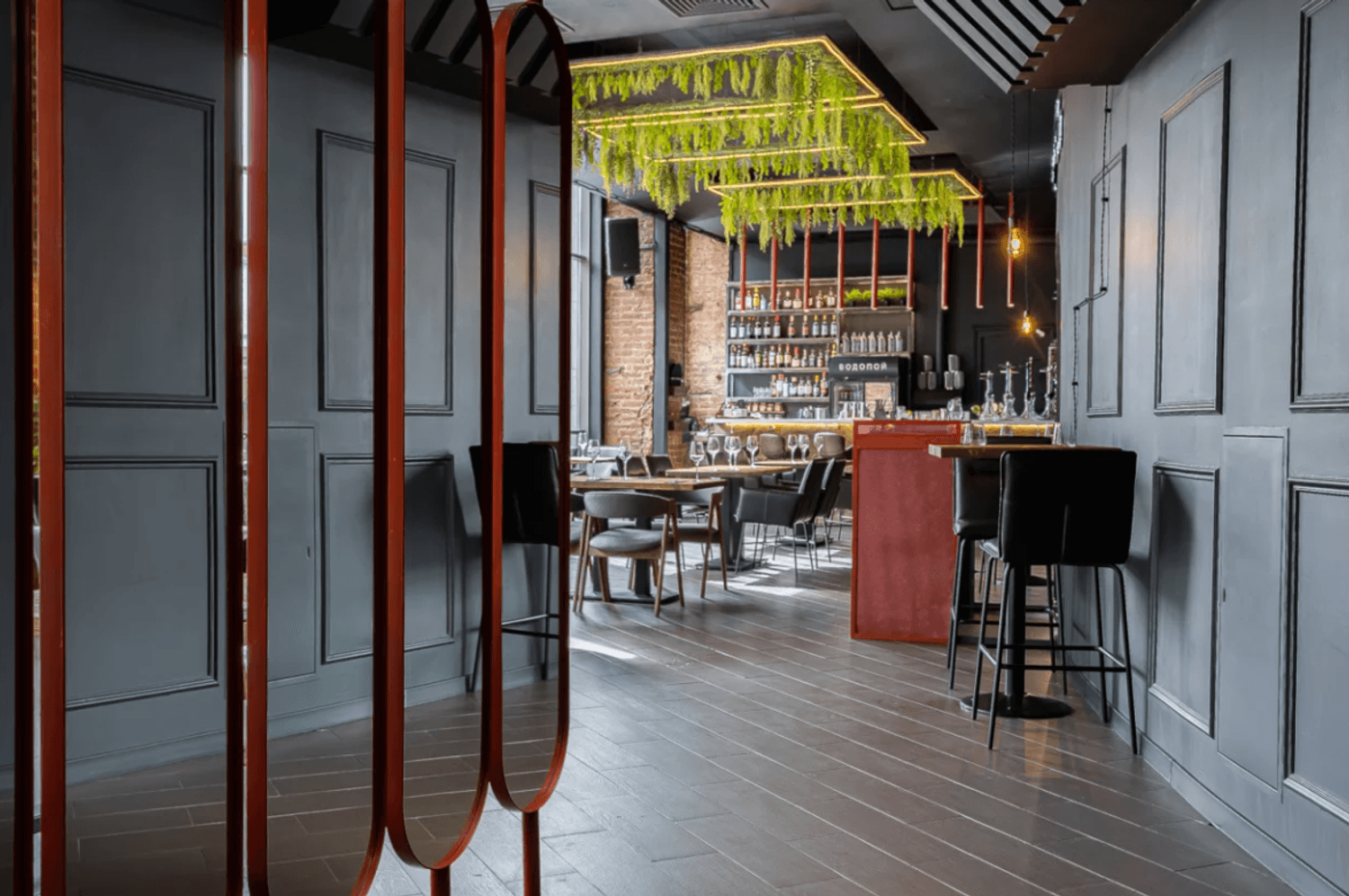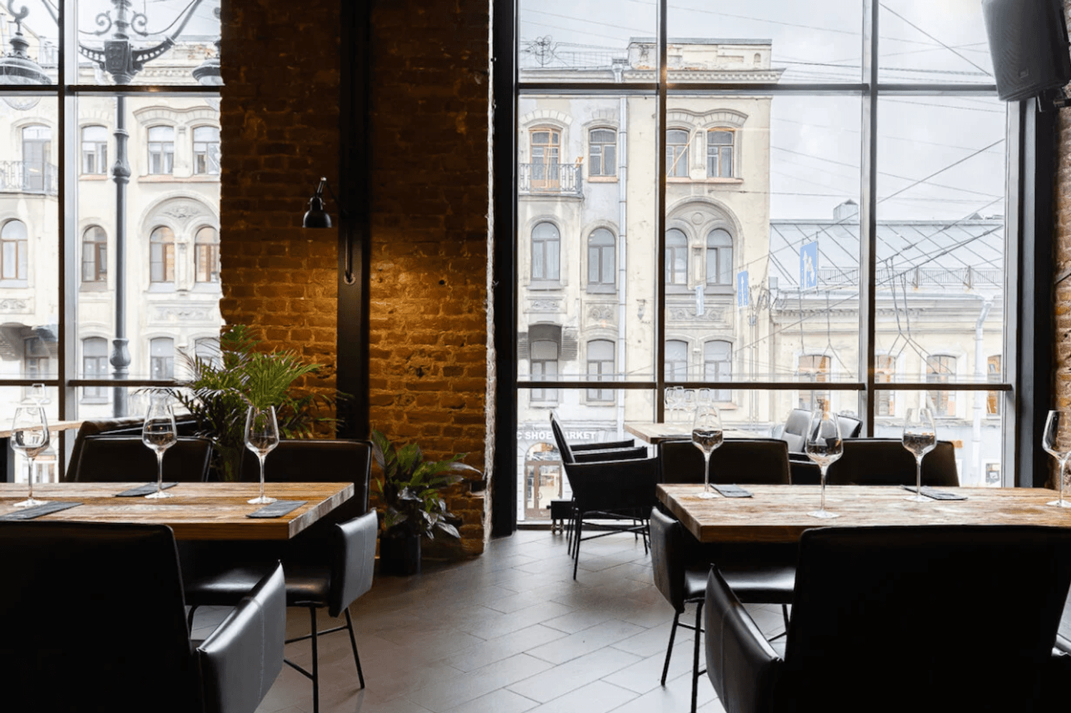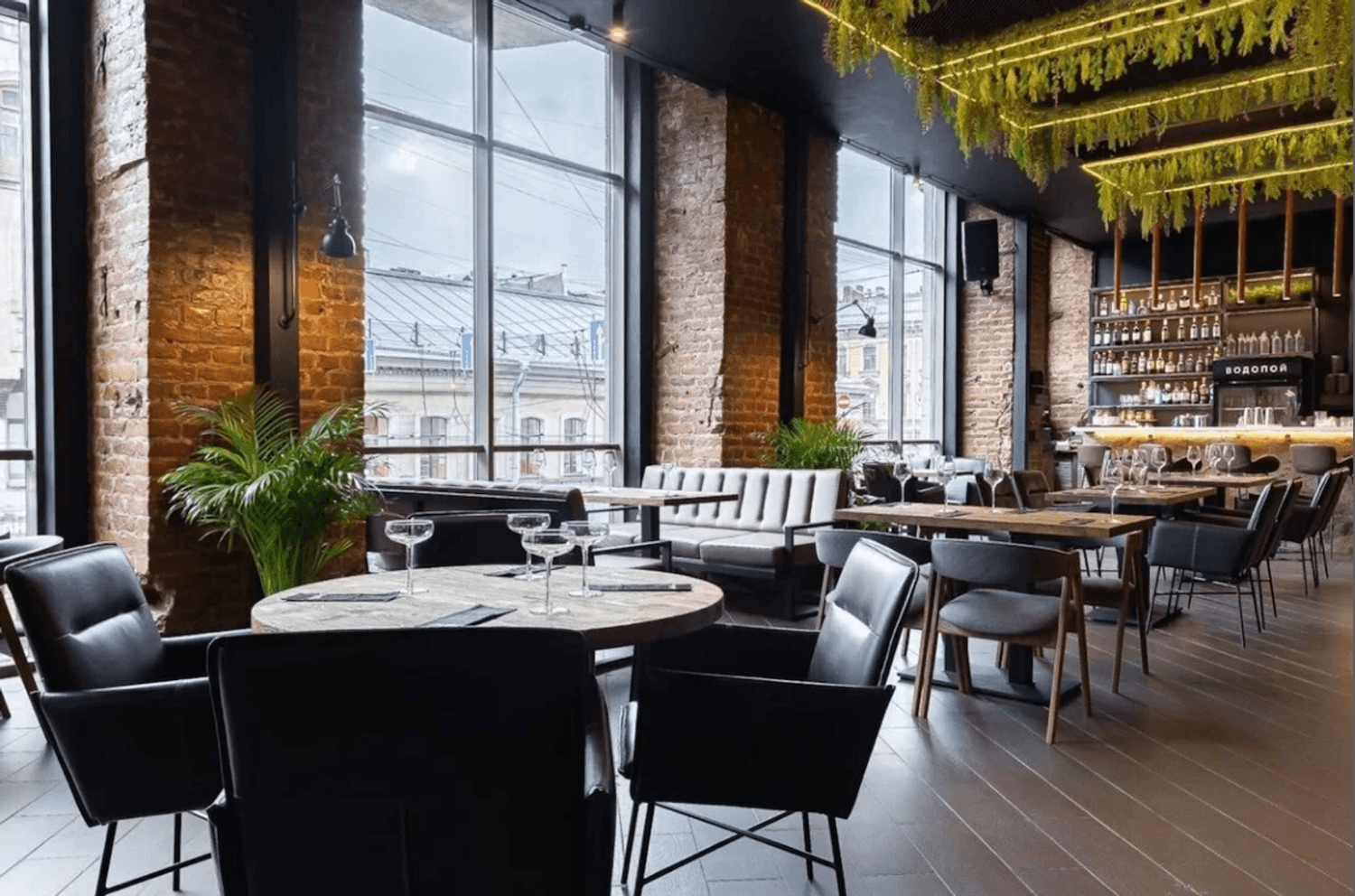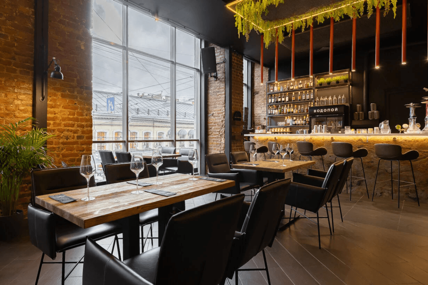 Атмосфера. Пространство с высокими потолками, кирпичными стенами и панорамными окнами смотрится особенно эффектно и индустриально на фоне исторической застройки за окном. Минималистичная мебель в темных тонах, живые растения и ироничные панно формируют комфортную среду для любого типа отдыха — от работы за ноутбуком до вечерних диджей-сетов.