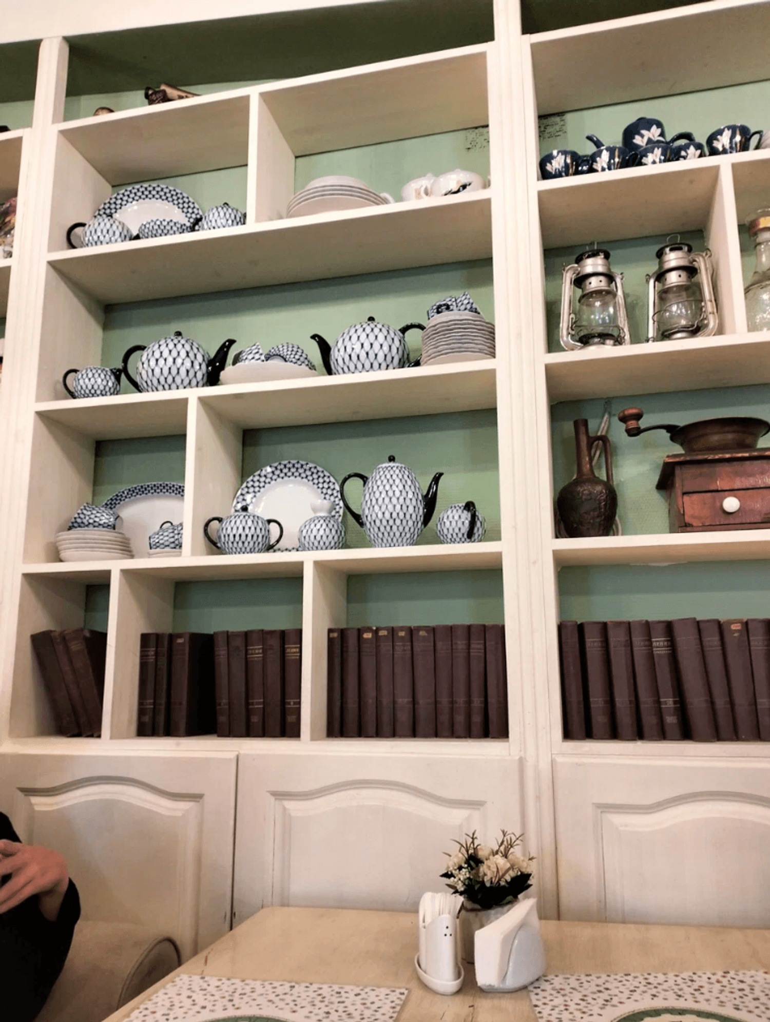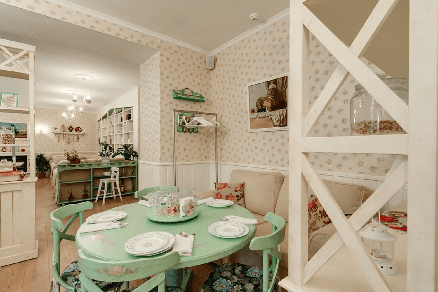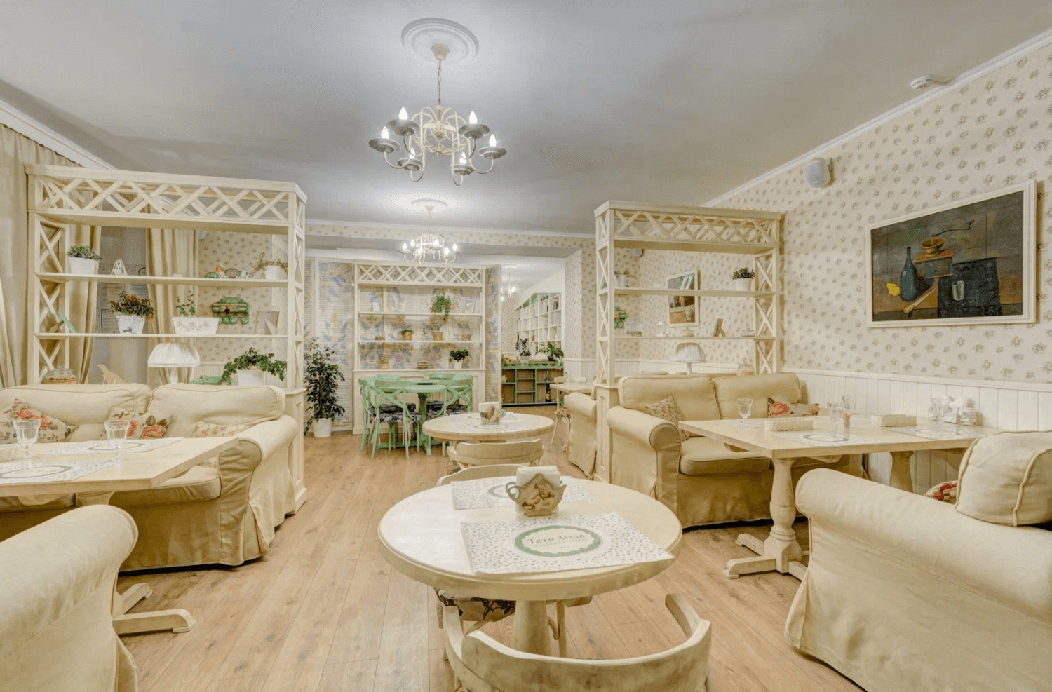 Атмосфера. Интерьер ресторана выполнен в духе прованса, с акцентом на загородную атмосферу. Большие окна и зеркала наполняют пространство светом, а уютные диваны и картины на стенах дополняют обстановку.