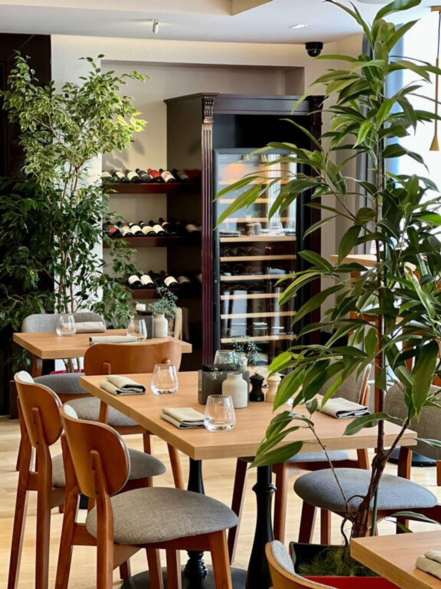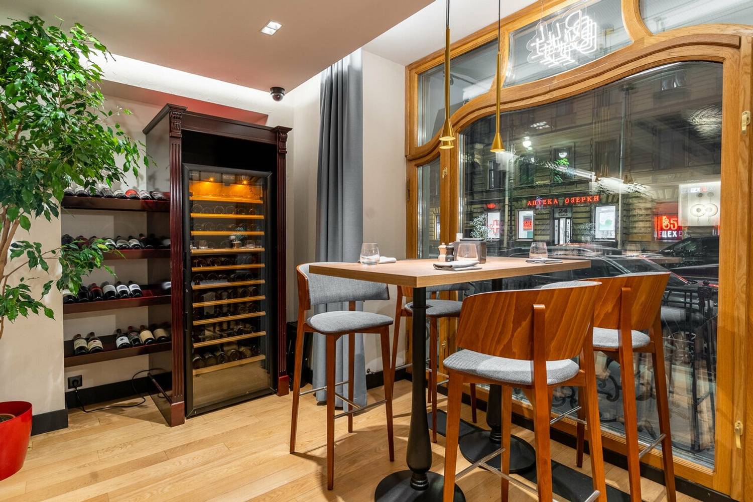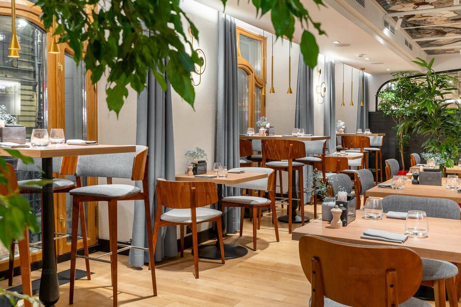 Атмосфера. Дизайн в стиле европейский модерн: витражные потолки с цветочными мотивами, высокие окна с серыми шторами и золотые люстры. В зале стоят деревянные шкафы с винной коллекцией, а на стенах — прямоугольные зеркала в рамах.