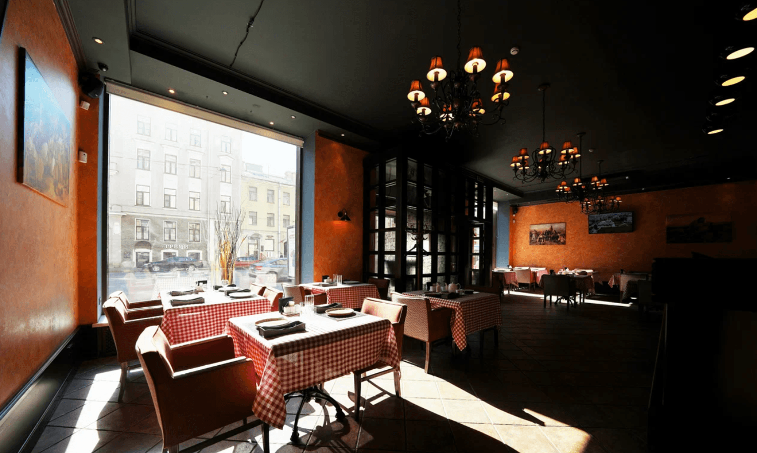 Атмосфера. Интерьер вдохновлен кантри-кафе в маленьких сербских городах: красно-клетчатые скатерти, картины на историческую тему, большие окна. Пространство одновременно создает уют и непринужденный настрой.