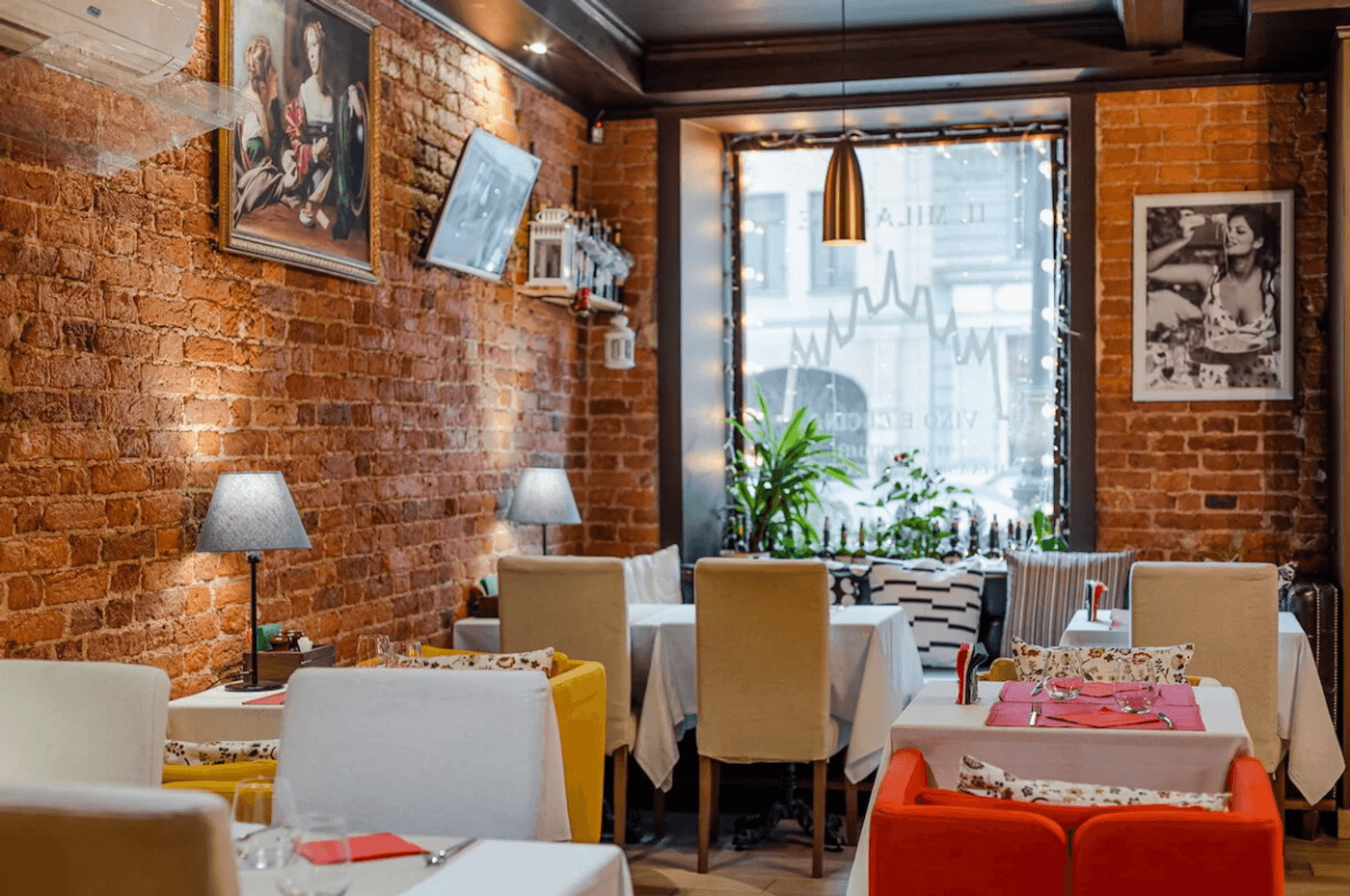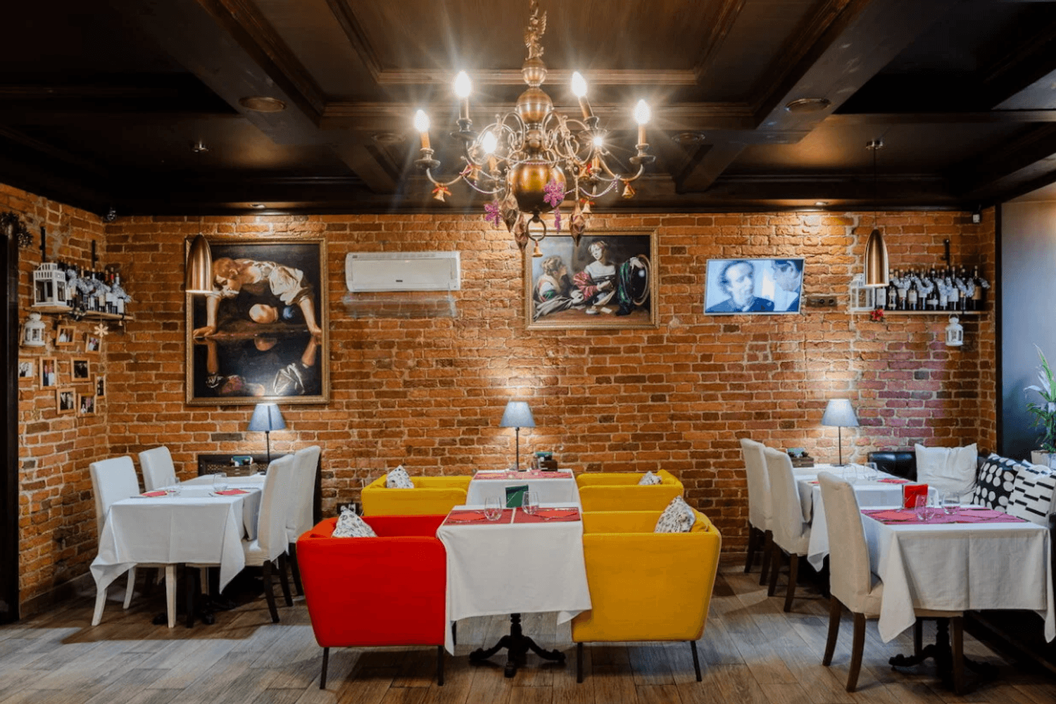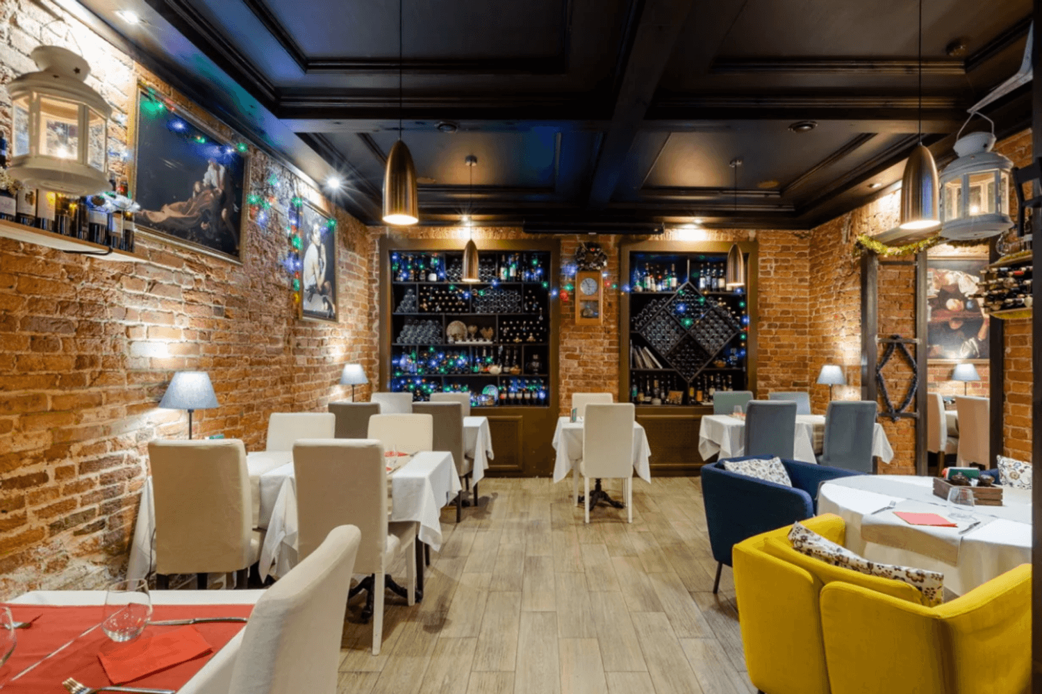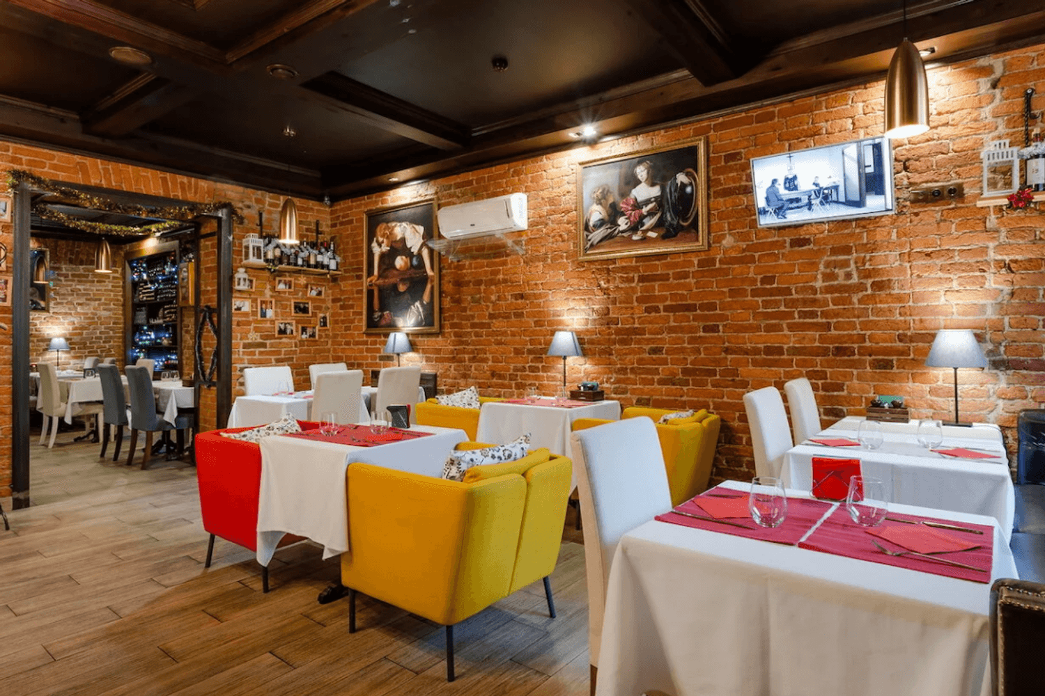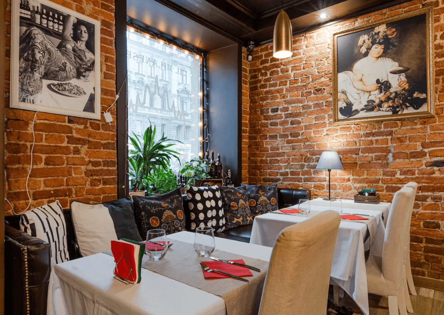 Атмосфера. Ресторан с репродукциями Караваджо, итальянской музыкой и теплой обстановкой переносит гостей в Милан. В шкафах сделали полки в форме ромбов и заполнили их бутылками вина, а на мягких креслах можно увидеть декоративные подушки с украшениями.
