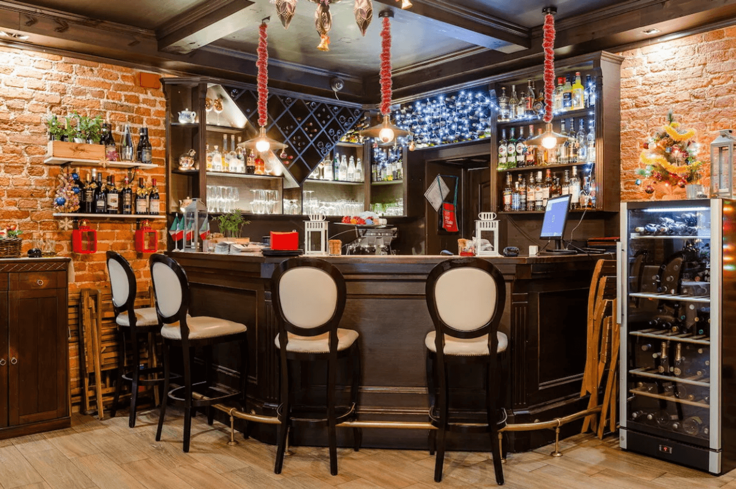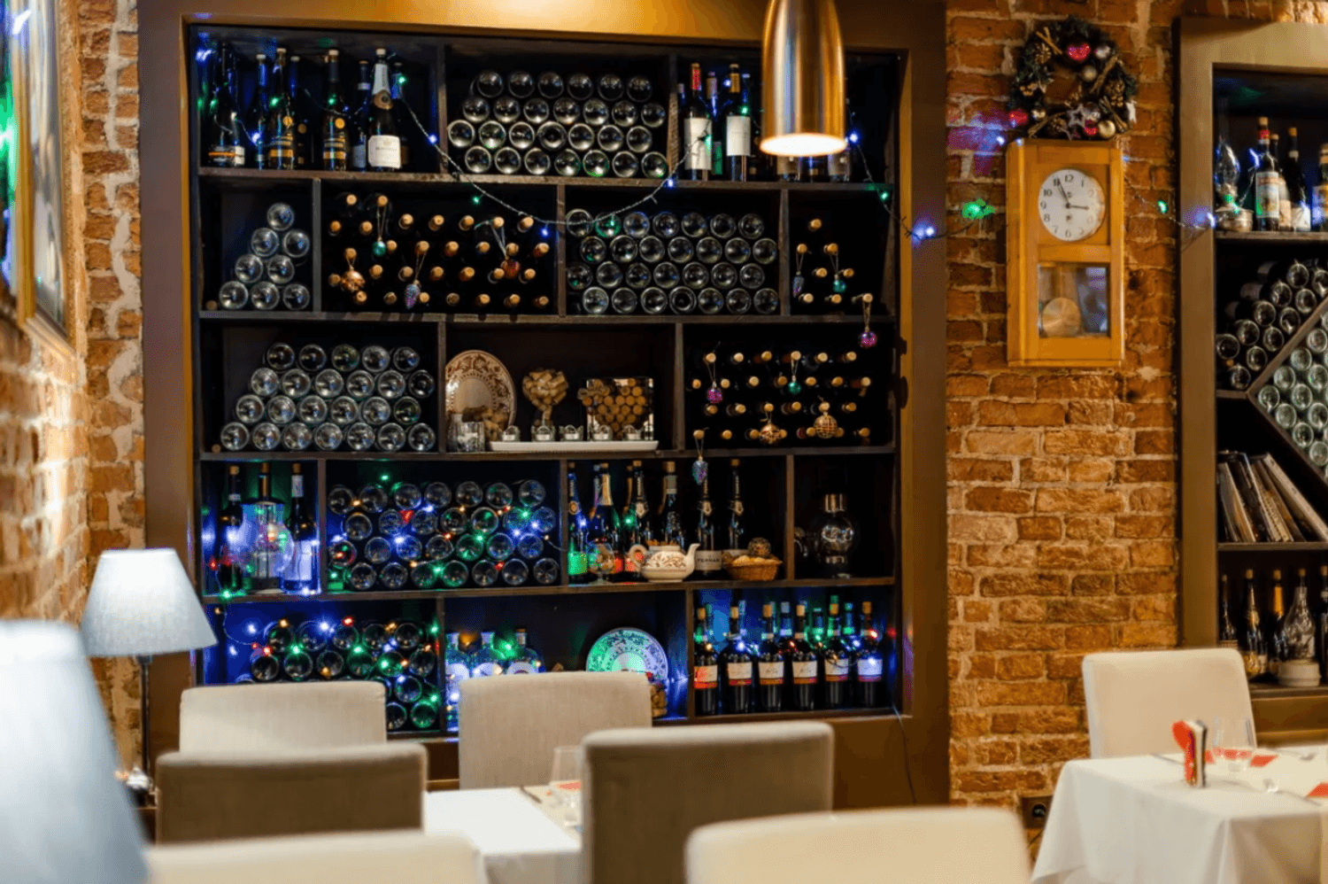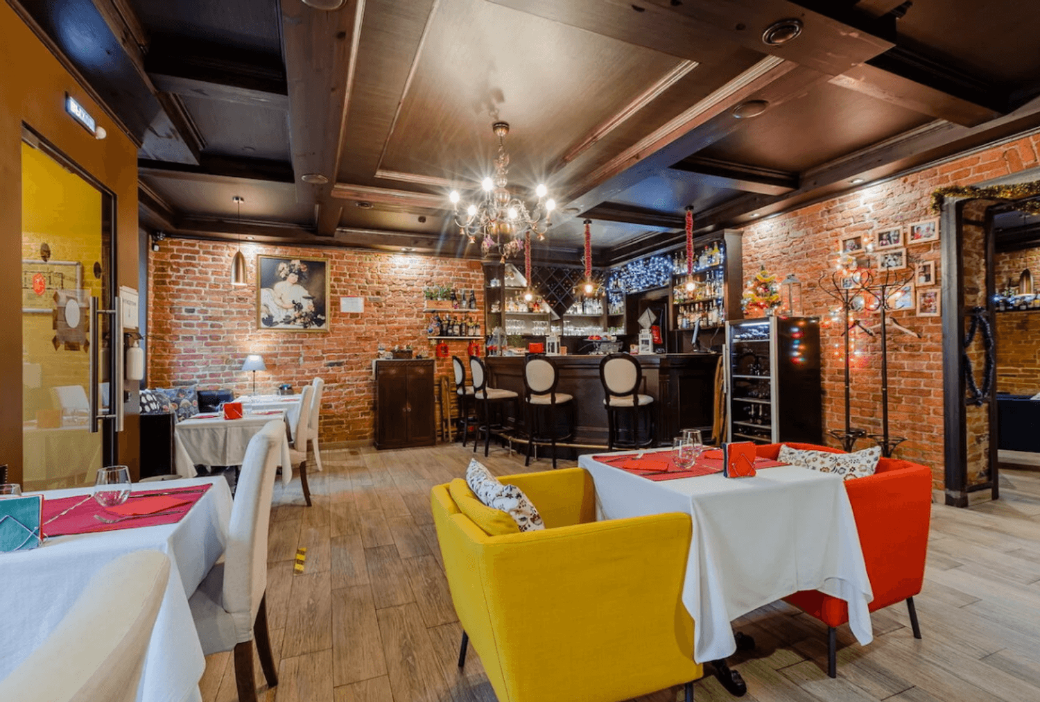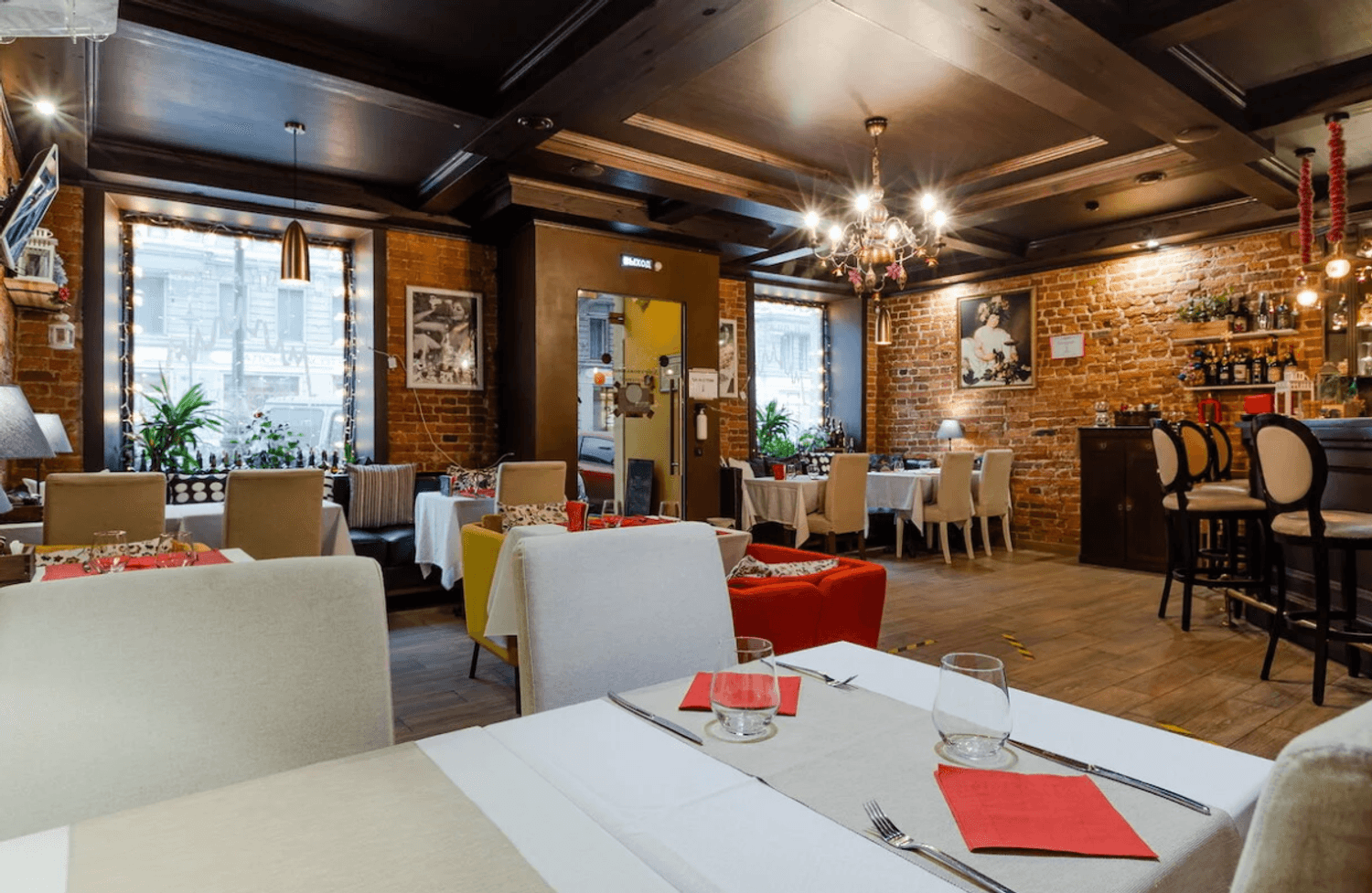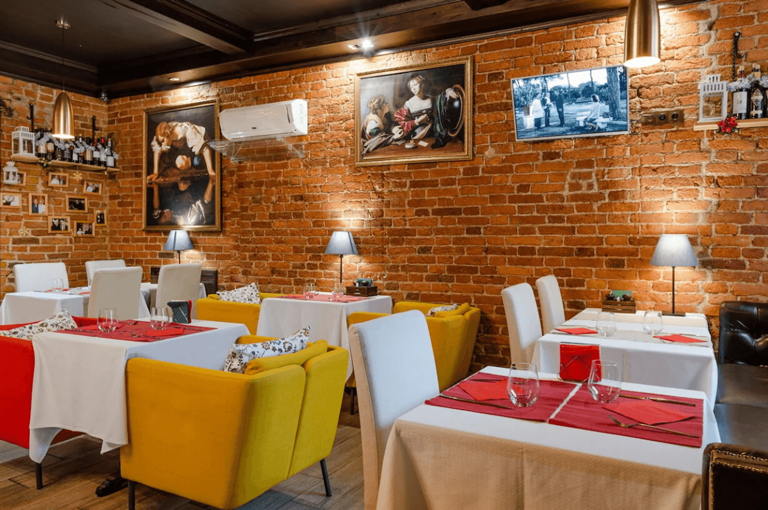 Атмосфера. Ресторан с репродукциями Караваджо, итальянской музыкой и теплой обстановкой переносит гостей в Милан. В шкафах сделали полки в форме ромбов и заполнили их бутылками вина, а на мягких креслах можно увидеть декоративные подушки с украшениями.