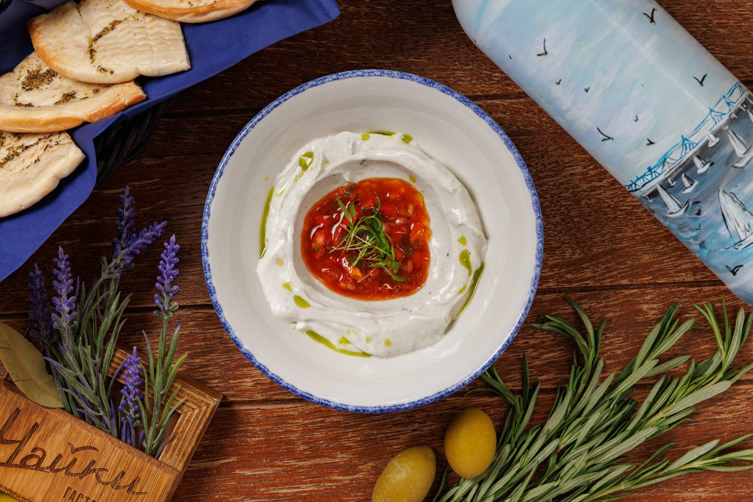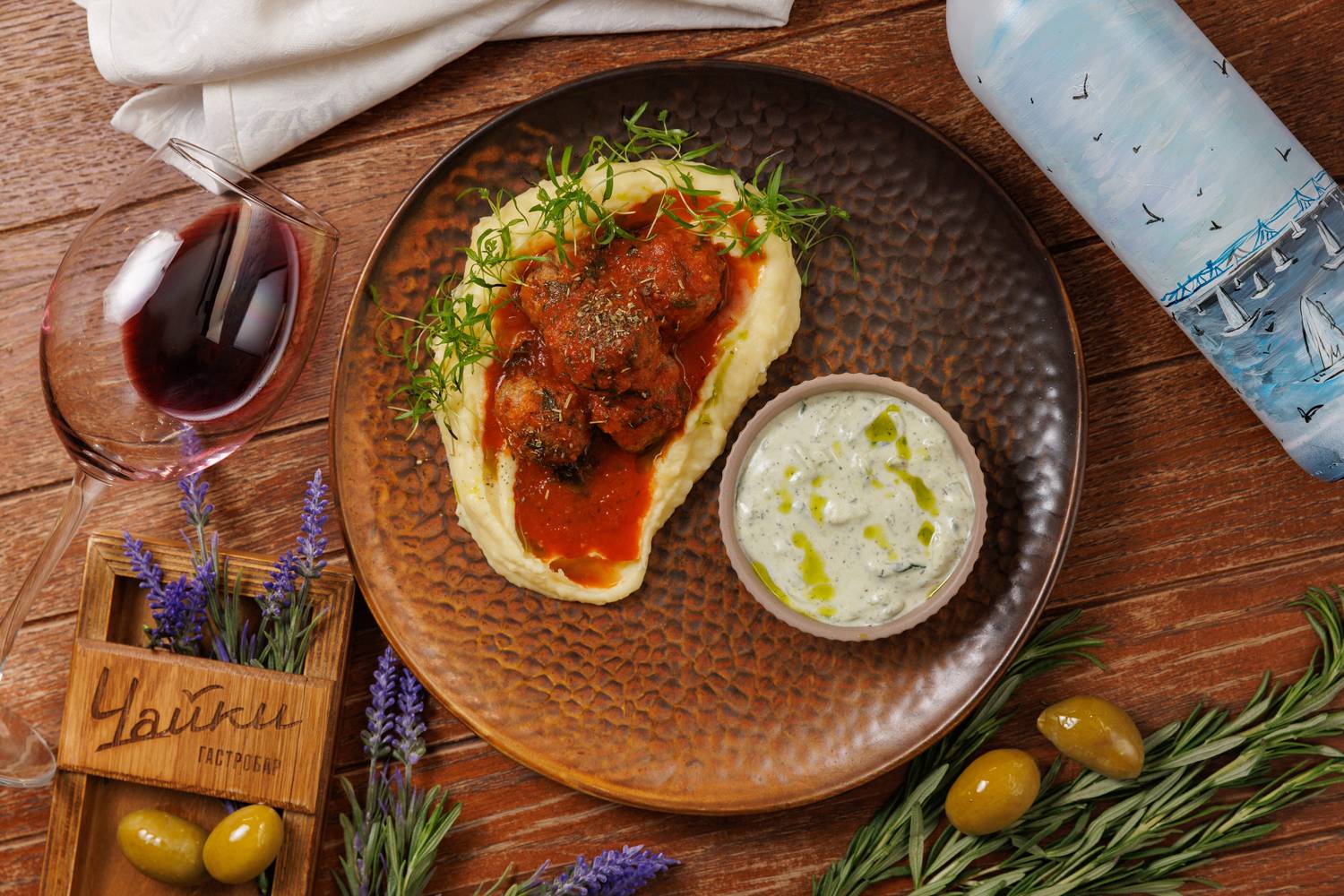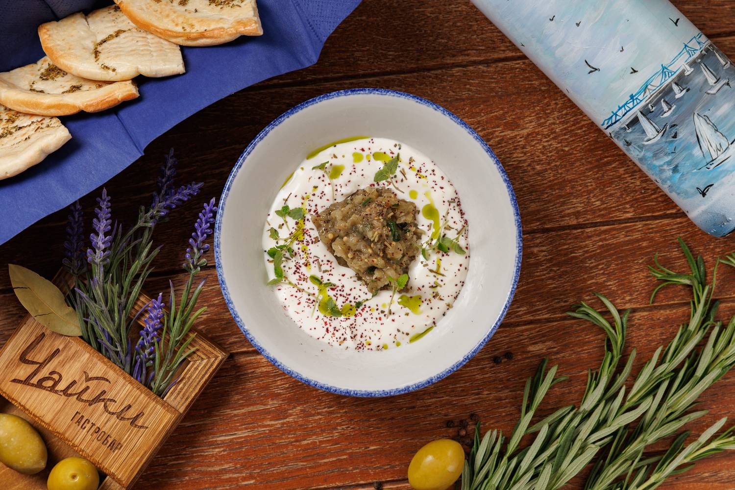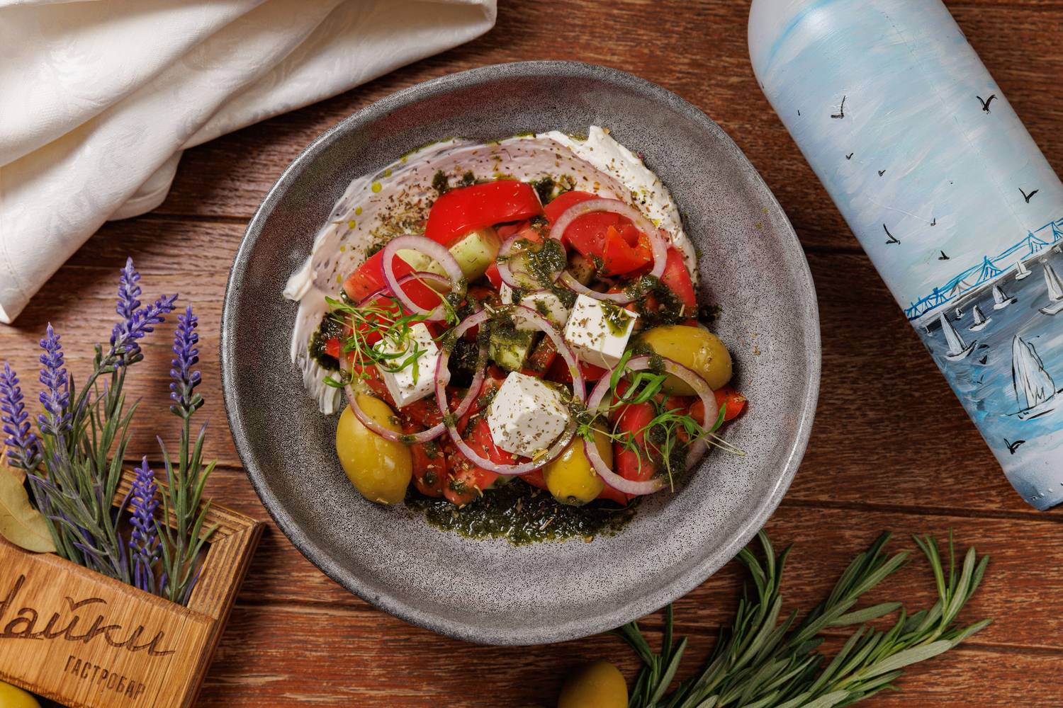 Еда и напитки. В меню представлены в основном блюда греческой кухни, но с авторским видением шефа. Есть брускетты с красным песто, тартары, утиная грудка с яблочным пюре и стейк из форели в медово-острой глазури. На десерт можно взять банановый торт или бланманже из ряженки. По будням действуют бизнес-ланчи, а в баре предлагают авторские напитки.