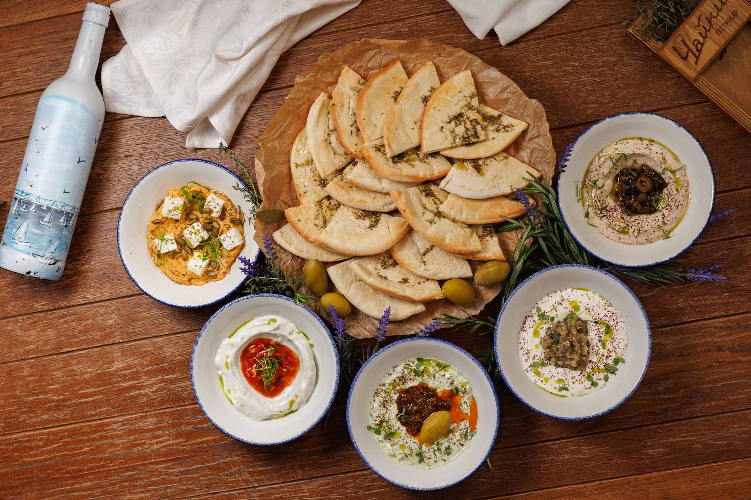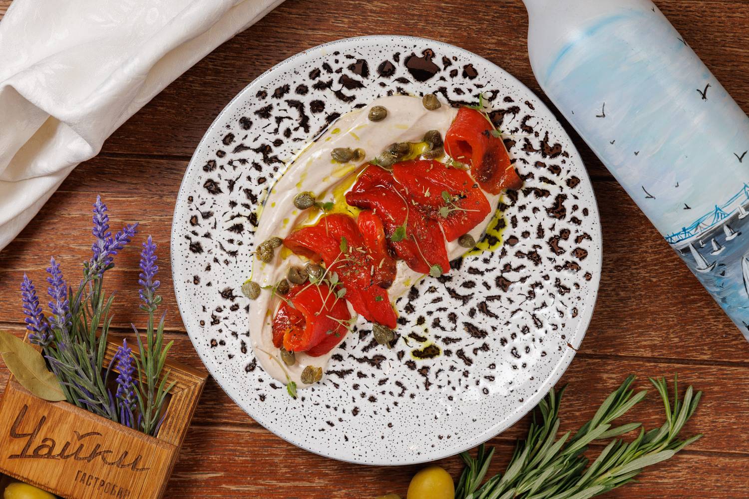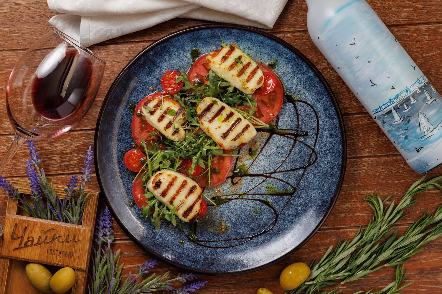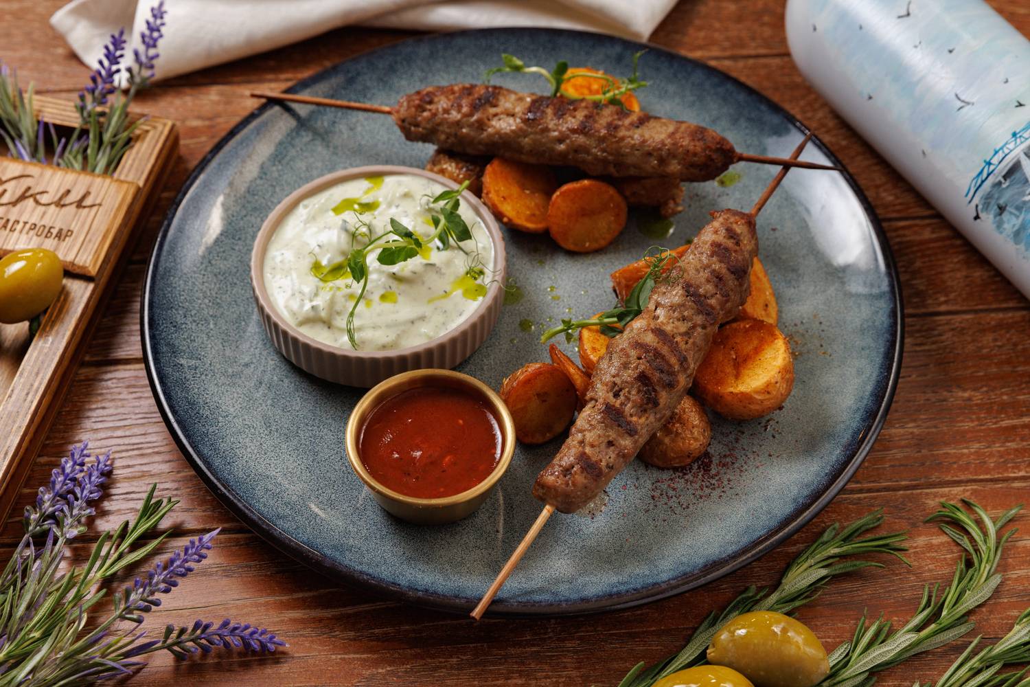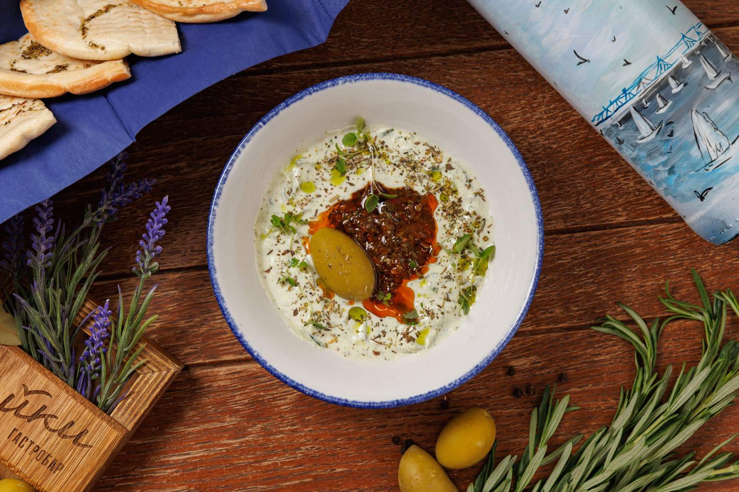 Еда и напитки. В меню представлены в основном блюда греческой кухни, но с авторским видением шефа. Есть брускетты с красным песто, тартары, утиная грудка с яблочным пюре и стейк из форели в медово-острой глазури. На десерт можно взять банановый торт или бланманже из ряженки. По будням действуют бизнес-ланчи, а в баре предлагают авторские напитки.