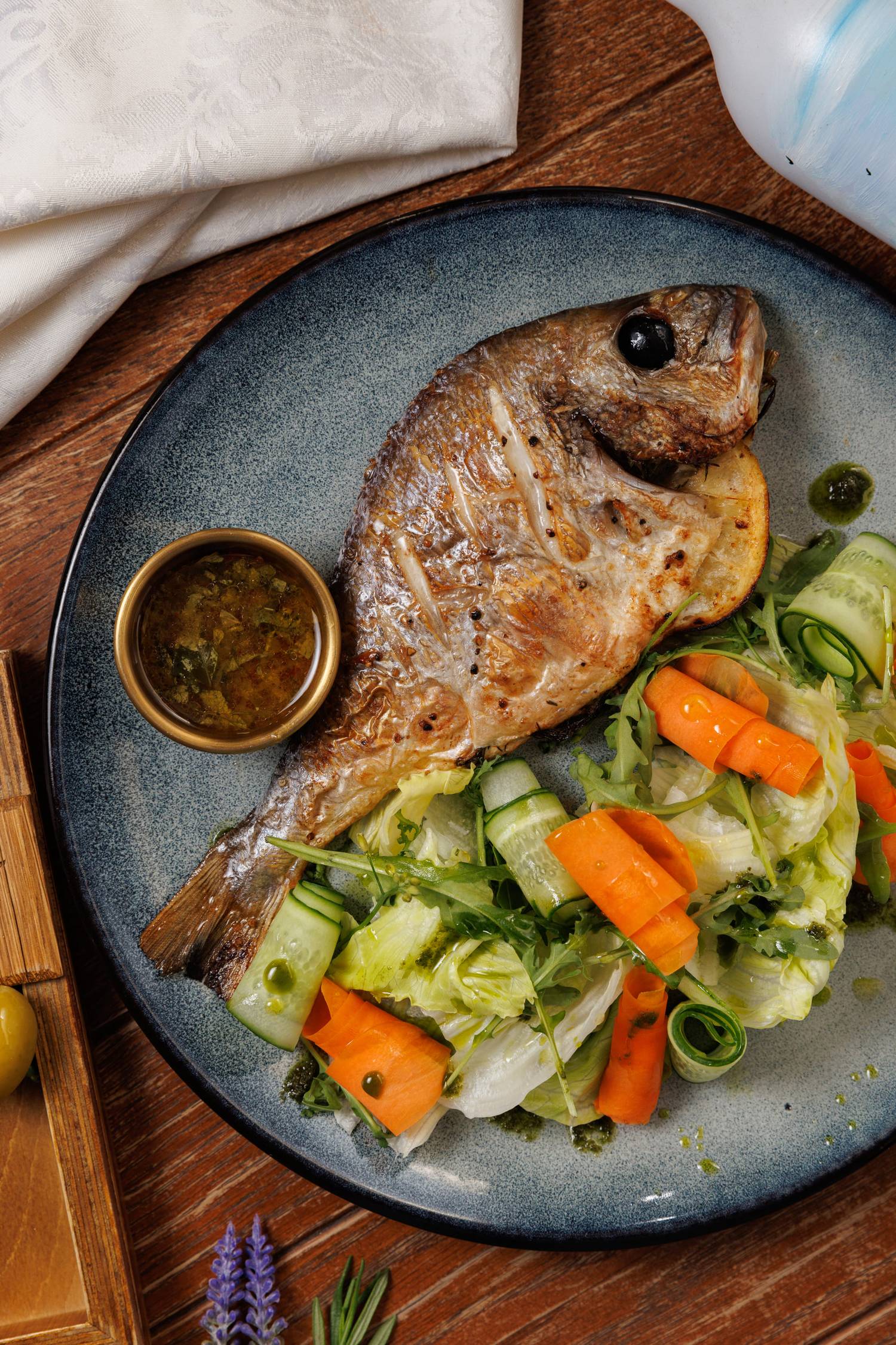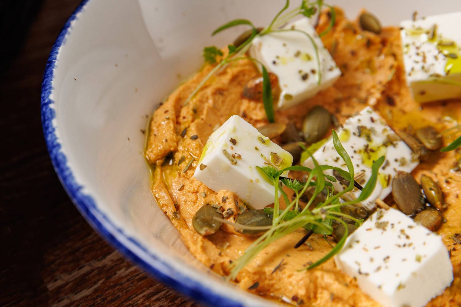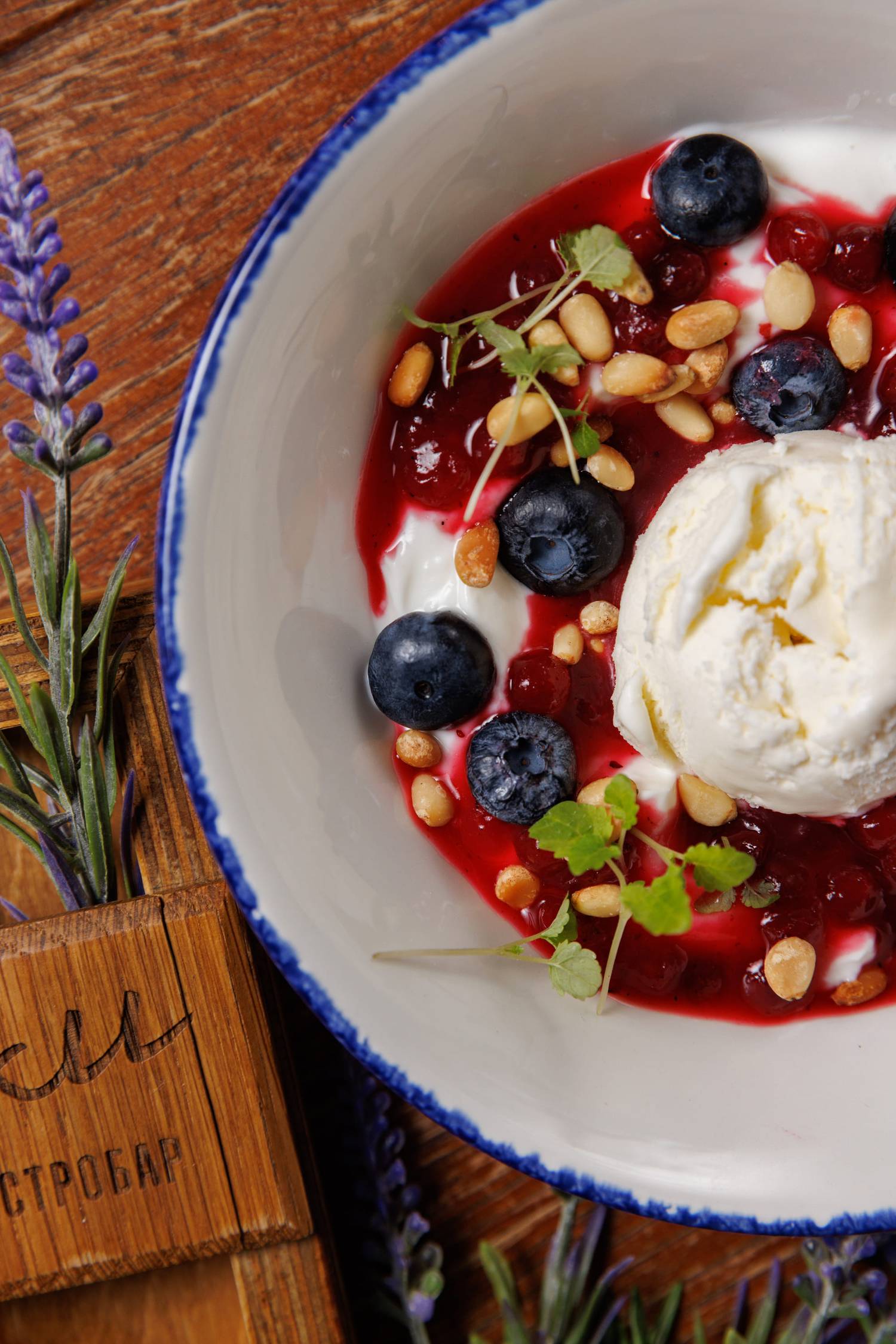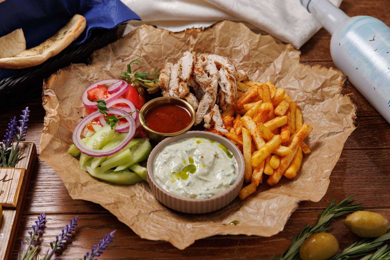 Еда и напитки. В меню представлены в основном блюда греческой кухни, но с авторским видением шефа. Есть брускетты с красным песто, тартары, утиная грудка с яблочным пюре и стейк из форели в медово-острой глазури. На десерт можно взять банановый торт или бланманже из ряженки. По будням действуют бизнес-ланчи, а в баре предлагают авторские напитки.