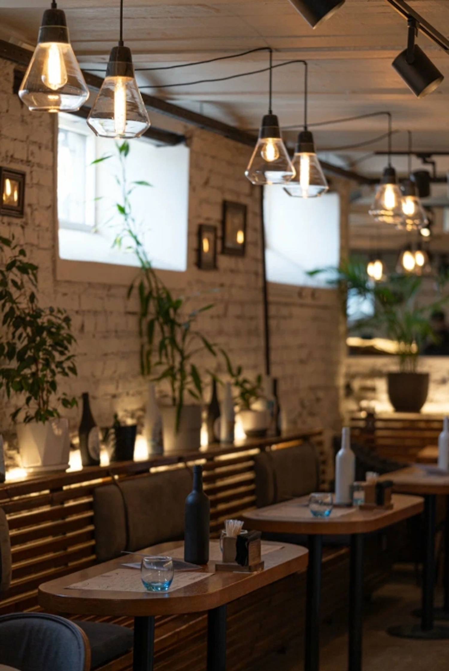 Атмосфера. Пространство в цокольном этаже с белыми кирпичными стенами и фактурной деревянной мебелью сочетает в себе индустриальный шарм и камерный уют. Синие кресла, мягкое освещение и зона с общим столом и небольшими столиками создают многофункциональную среду, подходящую и для романтических свиданий, и для дружеских встреч, и для семейного отдыха. Летом гости могут расположиться на веранде под сенью клена.