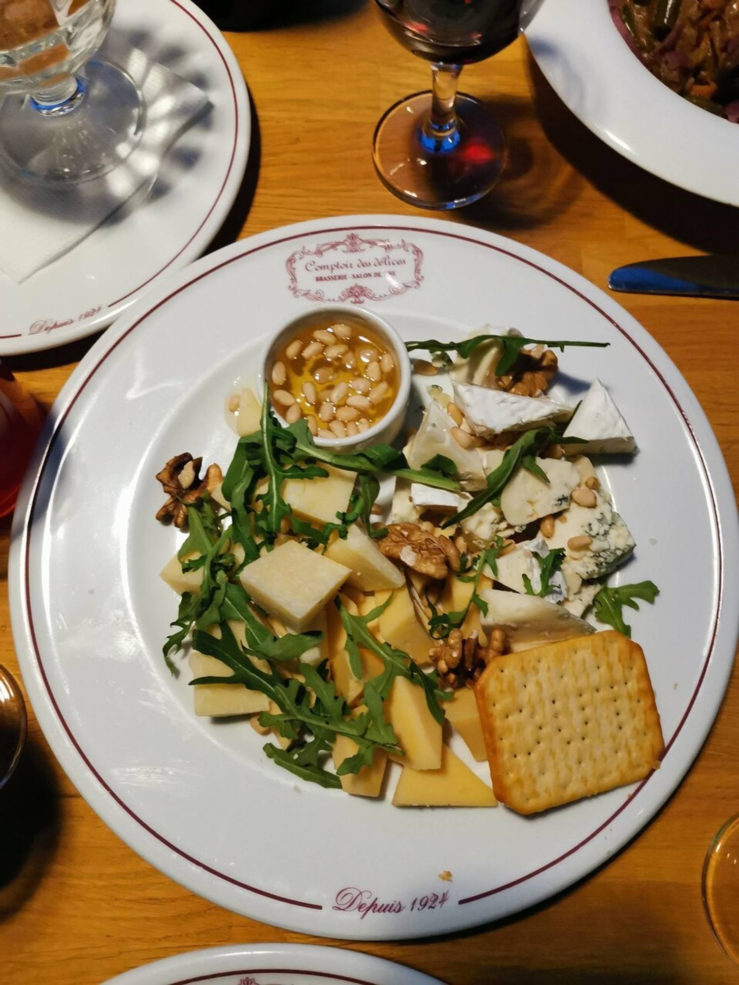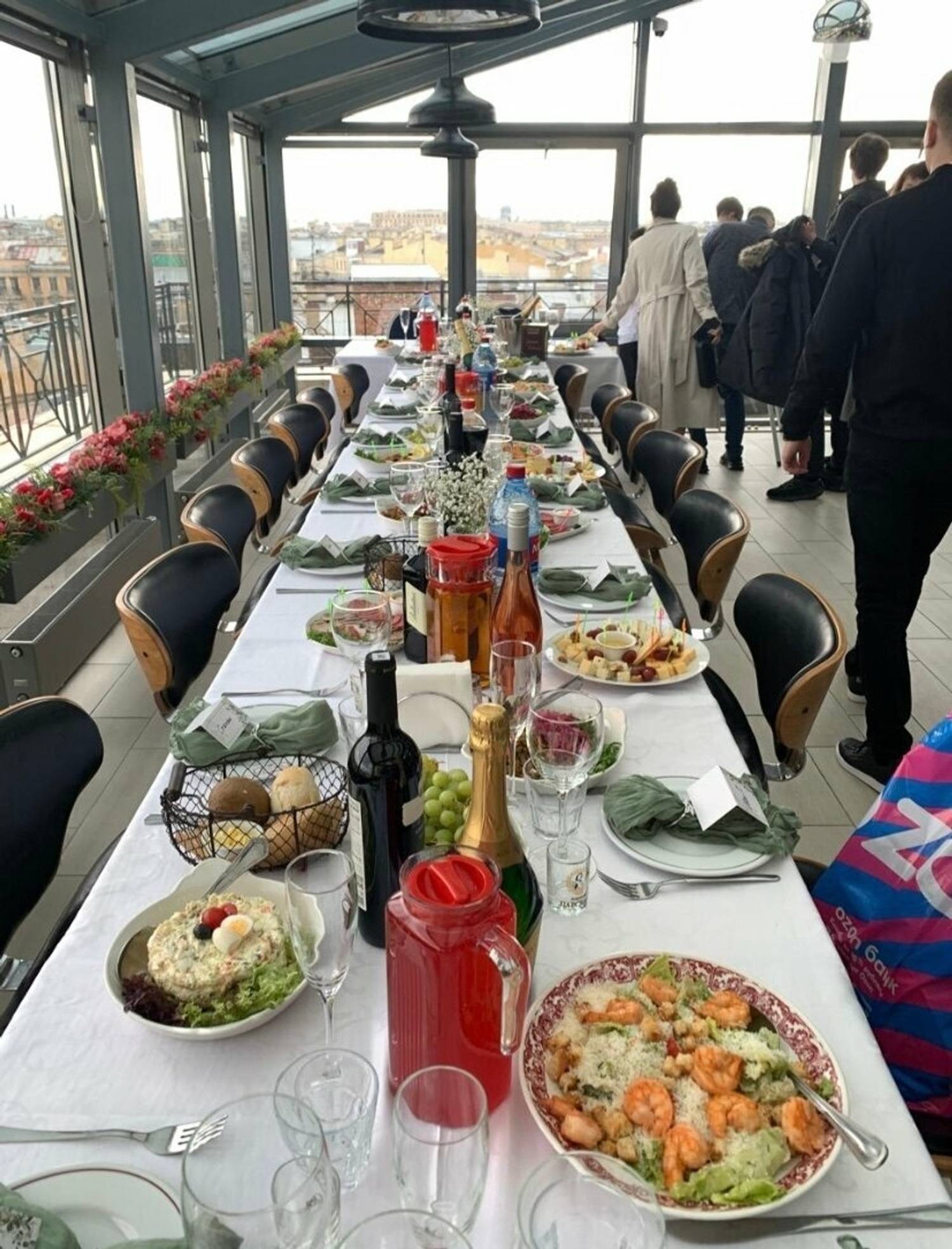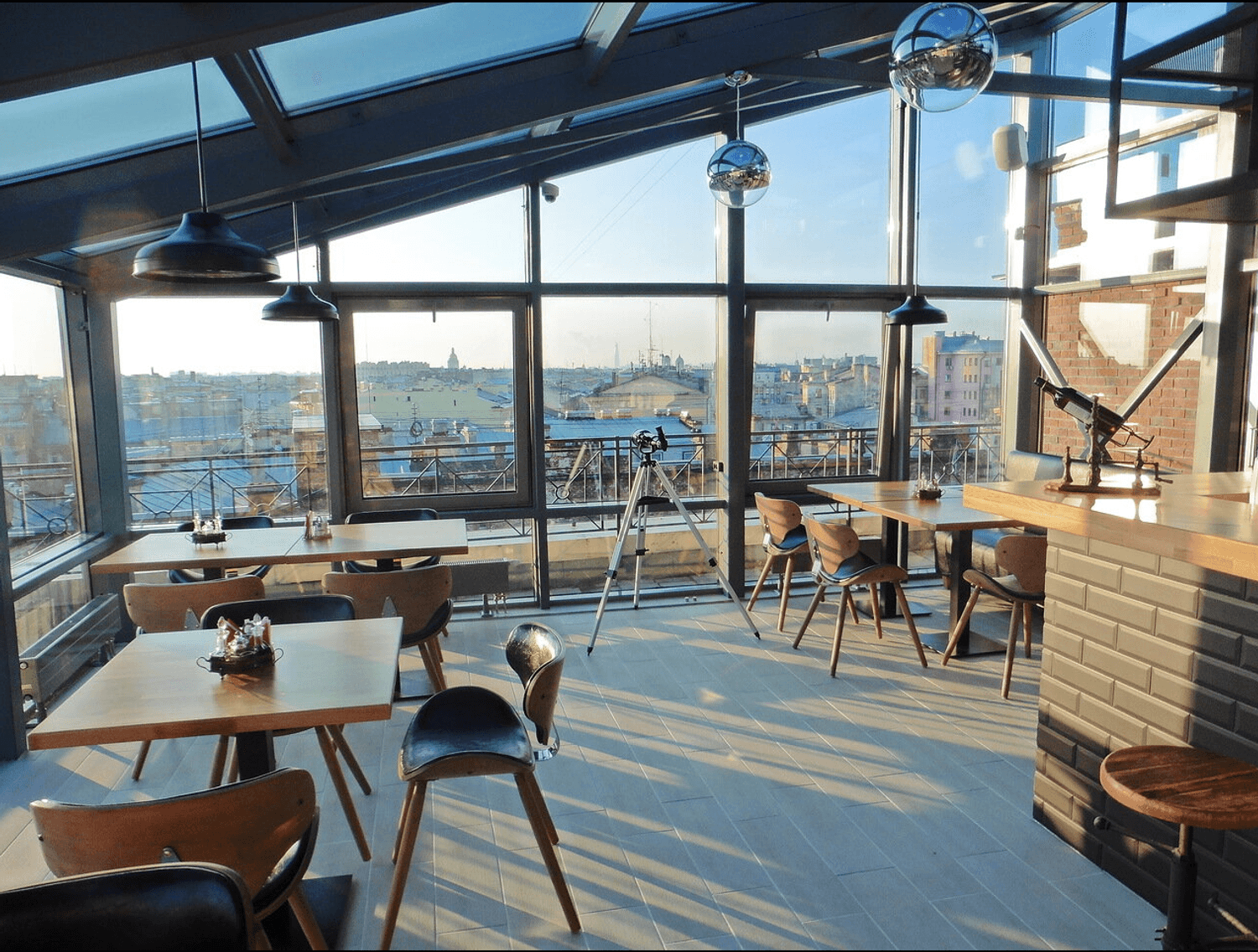 Атмосфера. Интерьер основной части ресторана выполнен в стиле классической брассерии с деревянными панелями, французской мебелью и винтажным декором, а панорамная часть оформлена более лаконично: здесь деревянная мебель и много воздуха. Панорамные окна открывают вид на «старый Петербург», что особенно романтично смотрится в вечерней подсветке.