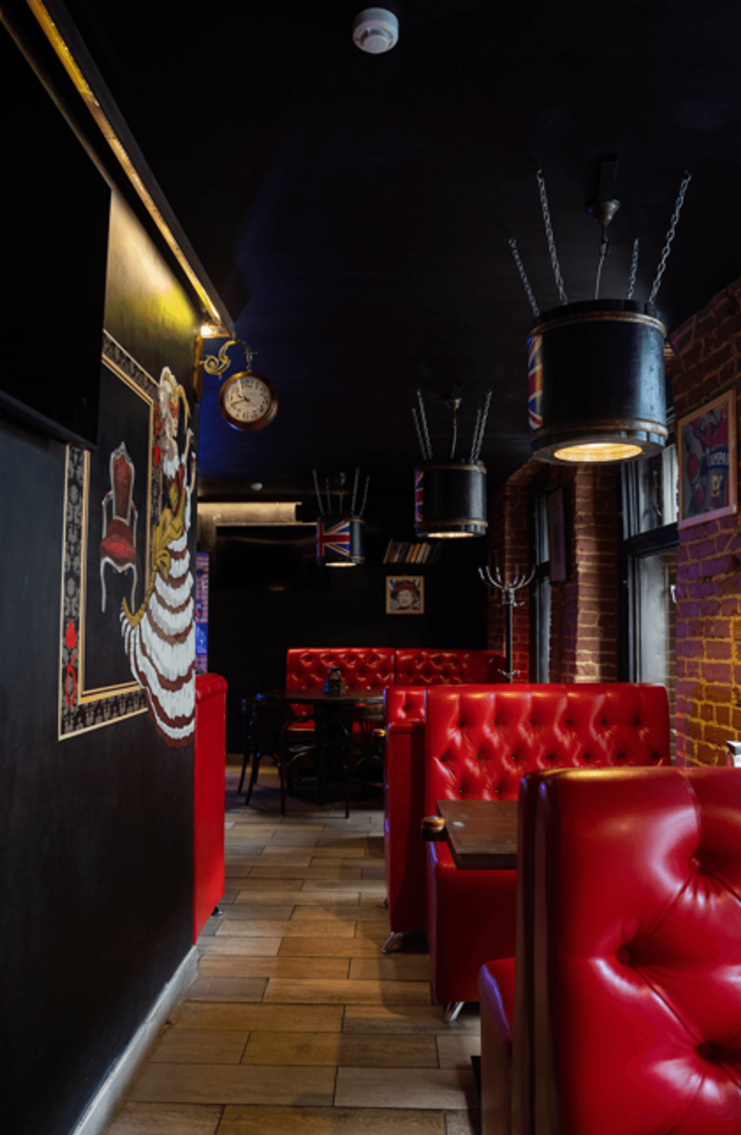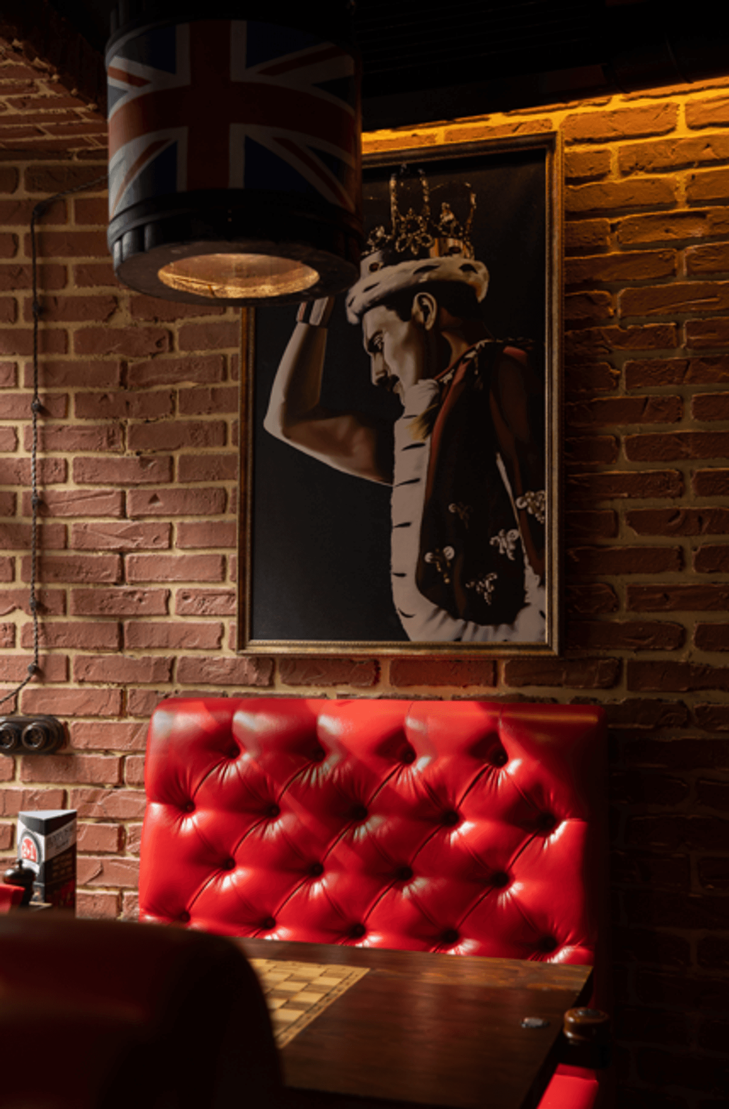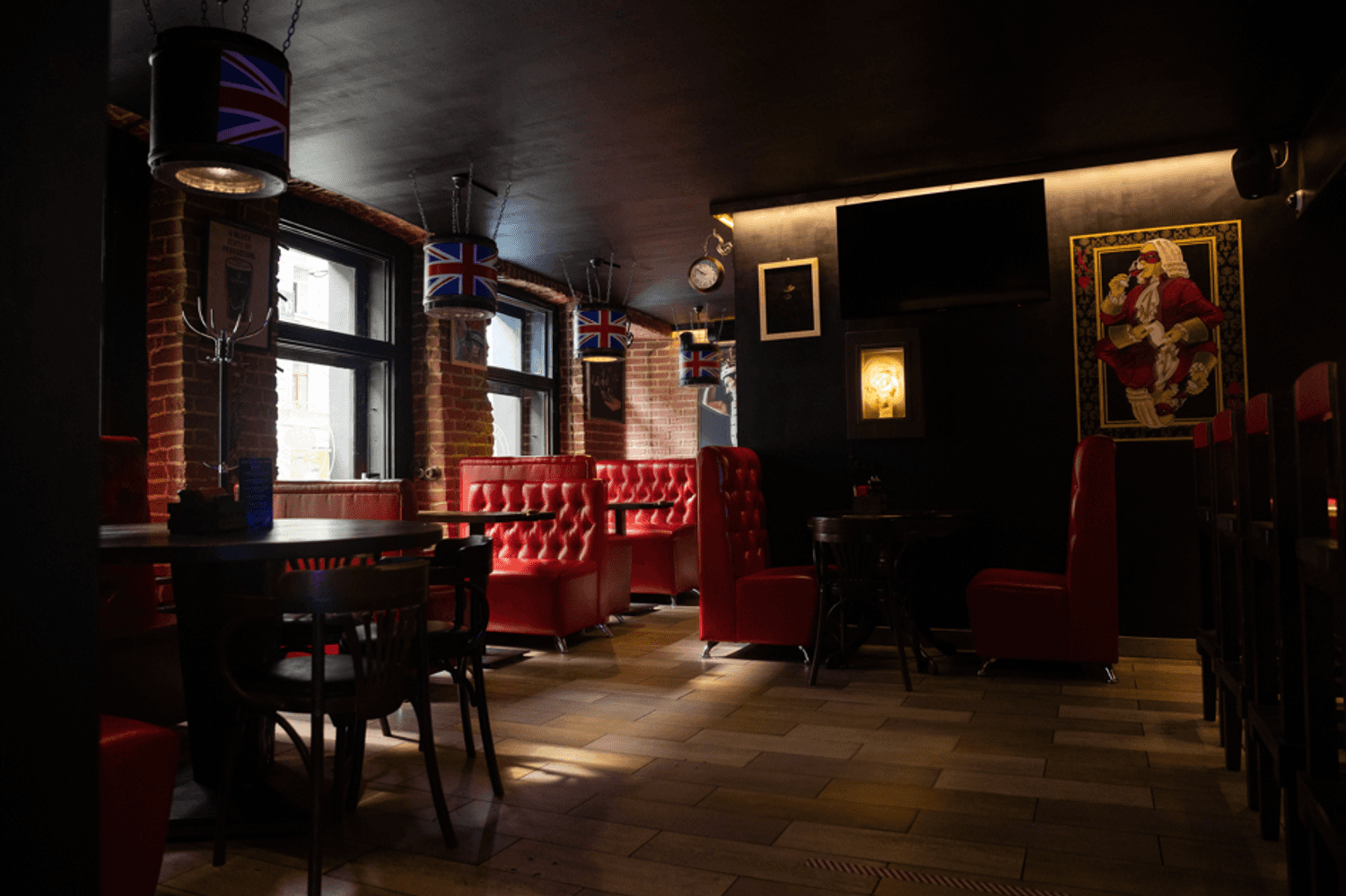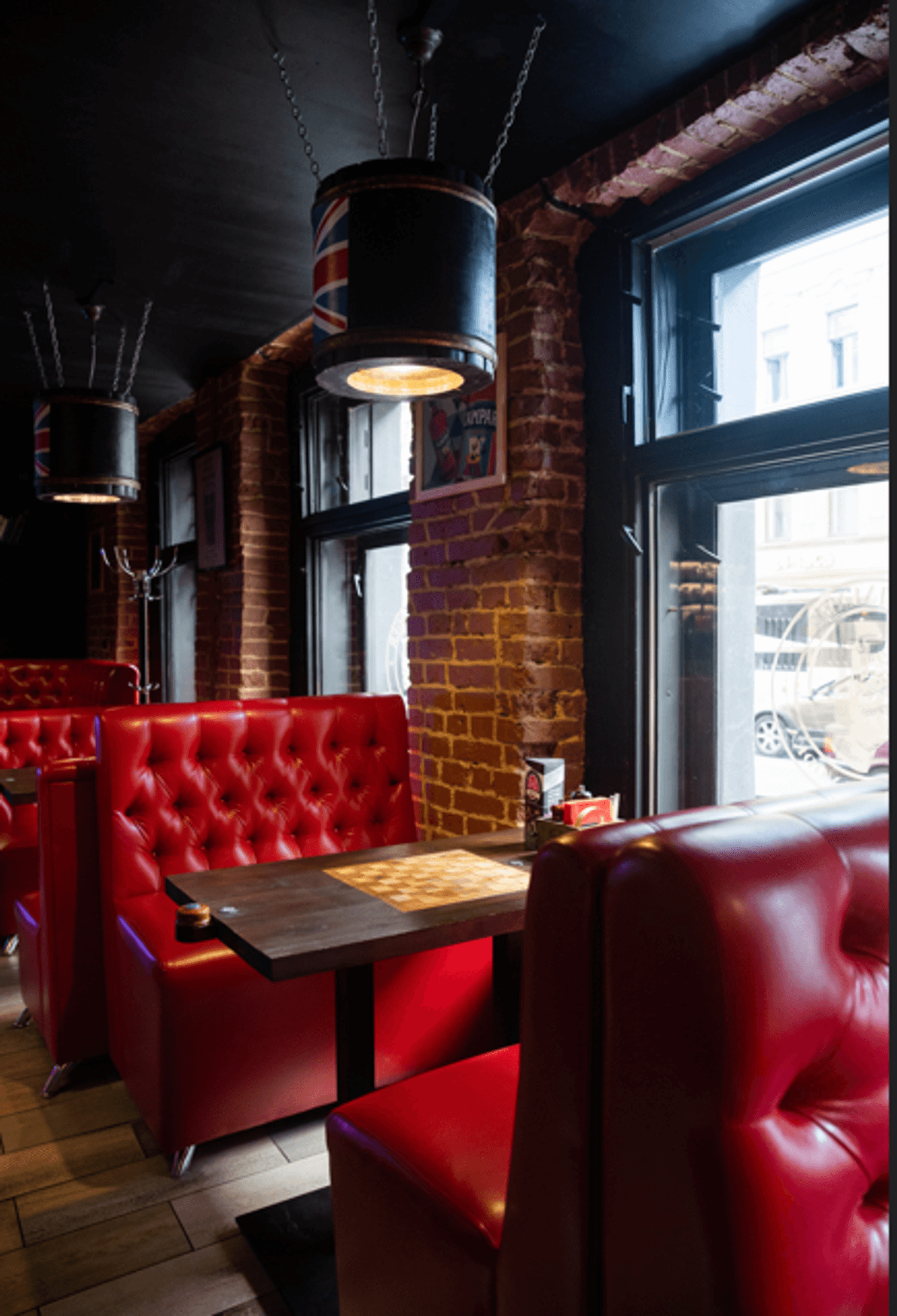 Атмосфера. Пространство с сводчатыми кирпичными потолками, деревянными столами и мягкими диванами в бордовых тонах воссоздает дух традиционного паба где-то в Англии или Ирландии. Детали в виде светильников-бочек и приглушенного света создают ощущение теплого и гостеприимного заведения, где легко провести вечер за разговором или веселыми посиделками с друзьями.