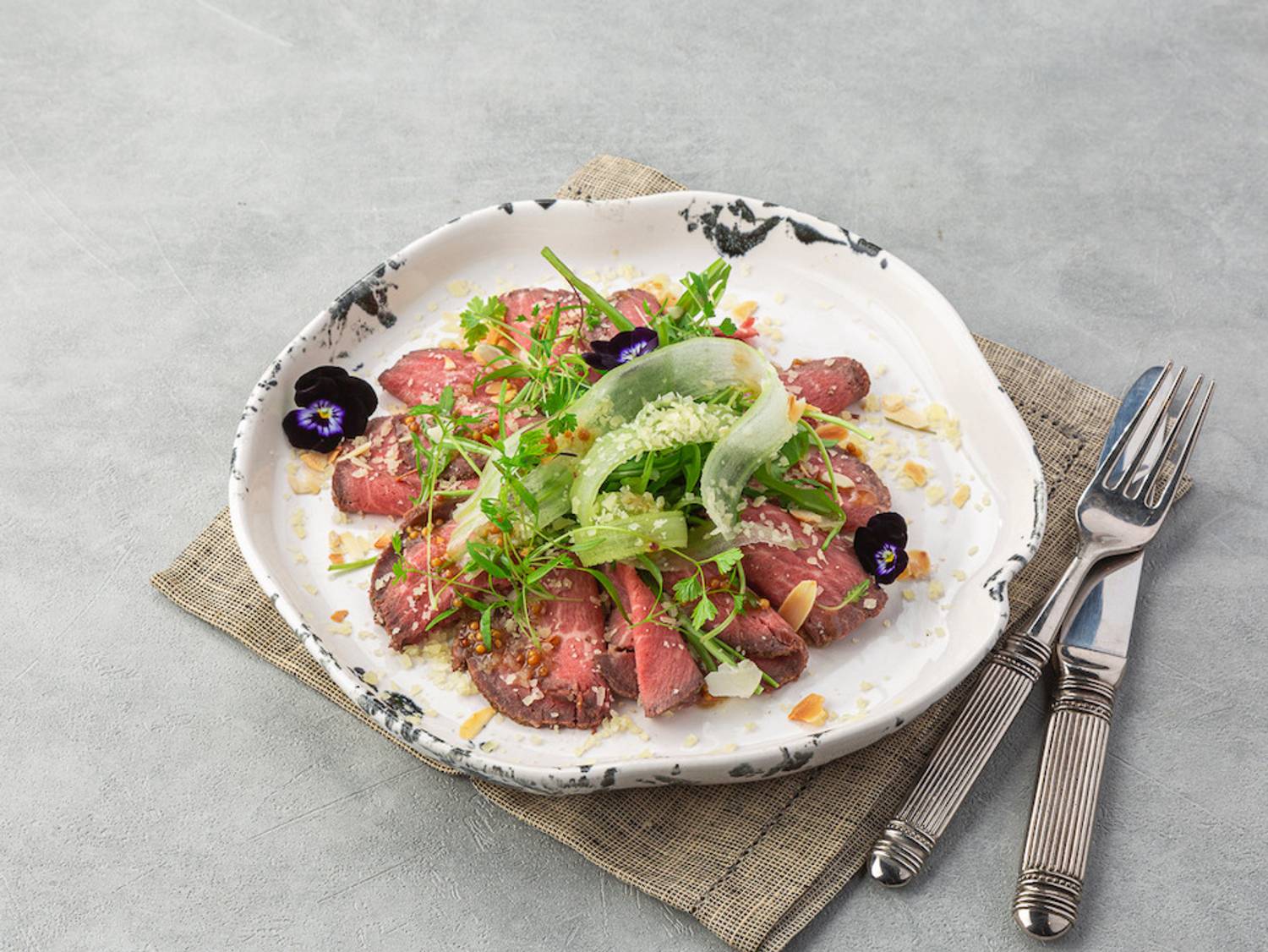 Еда и напитки. В меню стартеры в виде тартара из говядины с кремом из горгонзолы, рийета из утки с пьяной вишней. На горячее подают черные спагетти с морепродуктами в соусе том ям, утиную ножку конфи с картофельным гратеном, ролл с лососем и креветкой под манговым соусом и запеченный с крабом.