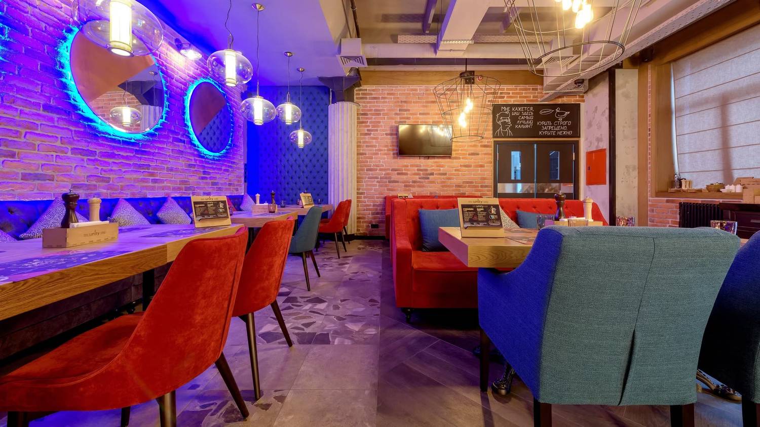 Атмосфера. Дизайн выполнили в стиле индустриального лофта с яркими акцентами: велюровые кресла, деревянные столы, оригинальные пышные светильники и неоновые зеркала. Внутри есть контактная барная стойка из гранита и стеклоблоков, профессиональная сцена с танцполом и современным звуковым оборудованием. Здесь регулярно проводят dj-сеты и вечеринки.