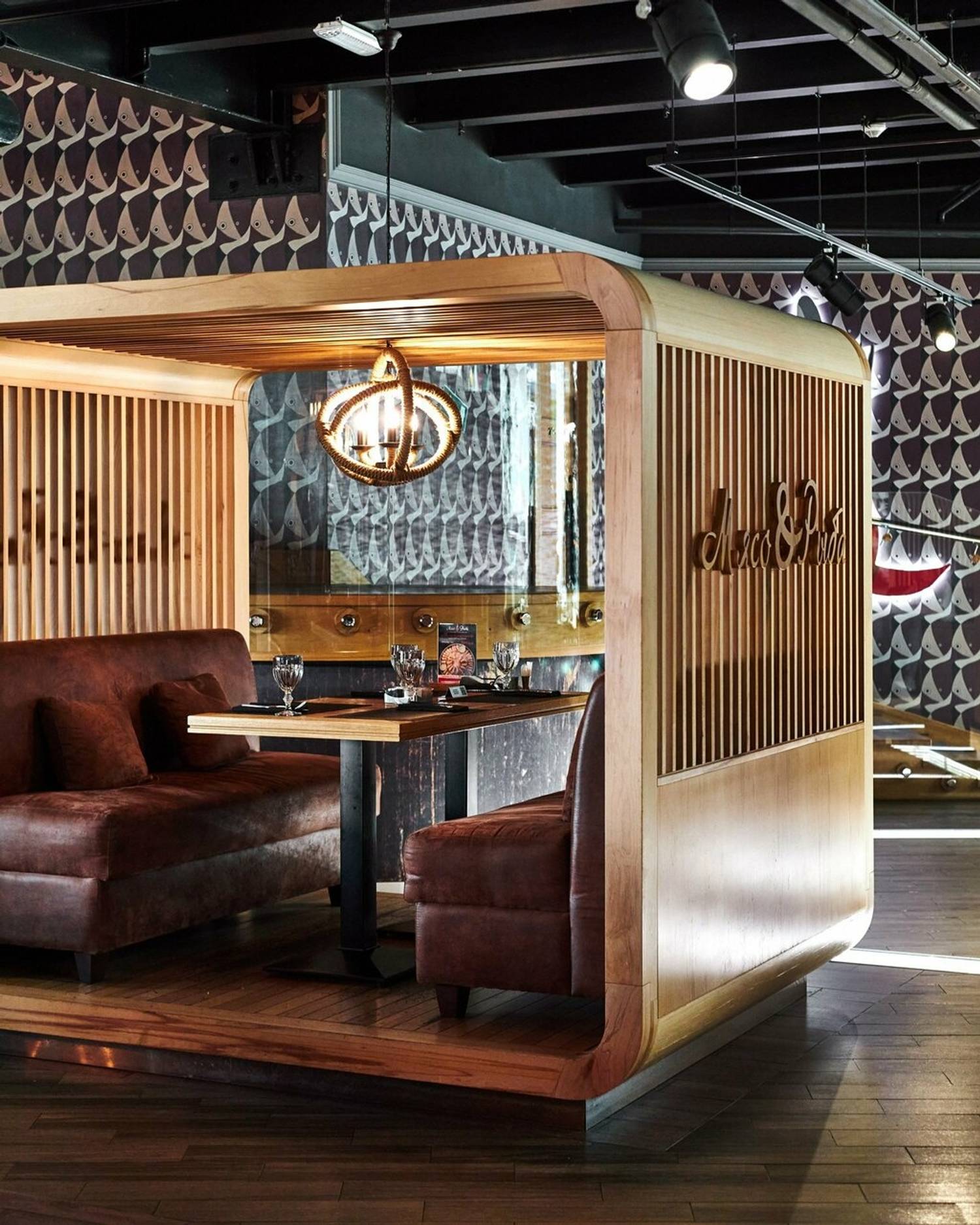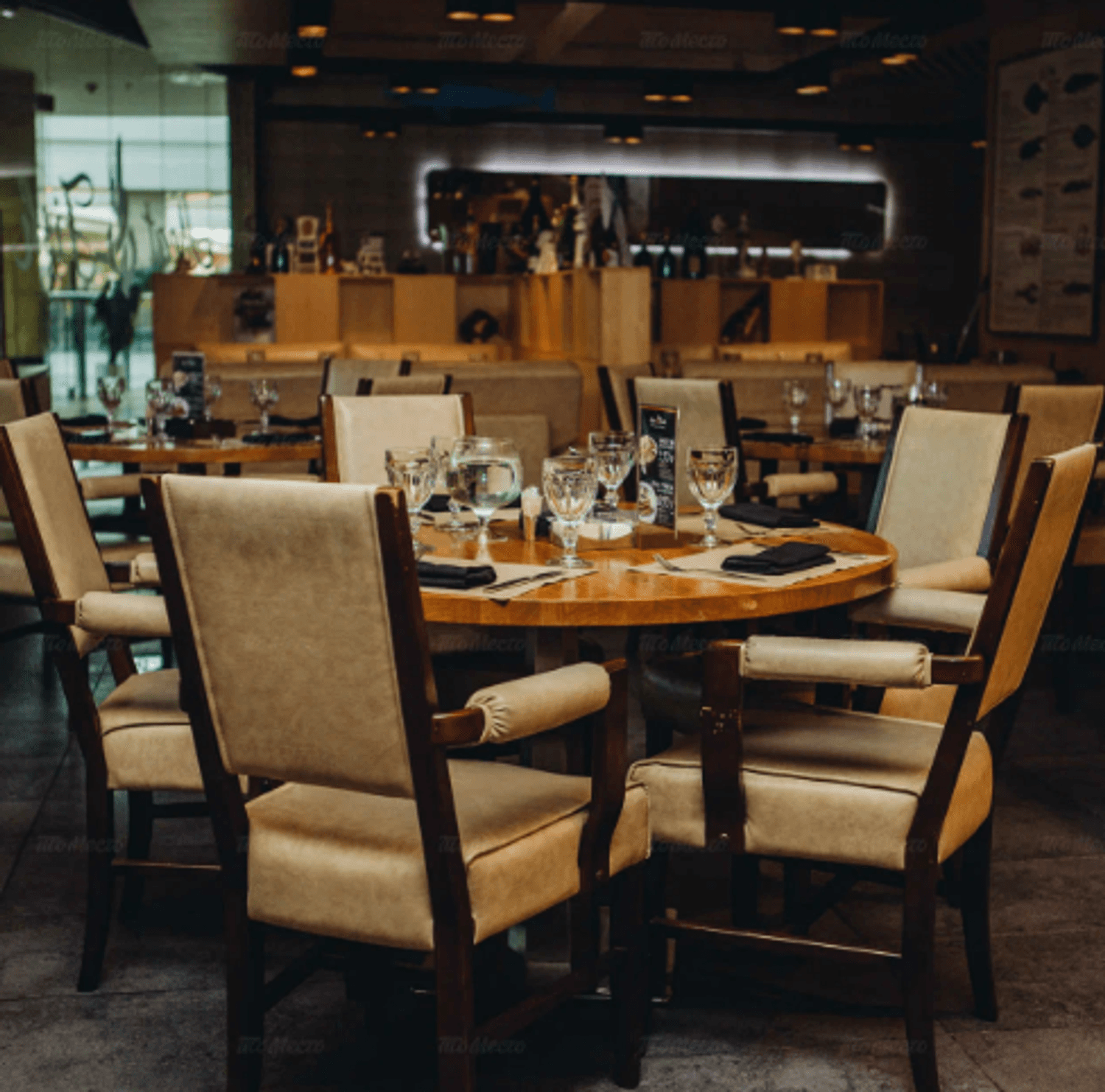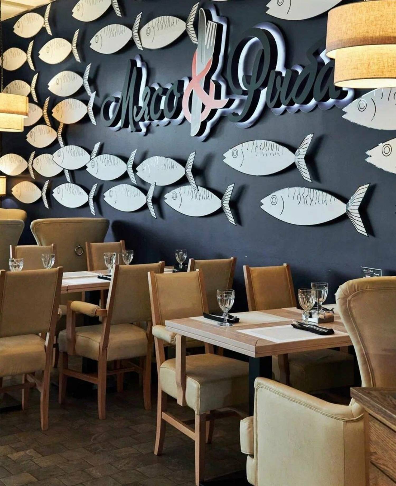 Атмосфера. Пространство на 500 мест включает два основных зала, банкетную зону, детскую площадку и летнюю веранду. Интерьер выдержан в современном средиземноморском стиле: золотистого цвета мебель, деревянные столы, удобные большие кресла и графичные рисунки на стенах. Декоративные элементы в виде бутылок и статуэток подчеркивают концепцию «рыба, мясо и вино».