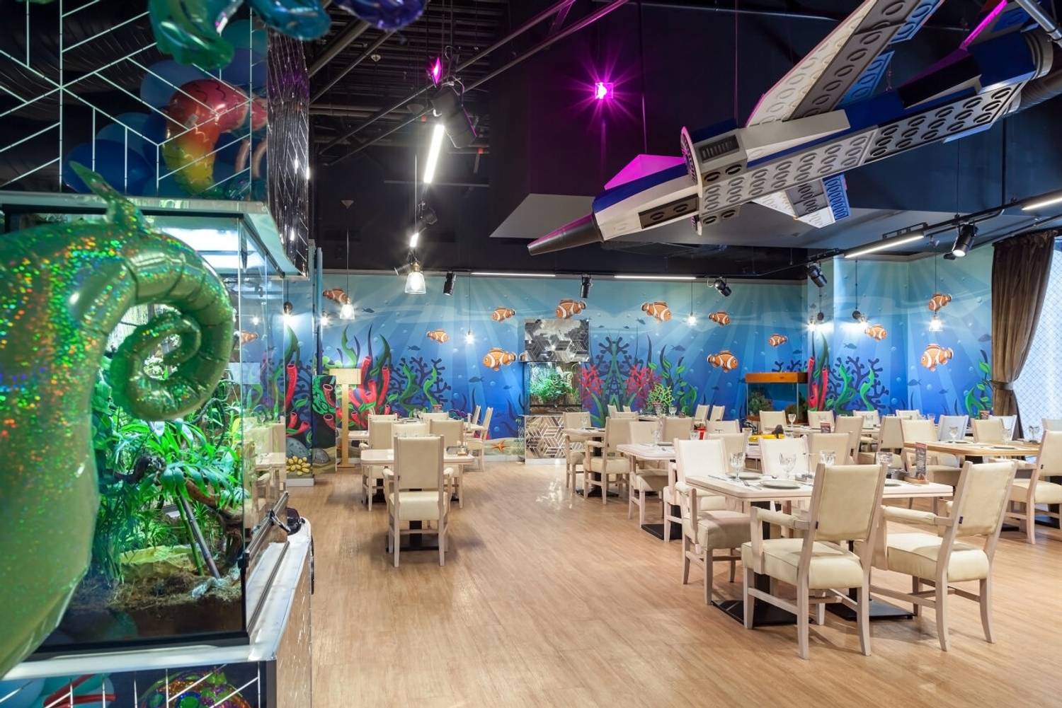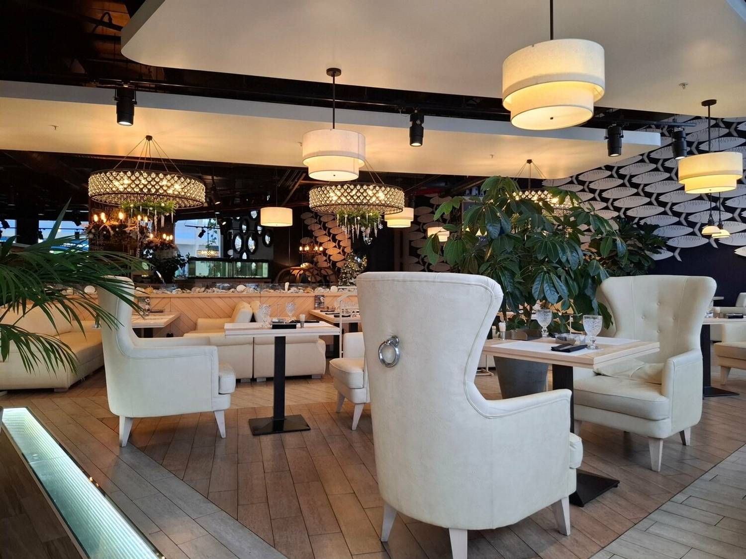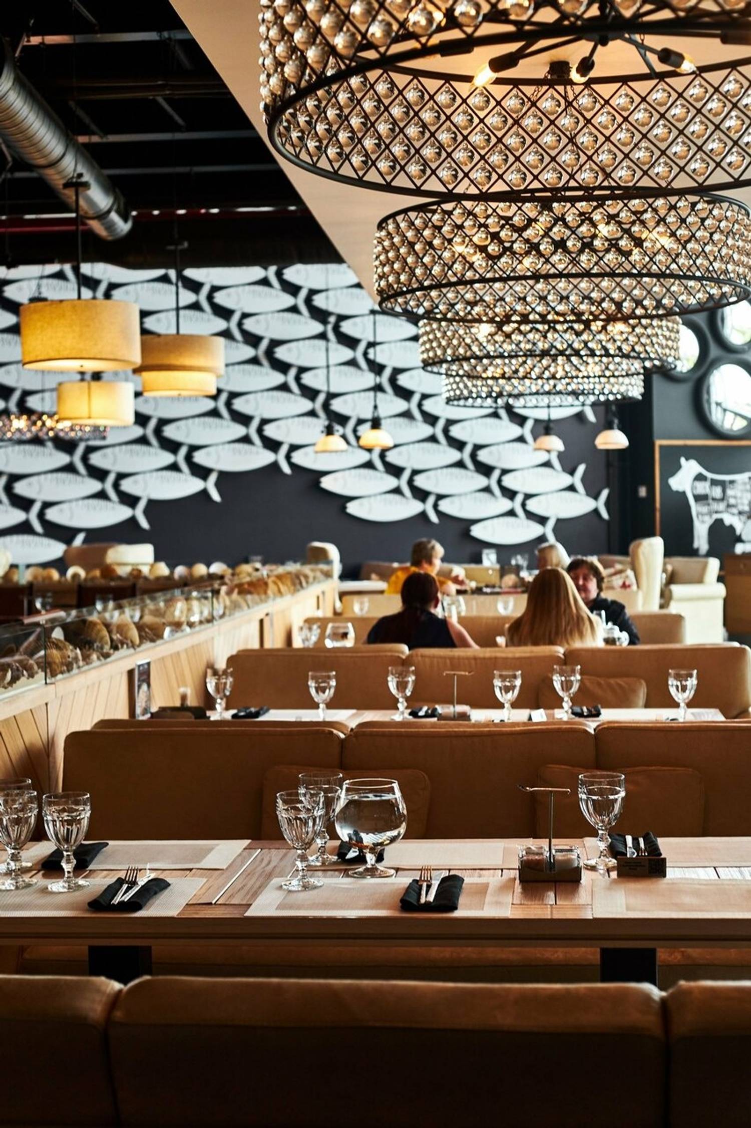 Атмосфера. Пространство на 500 мест включает два основных зала, банкетную зону, детскую площадку и летнюю веранду. Интерьер выдержан в современном средиземноморском стиле: золотистого цвета мебель, деревянные столы, удобные большие кресла и графичные рисунки на стенах. Декоративные элементы в виде бутылок и статуэток подчеркивают концепцию «рыба, мясо и вино».