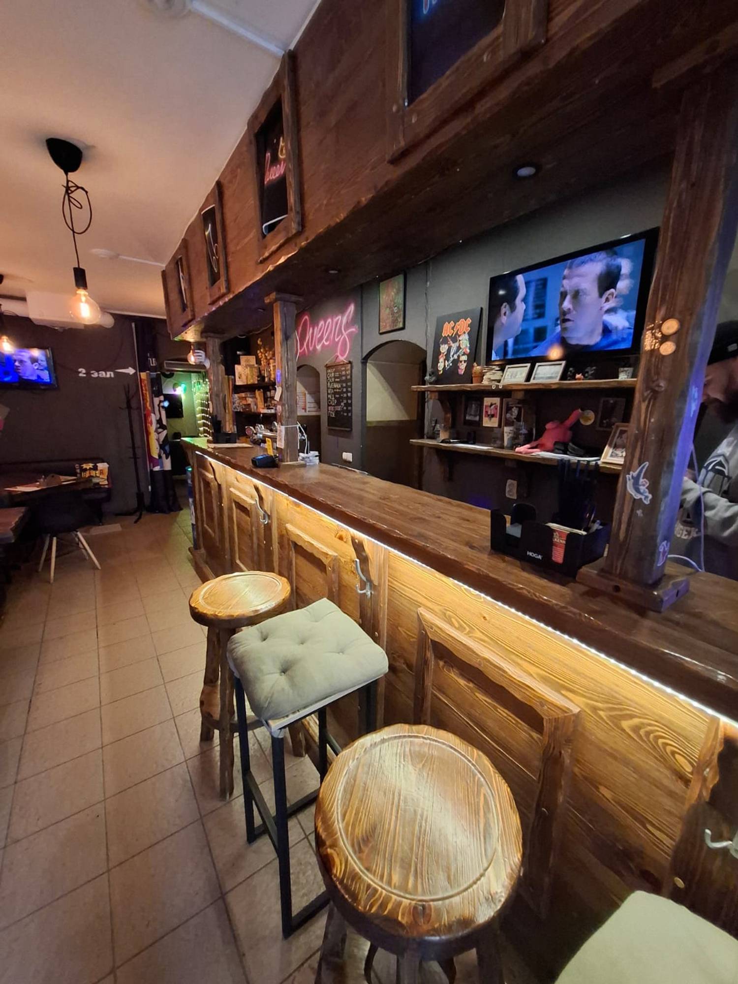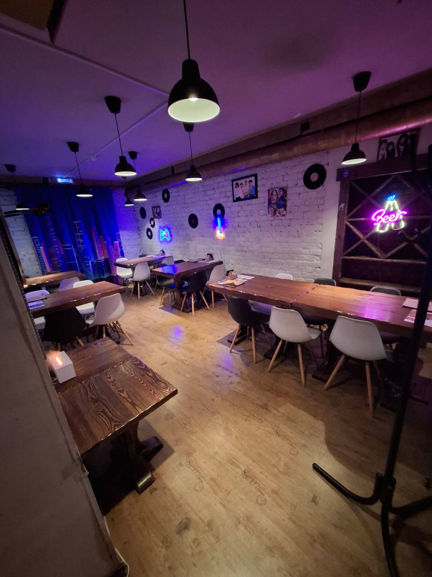 Атмосфера. Небольшой зал с белыми кирпичными стенами украшен виниловыми пластинками и шторами с принтом клавишных инструментов. Деревянная барная стойка, столики с настольными играми и сцена, где часто выступают музыканты.