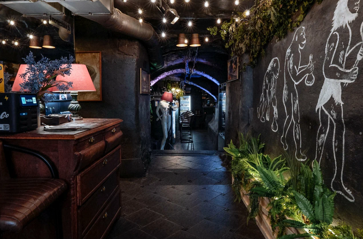 Атмосфера. Единое пространство разделено на барную зону с кожаными стульями и лаунж с массивными книжными полками, создающими атмосферу кабинета коллекционера. Арт-объект — черная человеческая фигура с торшером вместо головы — и коллекция настольных игр подчеркивают синтез интеллектуального и релакс-досуга.