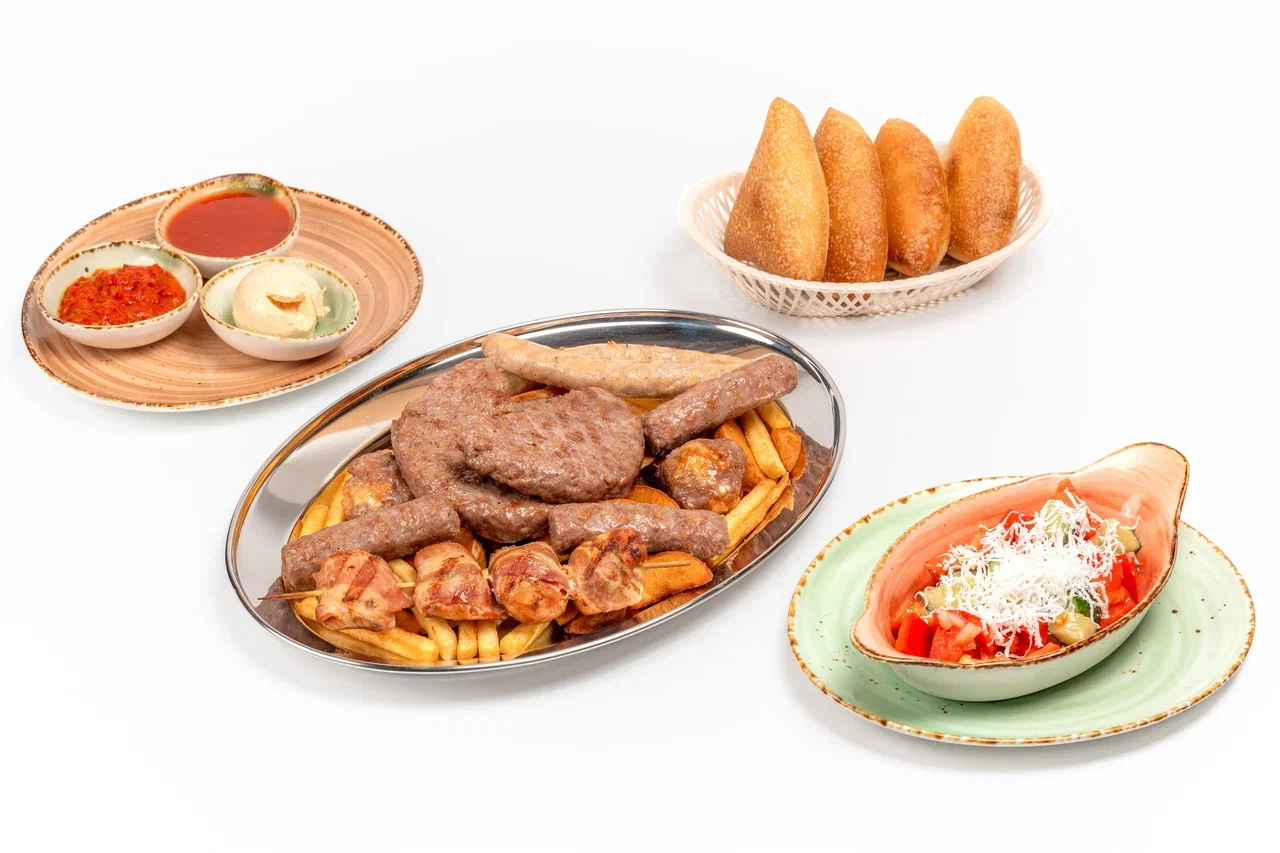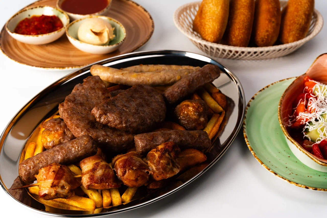 Еда и напитки. В меню сделан акцент на сербскую кухню: есть гурманская и пазарская плескавицы, сарма с говядиной и свининой, сатараш с индейкой. На большую компанию можно заказать мешано месо с микс-грилем из чевапчичи, уштипц и куриного ражнича (сербского шашлыка).