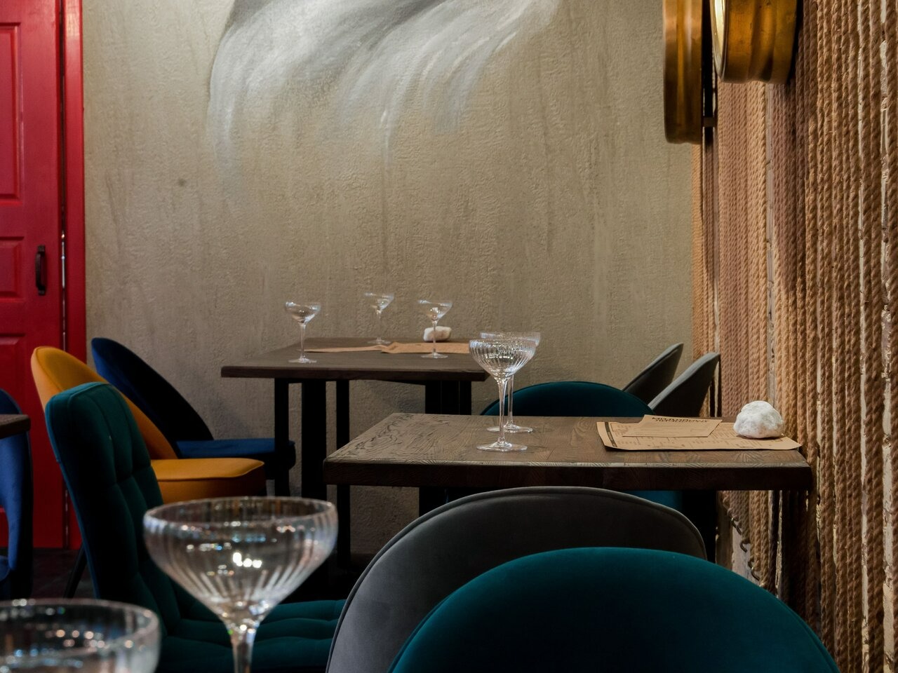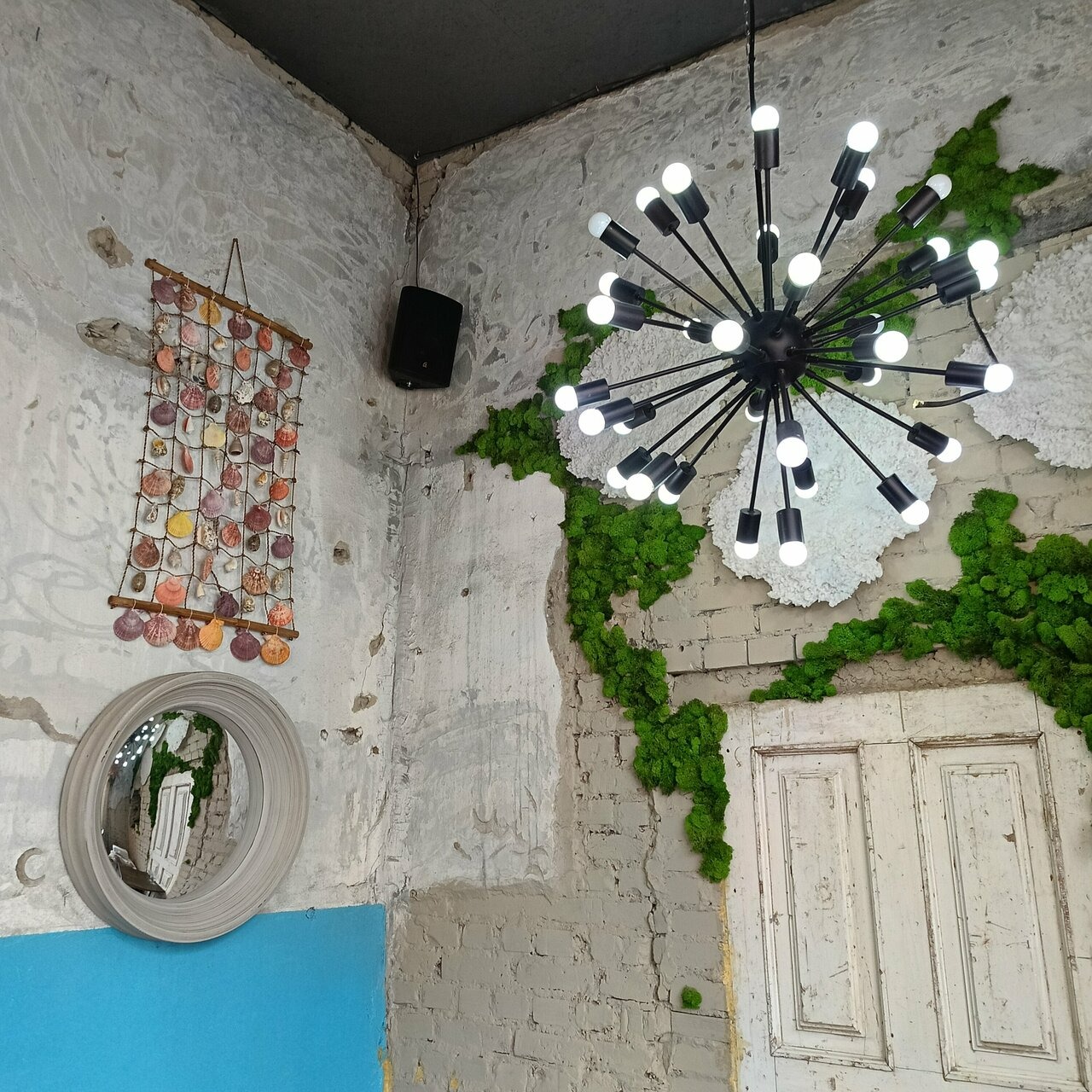 Атмосфера. Интерьер в морском стиле с арт-объектами: белые кирпичные стены с фрагментами искусственной травы служат фоном для графической росписи с чайкой и подвесных разноцветных рыб под потолком. Детали вроде аквариума и декоративных иллюминаторов дополняют образ корабельной пристани.