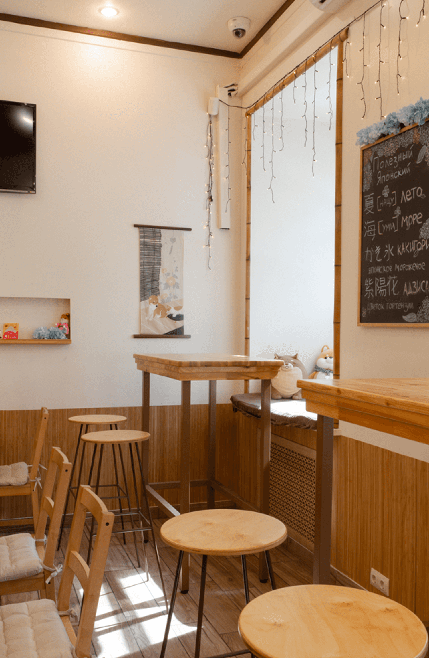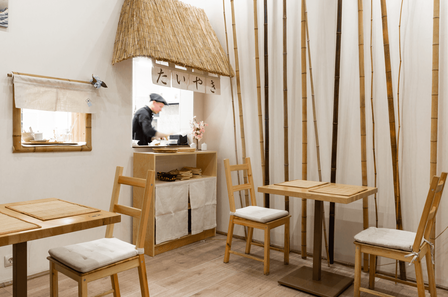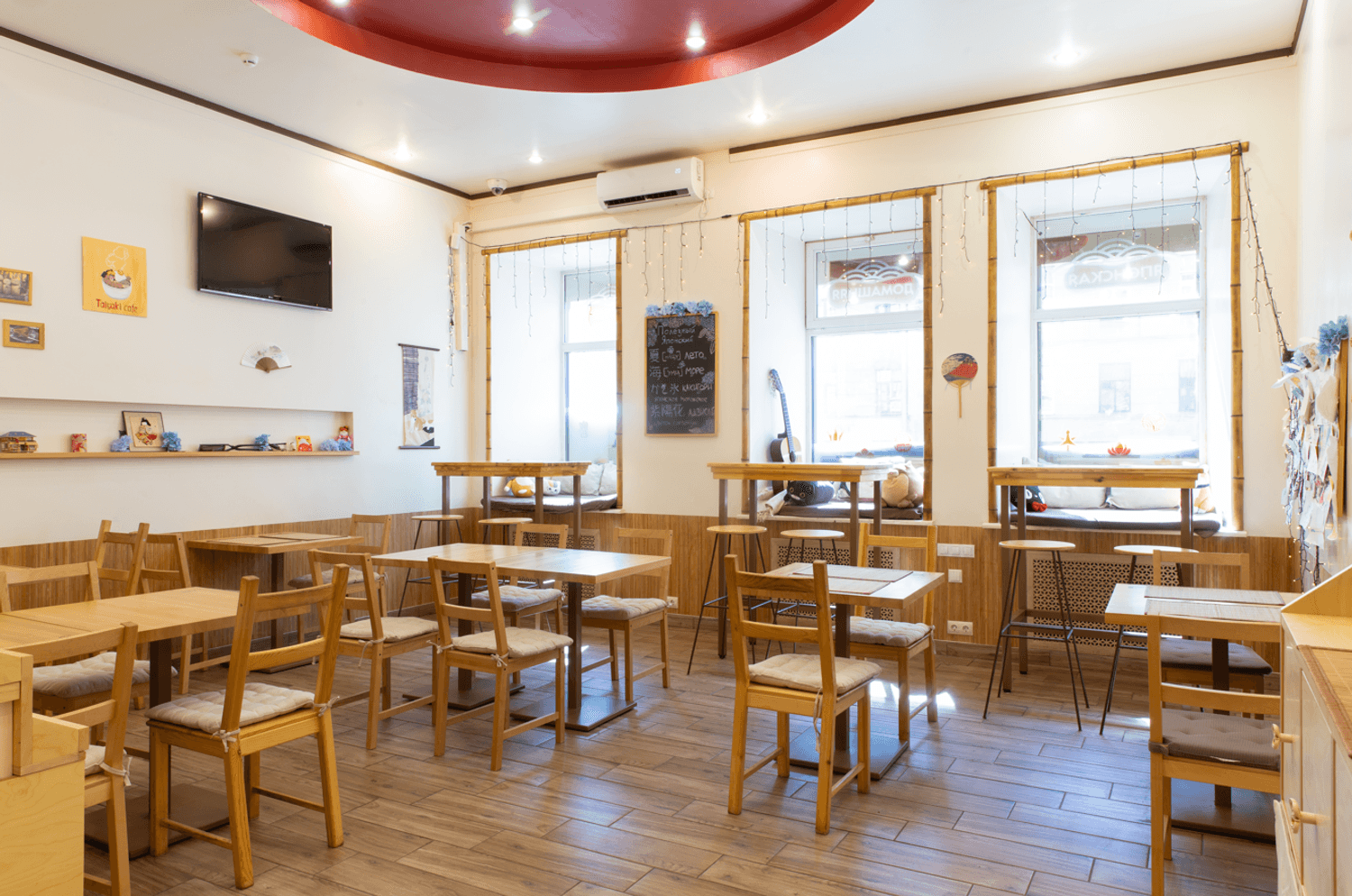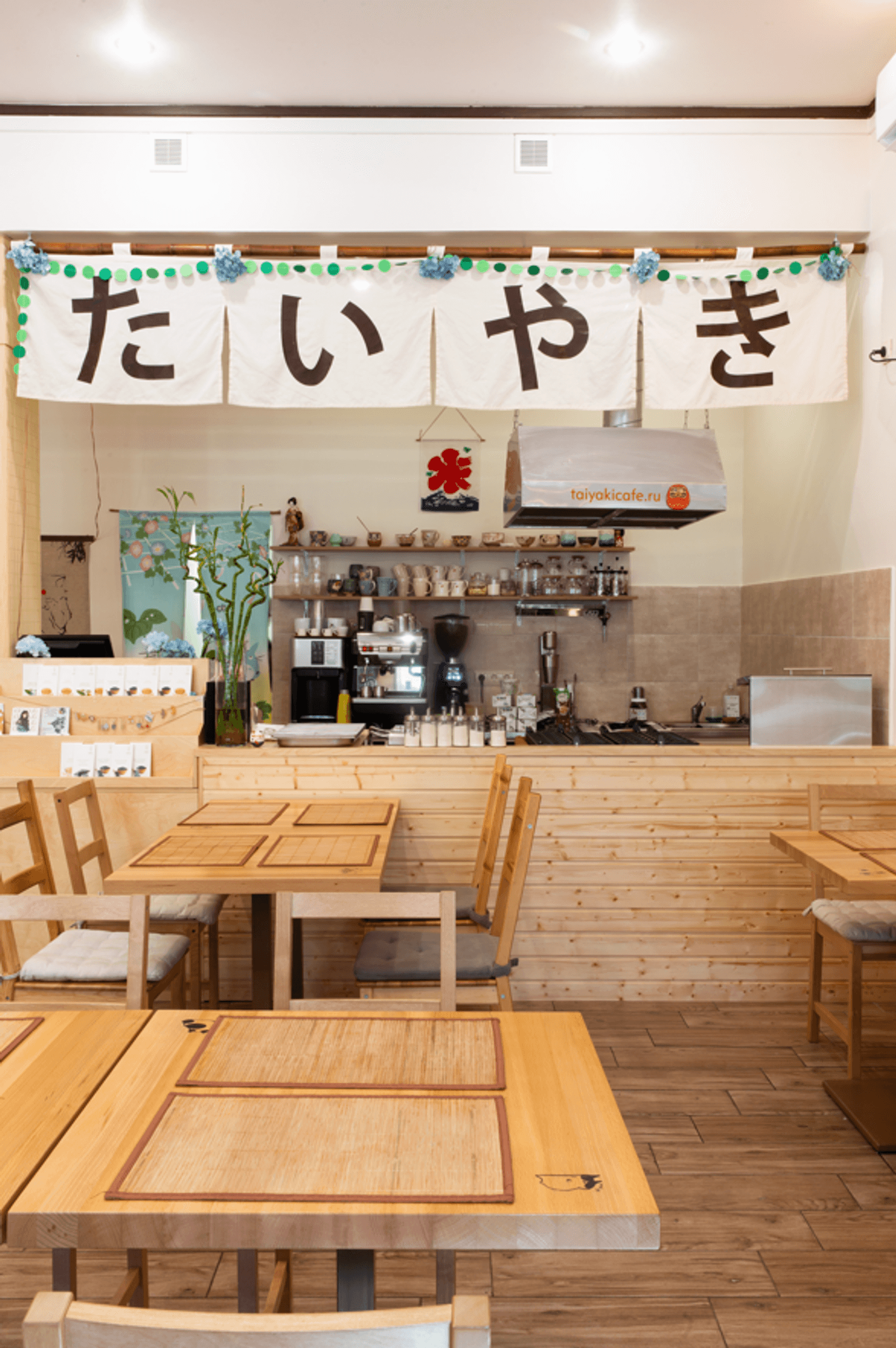 Атмосфера. Интерьер воссоздает дух современных токийских кафе: нейтральные цвета интерьера, деревянная отделка, но при этом яркая графика на стенах и динамичная рассадка. Небольшое пространство с открытой кухней, где готовят тайяки, наполнено ароматами вафель и японских специй, что создает ощущение уличного фуд-корнера в Японии.