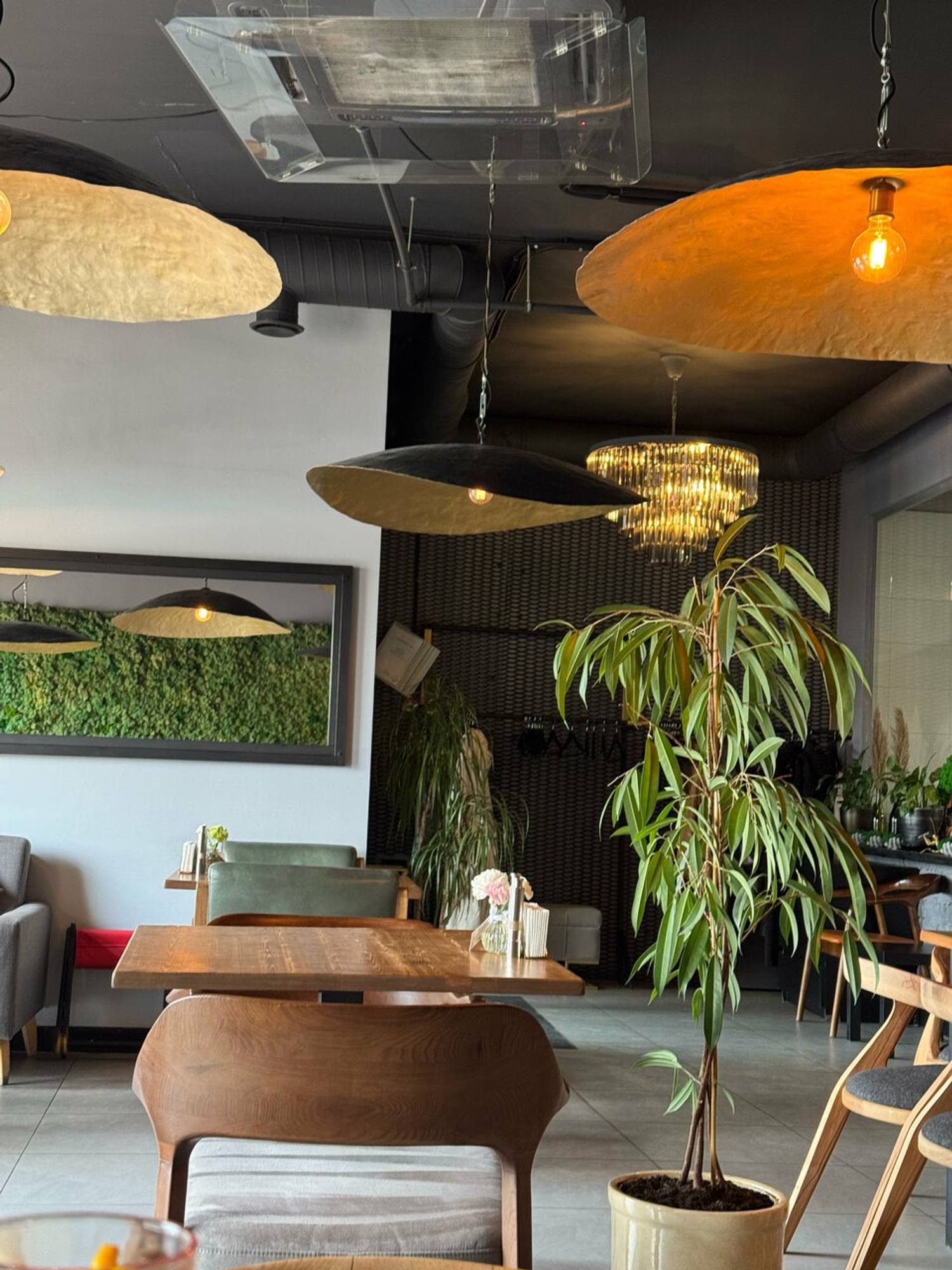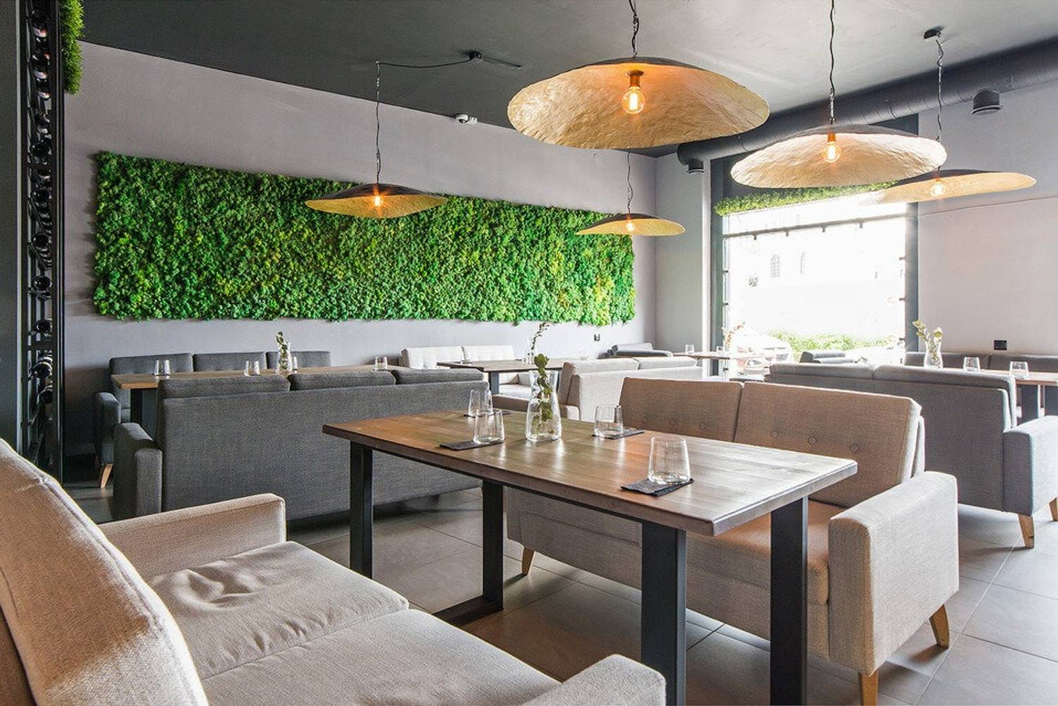 Атмосфера. Дизайн в сдержанной монохромной гамме: серые диваны и такого же цвета шкафы с винной коллекцией. Акценты расставлены через прямоугольное панно из искусственной травы, пластообразные люстры и живые растения.
