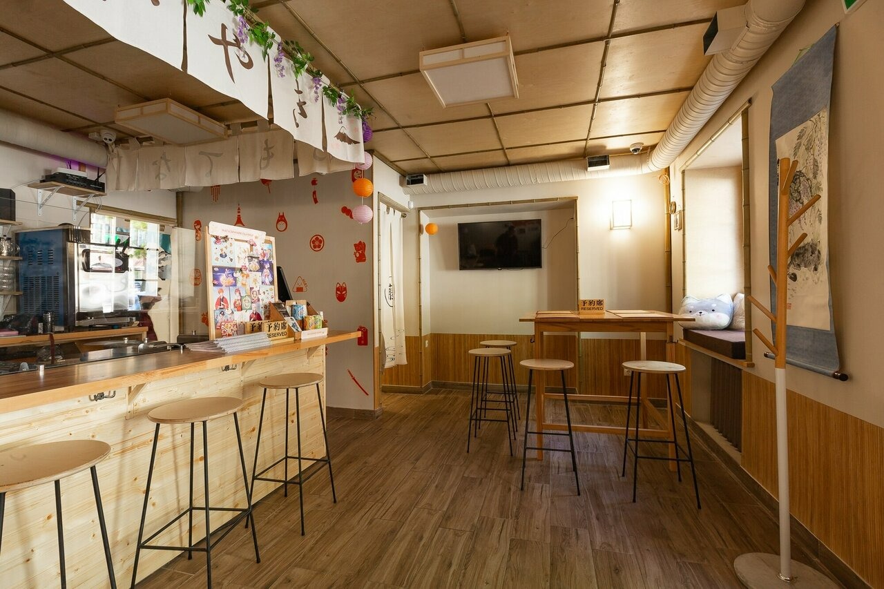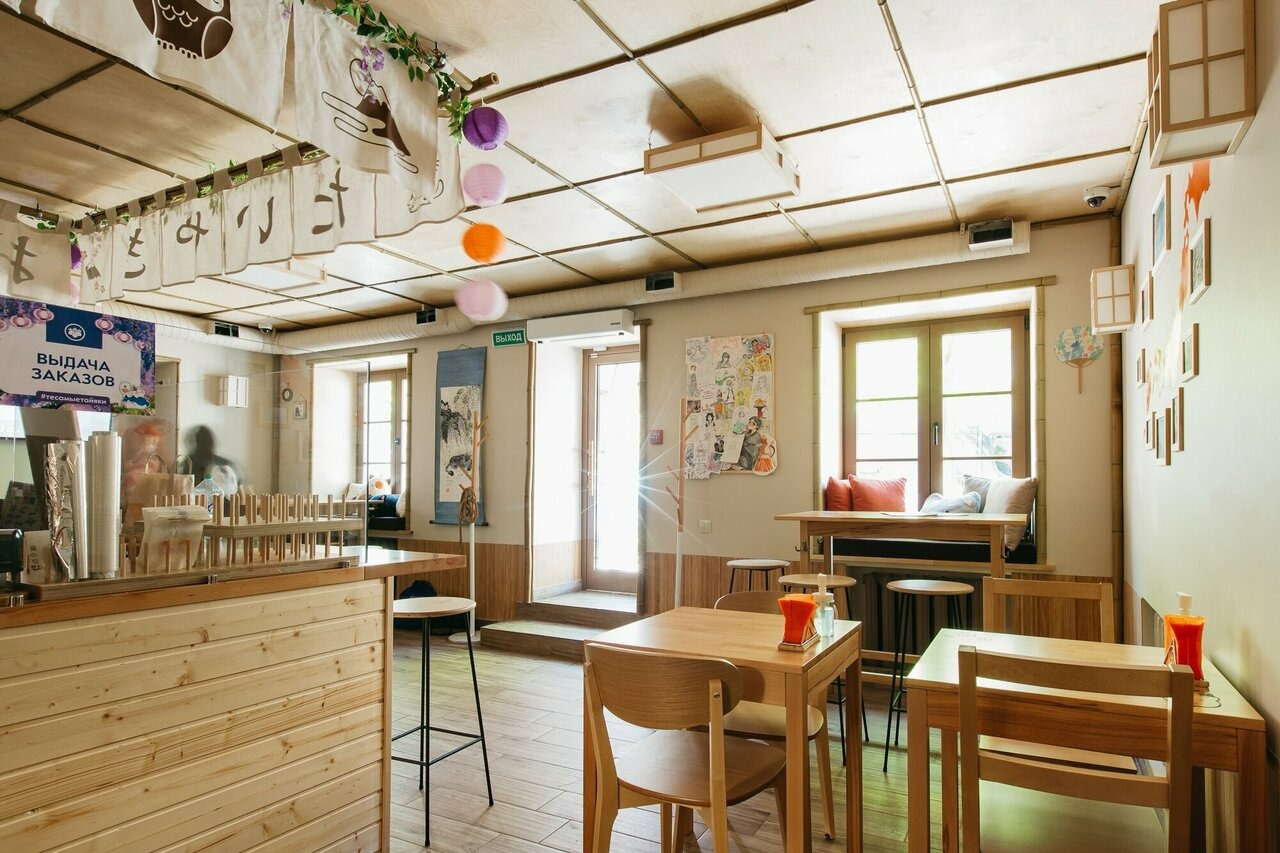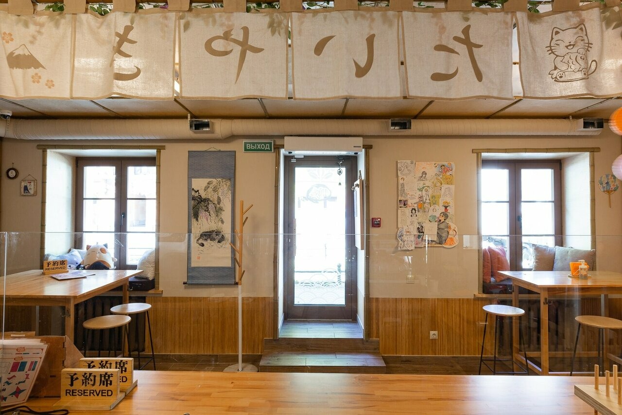 Атмосфера. Небольшое светлое пространство с деревянной мебелью. Иероглифы над стойкой заказов, карта Японии с отмеченными значимыми местами, мягкие игрушки-котики и доска с японскими рисунками создают ощущение, будто вы оказались в Токио. Здесь есть посадочные места не только за столами, но и на мягких подоконниках.