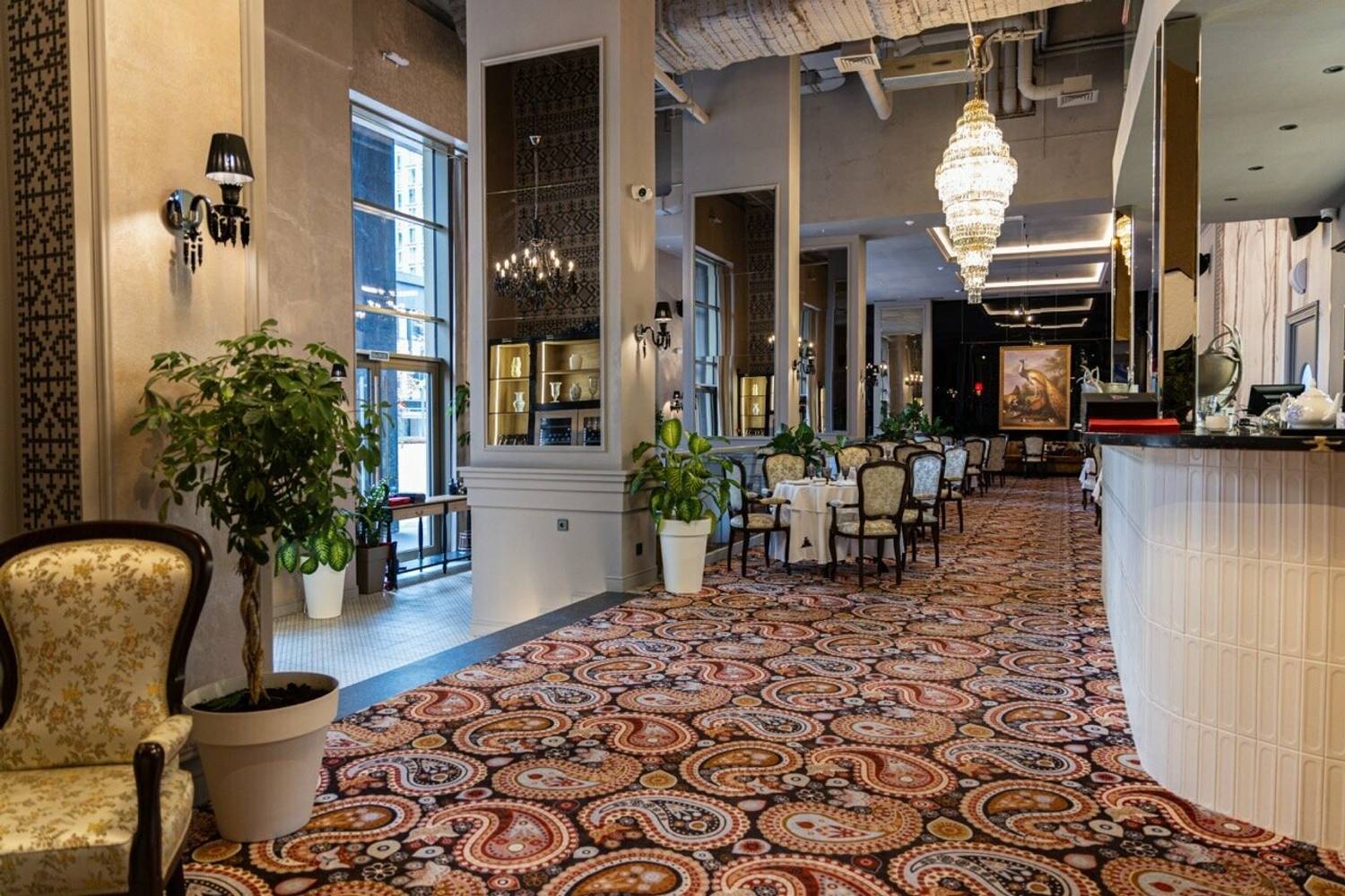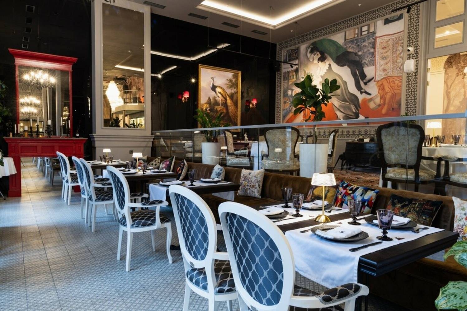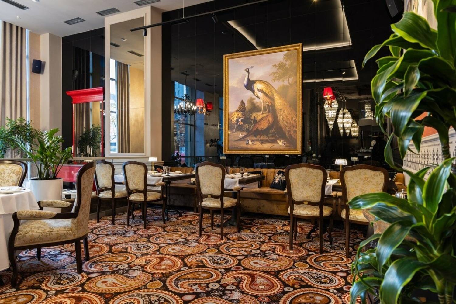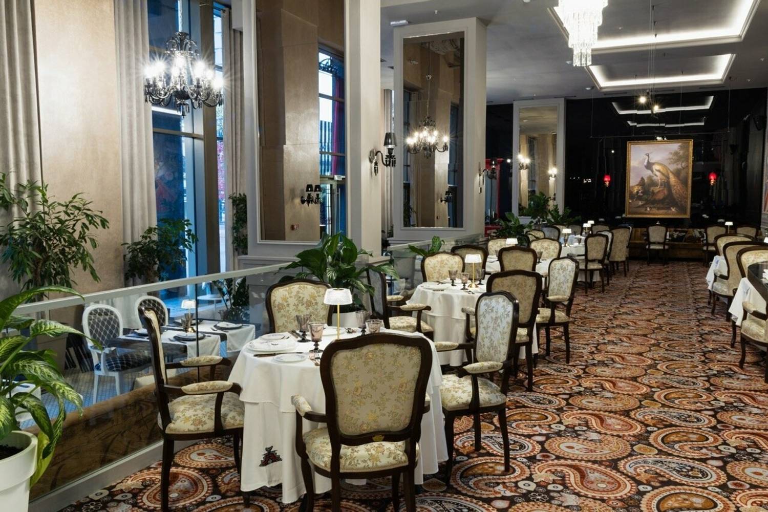 Атмосфера. Трехзальное пространство напоминает декорации к спектаклю: основной зал со стульями в стиле барокко и хрустальными люстрами контрастирует с минималистичным белым банкетным залом. Масштабные панно, винтажные ковры и обильная зелень создают эффект салона Серебряного века, слегка переосмысленного в современном ключе.