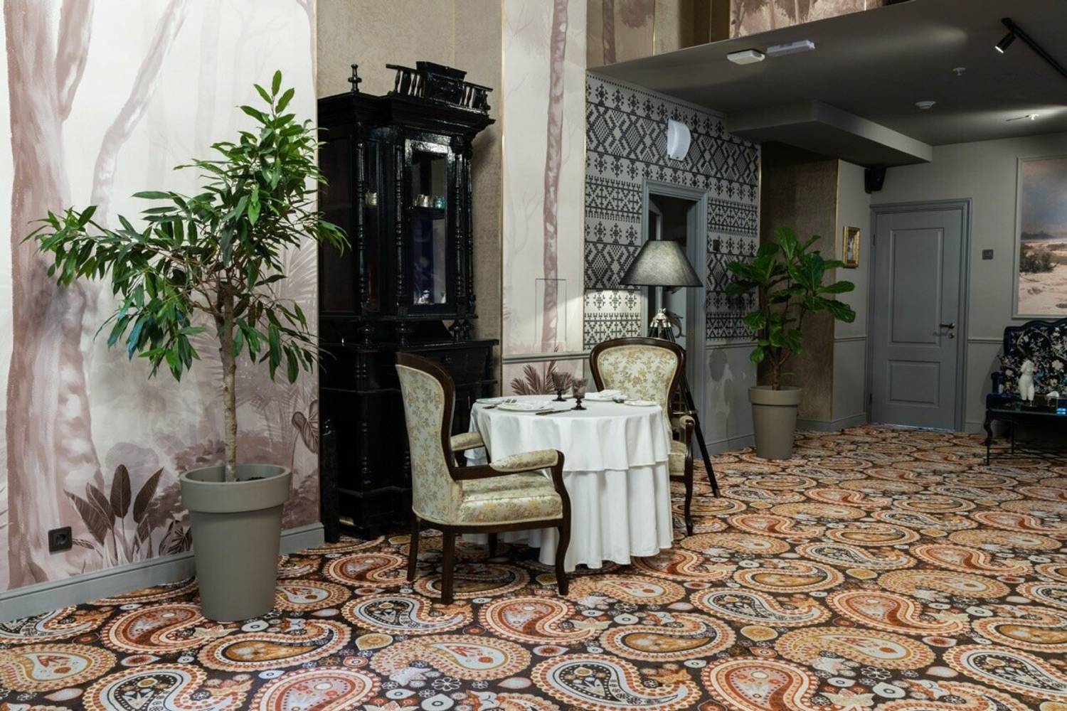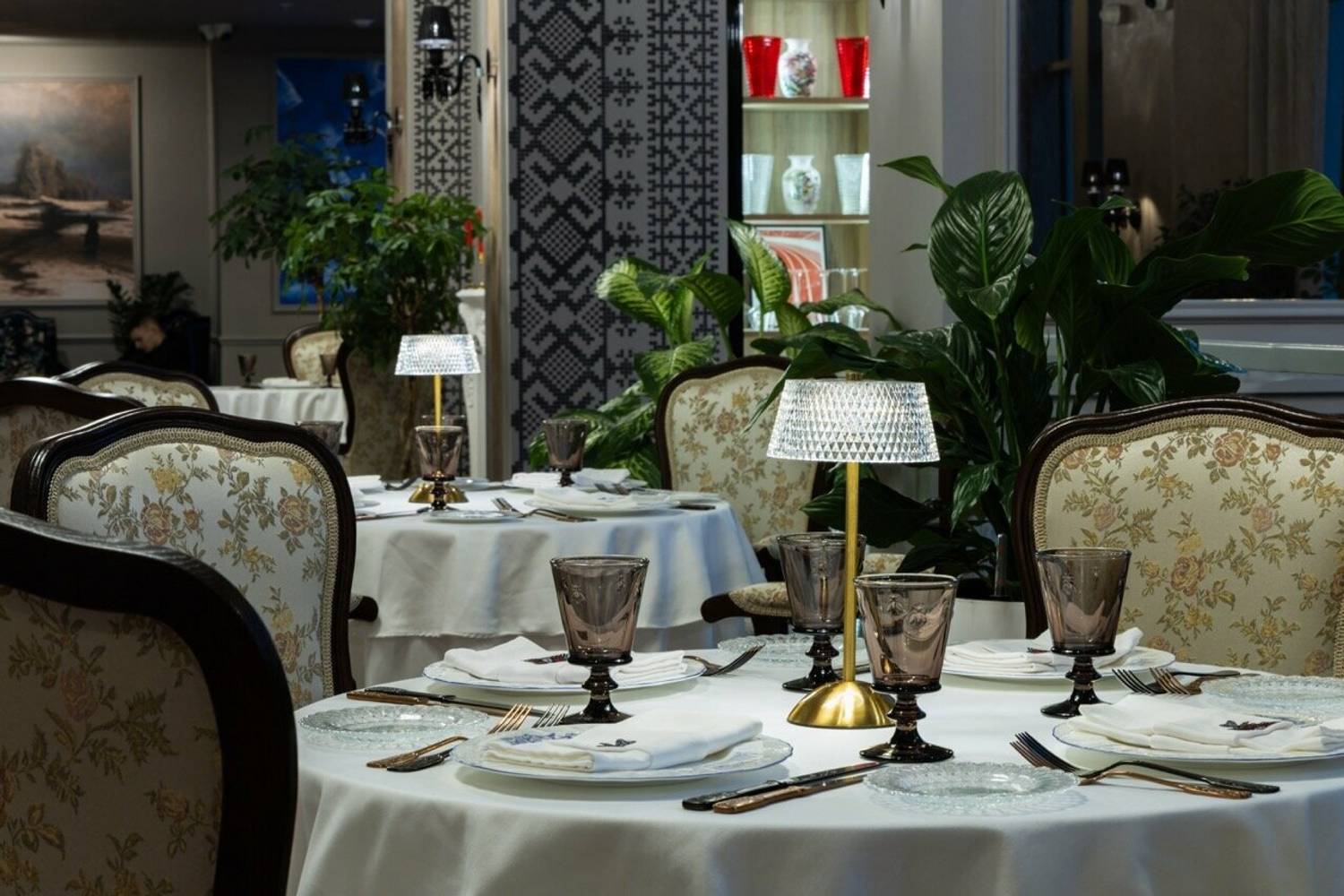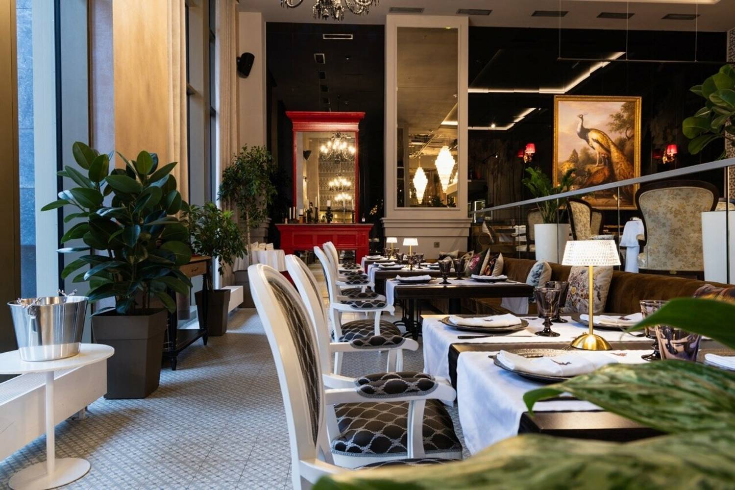 Атмосфера. Трехзальное пространство напоминает декорации к спектаклю: основной зал со стульями в стиле барокко и хрустальными люстрами контрастирует с минималистичным белым банкетным залом. Масштабные панно, винтажные ковры и обильная зелень создают эффект салона Серебряного века, слегка переосмысленного в современном ключе.