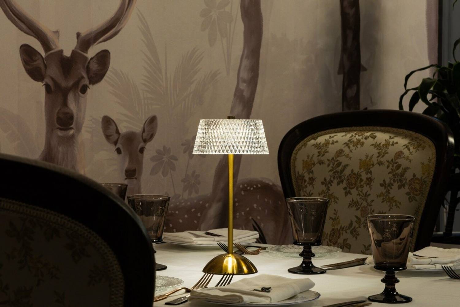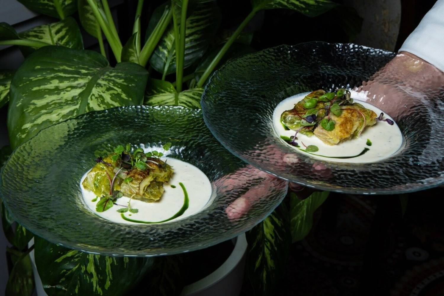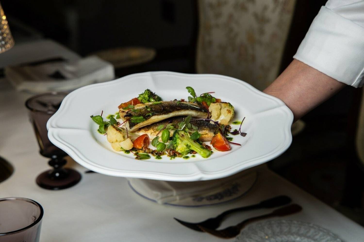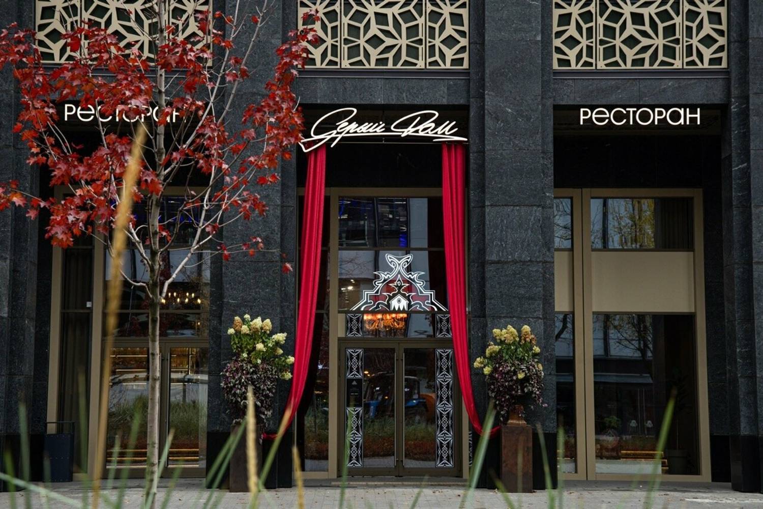 Атмосфера. Трехзальное пространство напоминает декорации к спектаклю: основной зал со стульями в стиле барокко и хрустальными люстрами контрастирует с минималистичным белым банкетным залом. Масштабные панно, винтажные ковры и обильная зелень создают эффект салона Серебряного века, слегка переосмысленного в современном ключе.