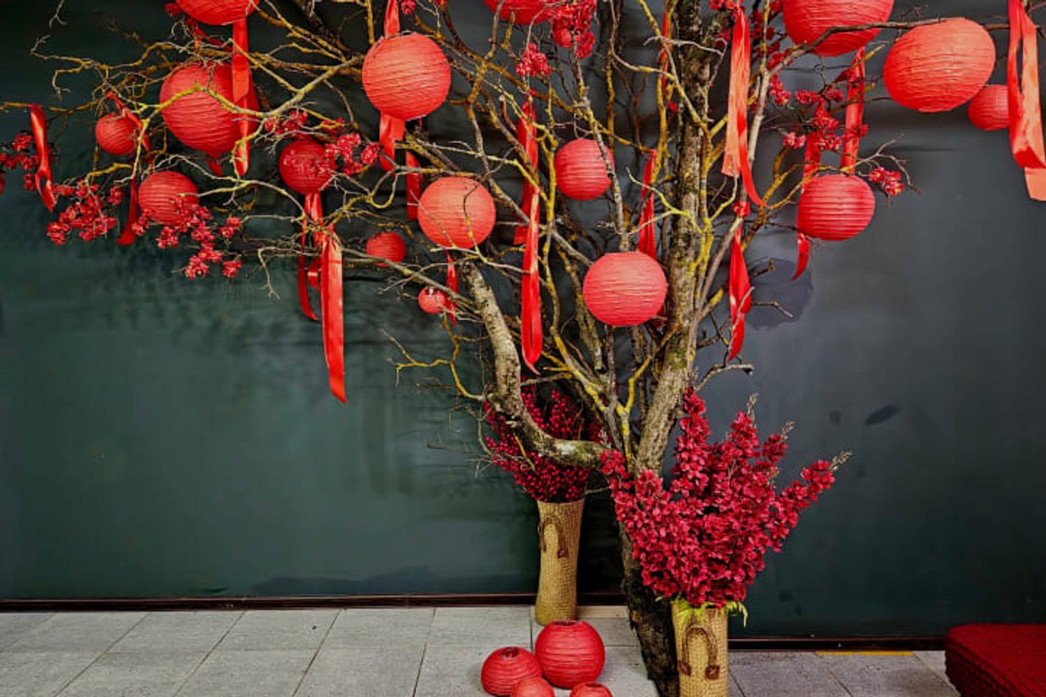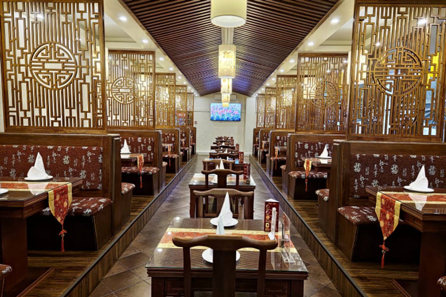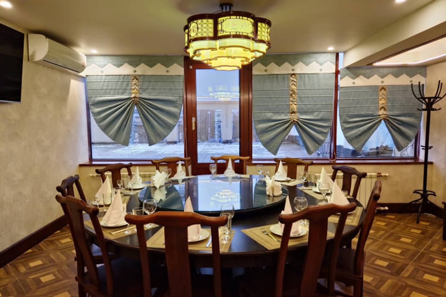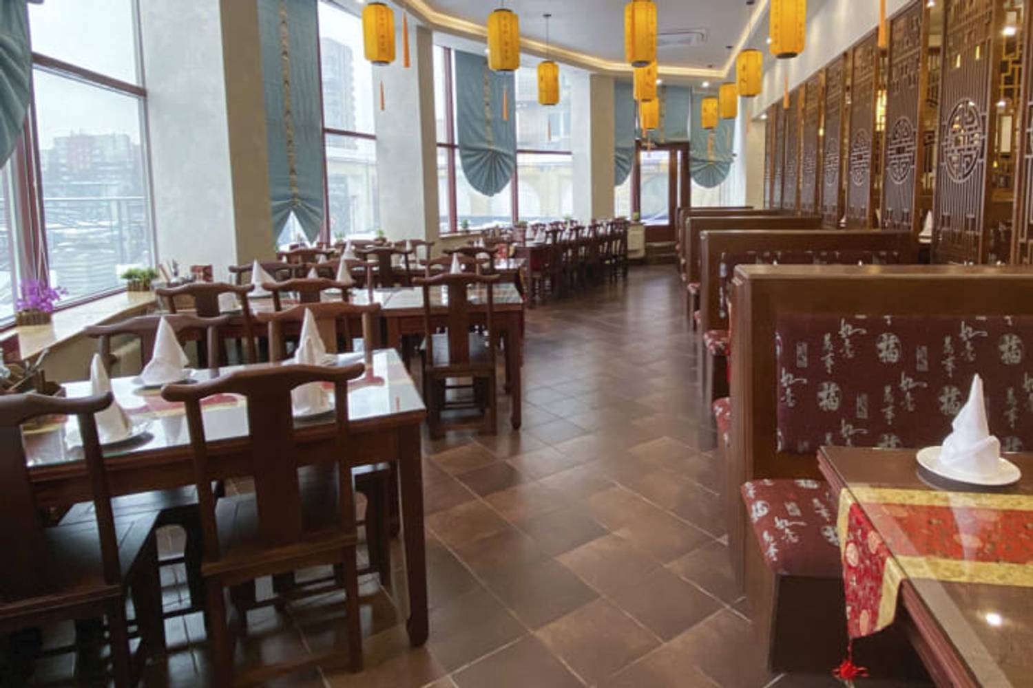 Атмосфера. Пространство с выраженными китайскими мотивами: резные деревянные перегородки между столами, расписные желтые светильники-фонарики и мягкие диваны с узорами.