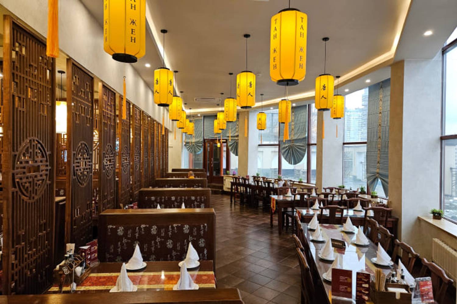 Еда и напитки. В меню — утка по-пекински, свиные ребрышки в соевом соусе, жареные кальмары, а также блюда на раскаленной сковороде и плите тебан, королевские креветки в кисло-сладком соусе, тофу по-домашнему с кусочками свинины. Подача блюд на больших общих тарелках. В баре — саке, китайская водка, сливовое вино, пиво и демократичные европейские вина.