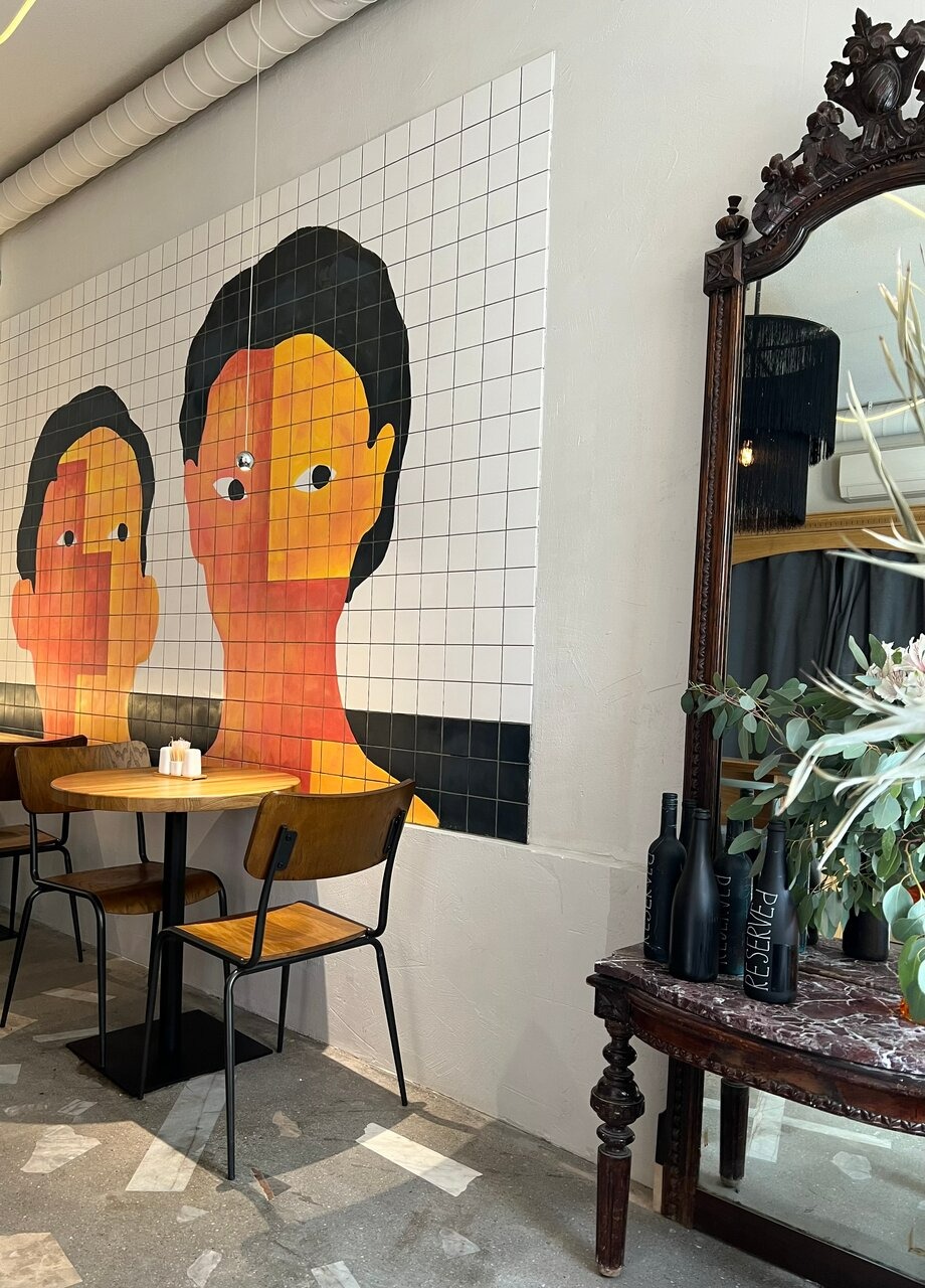 Атмосфера. Пространство с художественным хаосом: плитка с графическим рисунком двух лиц, черная люстра с ниспадающими элементами и винтажное зеркало создают эклектичный фон. Полки с растениями в кадках и приглушенный свет добавляют уюта, подчеркивая сочетание урбанистического стиля и азиатской эстетики.
