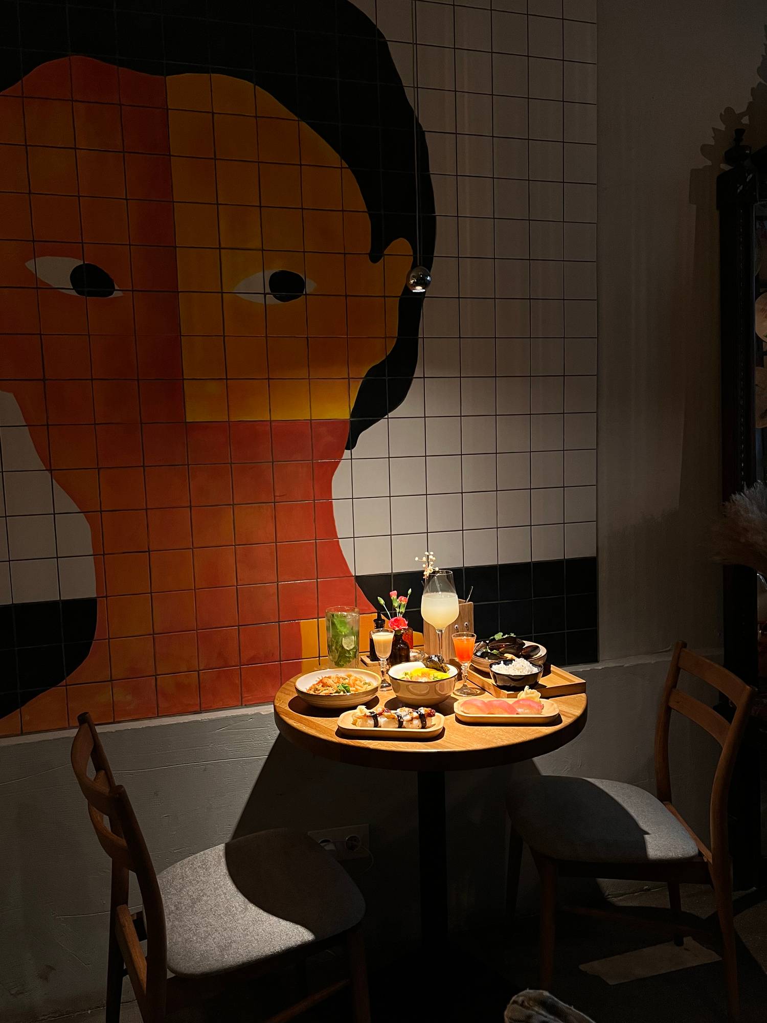 Атмосфера. Пространство с художественным хаосом: плитка с графическим рисунком двух лиц, черная люстра с ниспадающими элементами и винтажное зеркало создают эклектичный фон. Полки с растениями в кадках и приглушенный свет добавляют уюта, подчеркивая сочетание урбанистического стиля и азиатской эстетики.
