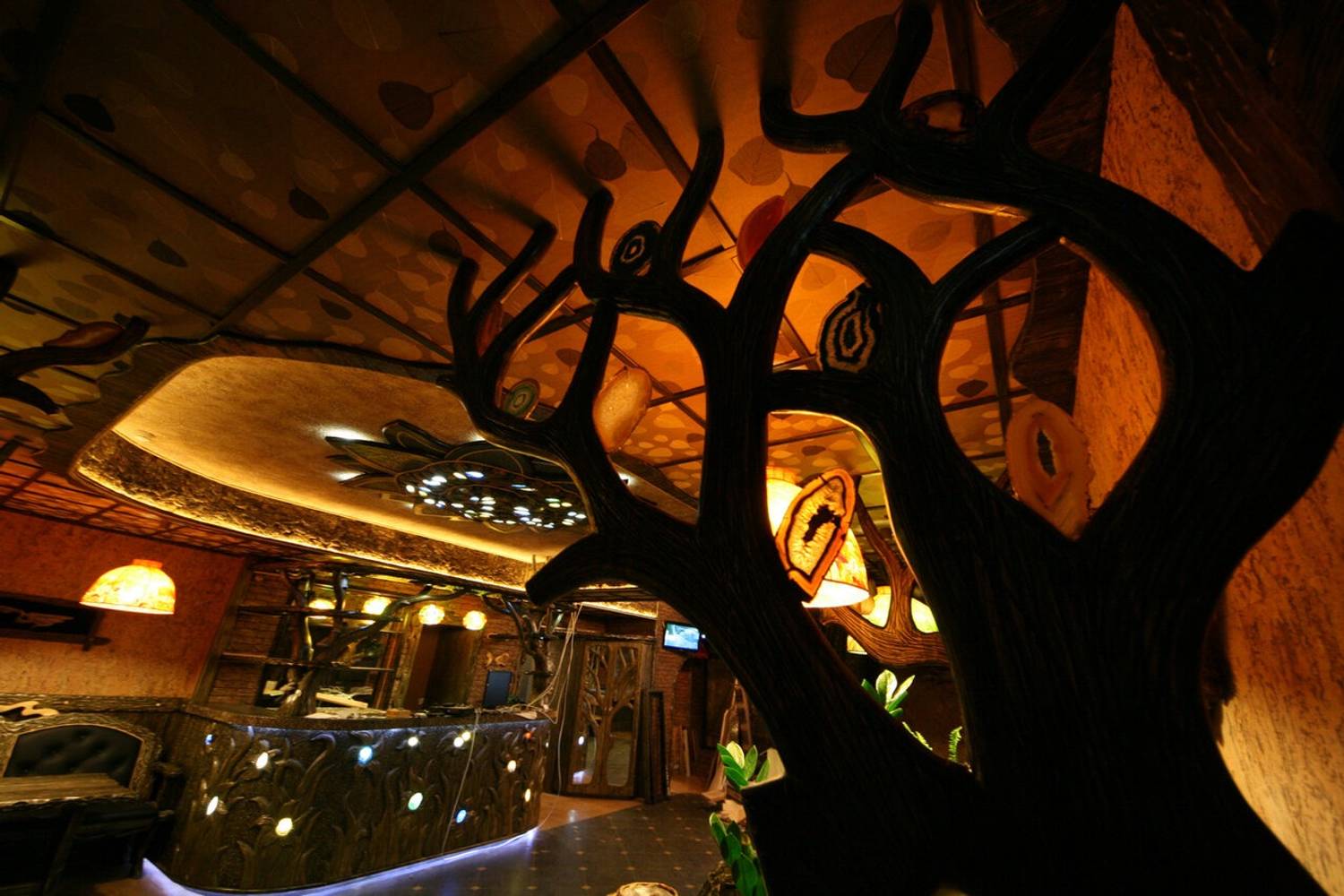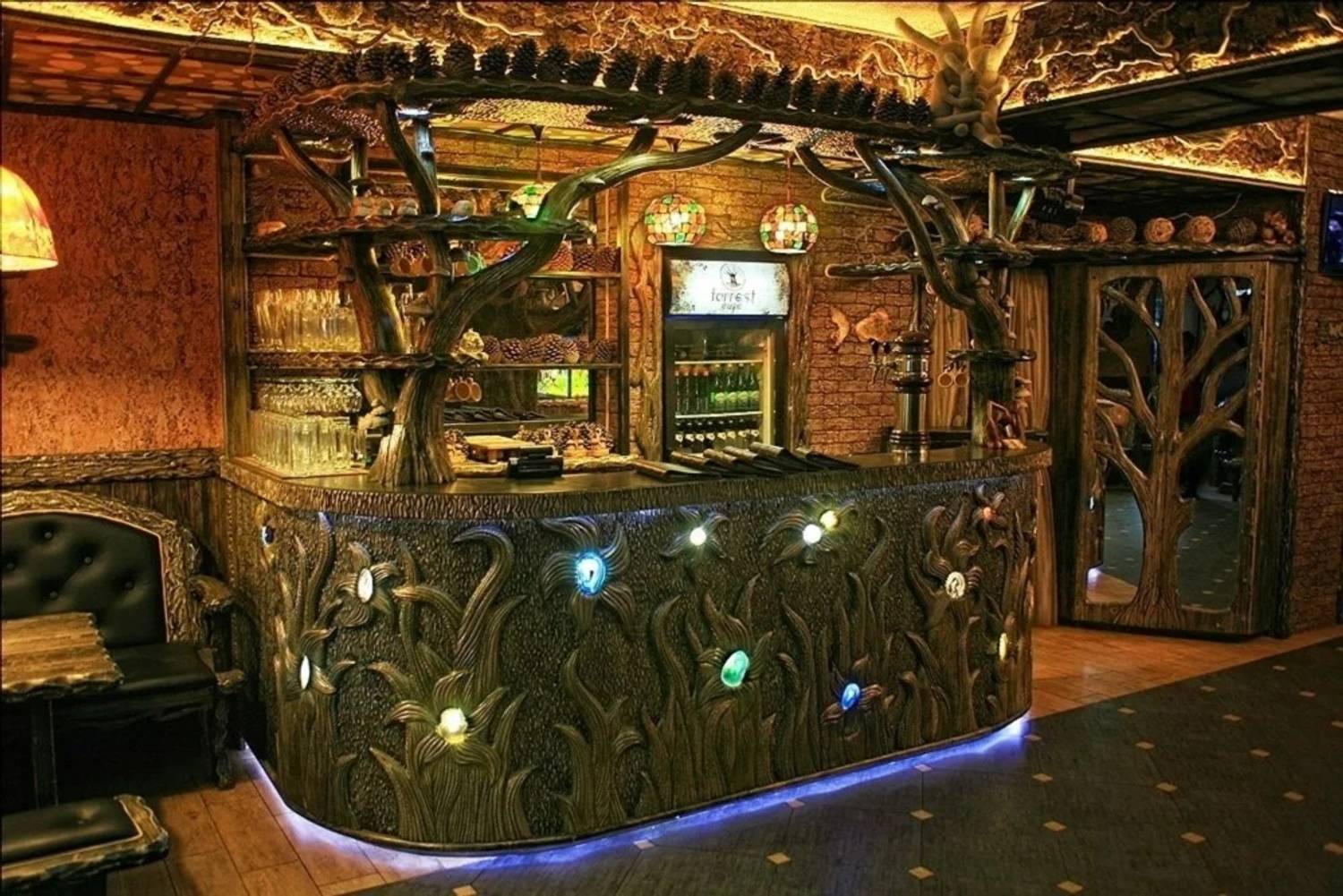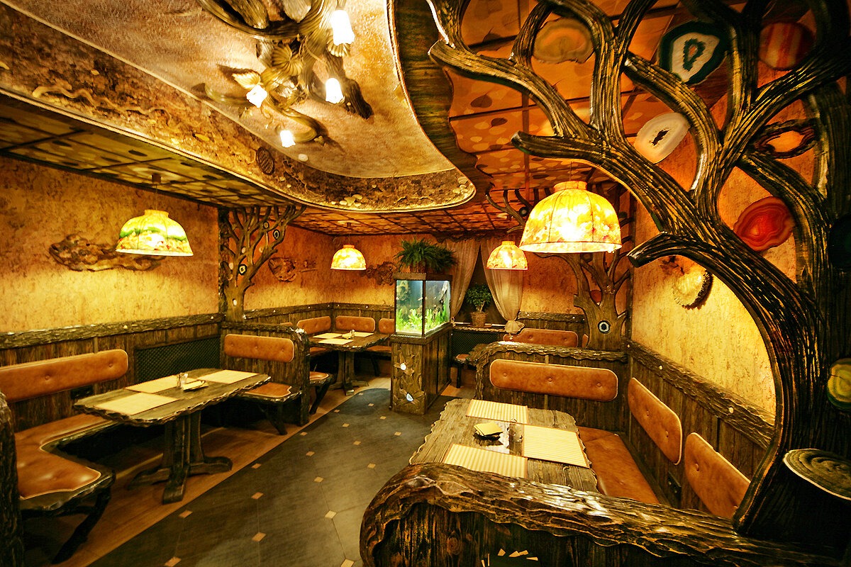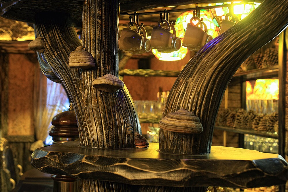 Атмосфера. Волшебное пространство, которое напоминает таинственную лесную чащу: перегородки из причудливых ветвей, мощный дуб, поддерживающий потолок, и барная стойка, стилизованная под цветочную поляну. Добавляют уникальности и рукотворные детали — лампа-цветок с агатами, расписные абажуры. По вечерам атмосферу дополняют живые концерты, танцы и костюмированные вечеринки.