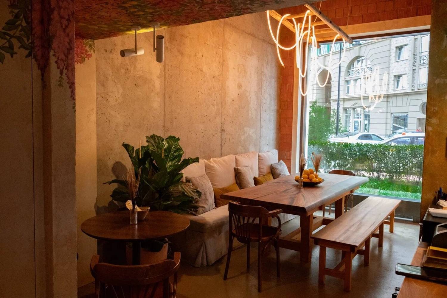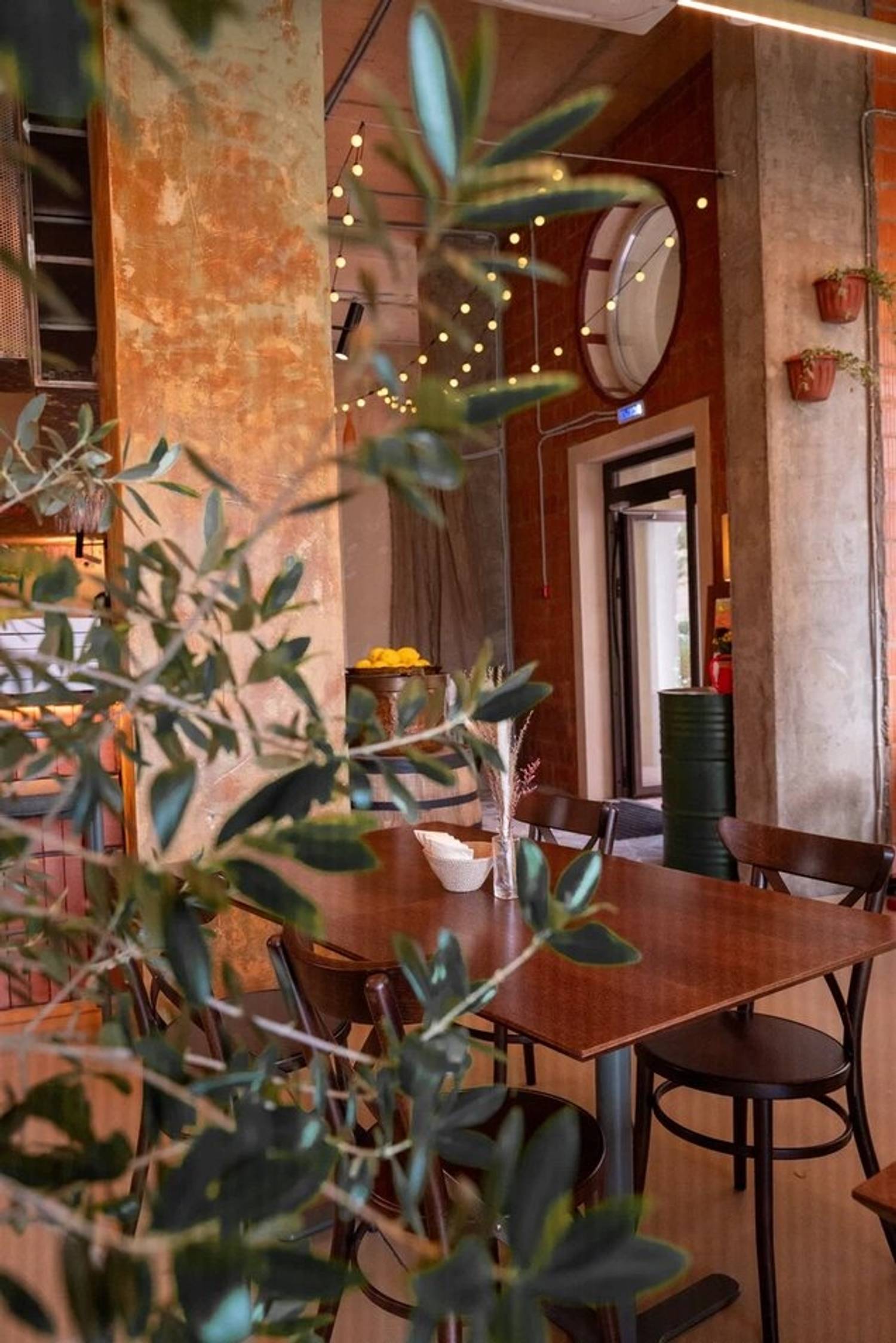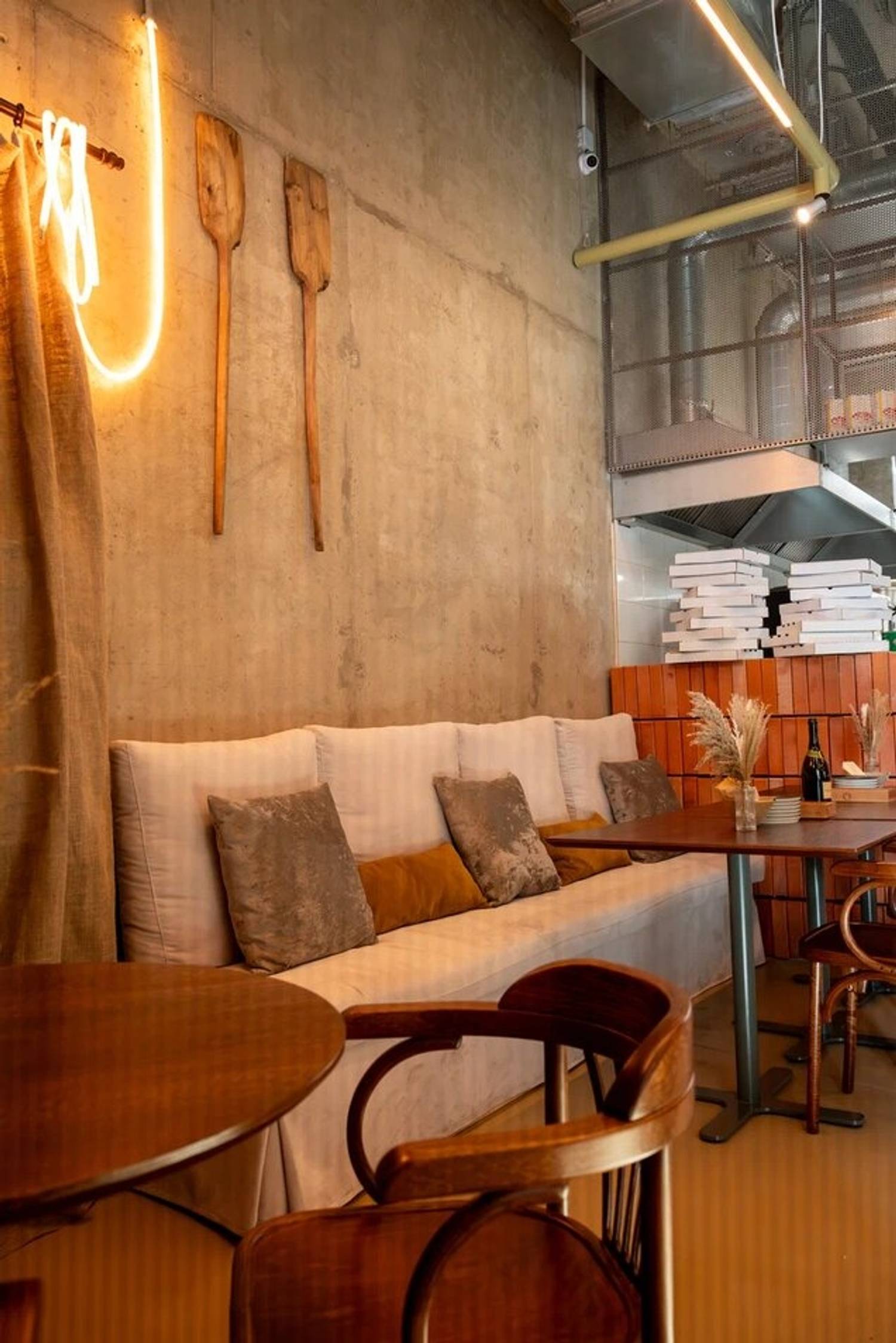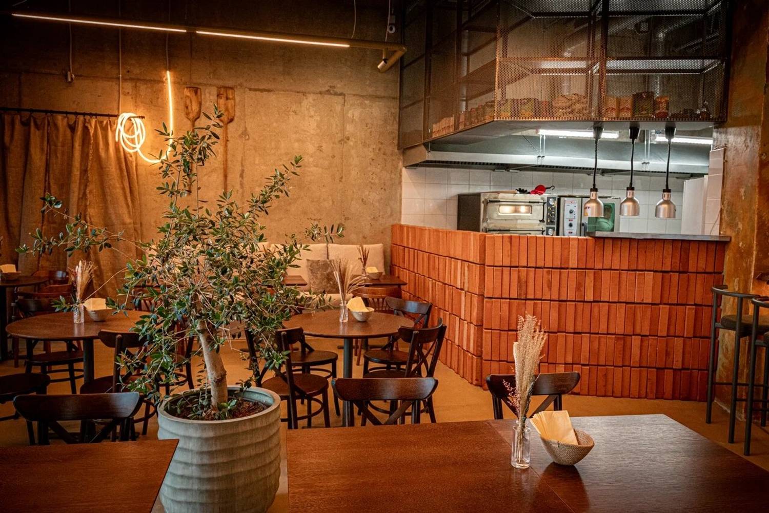 Атмосфера. Интерьер сочетает лофтовые бетонные стены с уютной мебелью в бежево-песочной гамме. Детали в виде резных стульев, композиций из колосьев и мягкого освещения создают образ тосканской траттории, куда можно прийти с детьми или домашними питомцами.