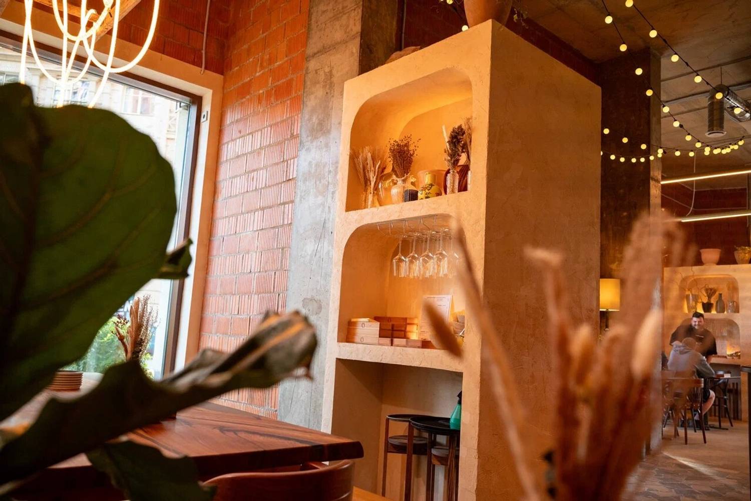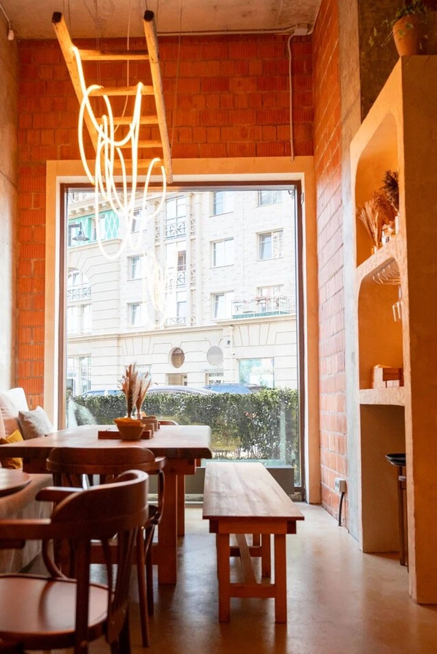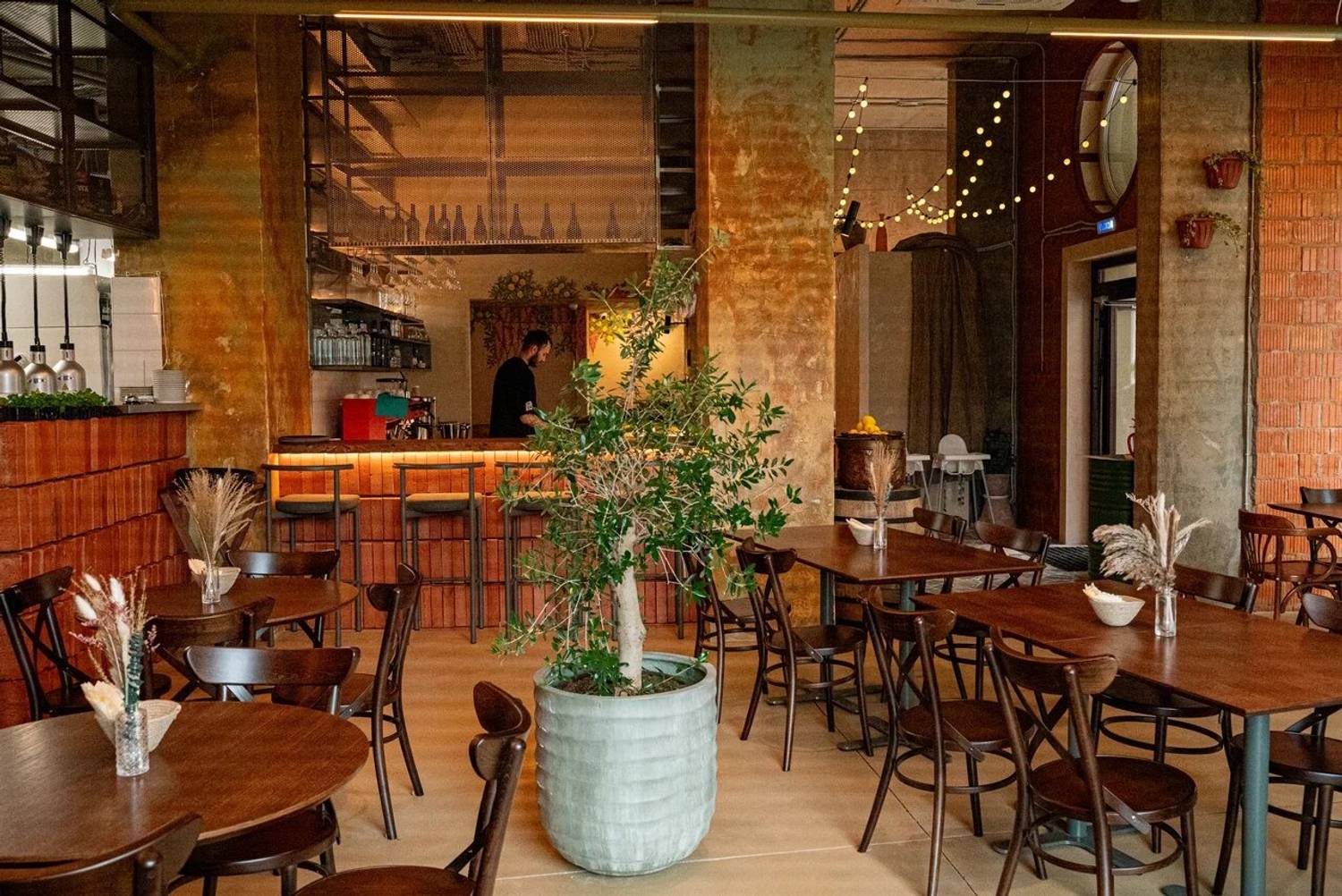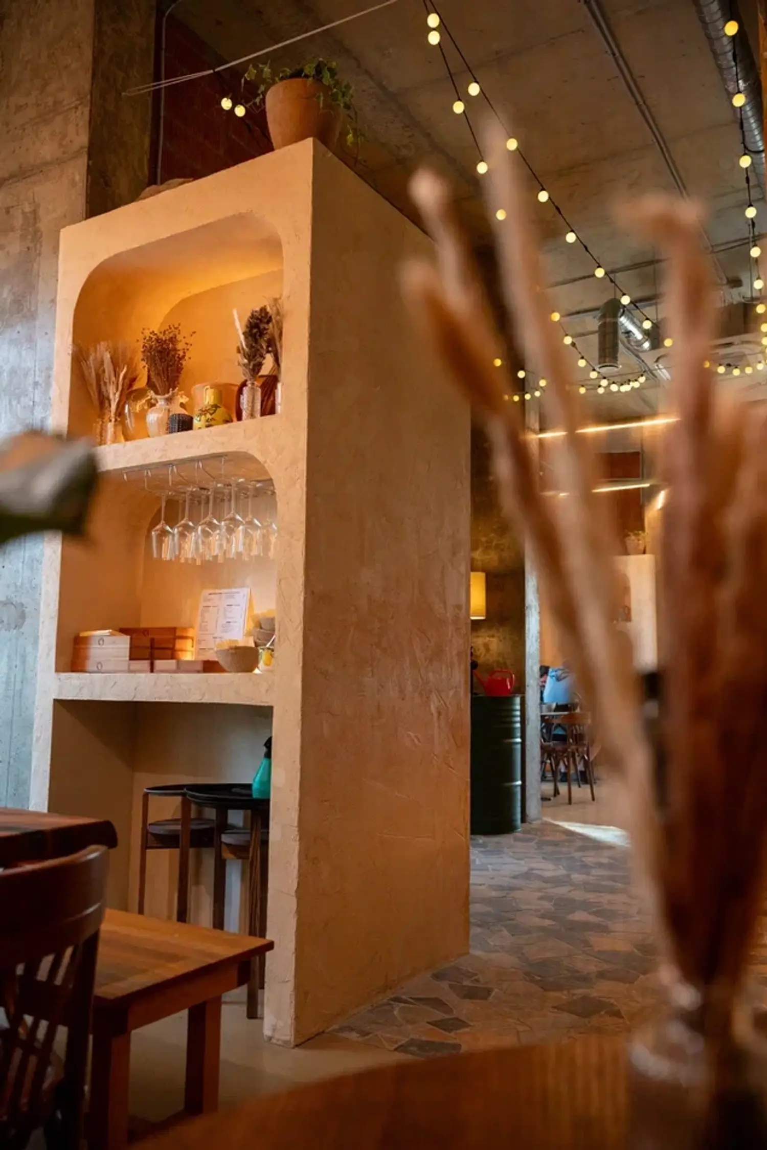 Атмосфера. Интерьер сочетает лофтовые бетонные стены с уютной мебелью в бежево-песочной гамме. Детали в виде резных стульев, композиций из колосьев и мягкого освещения создают образ тосканской траттории, куда можно прийти с детьми или домашними питомцами.