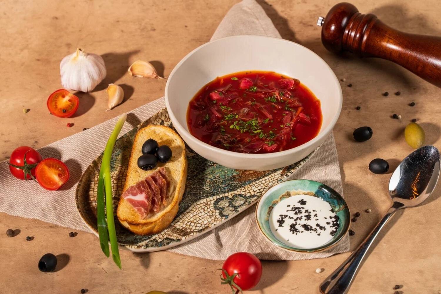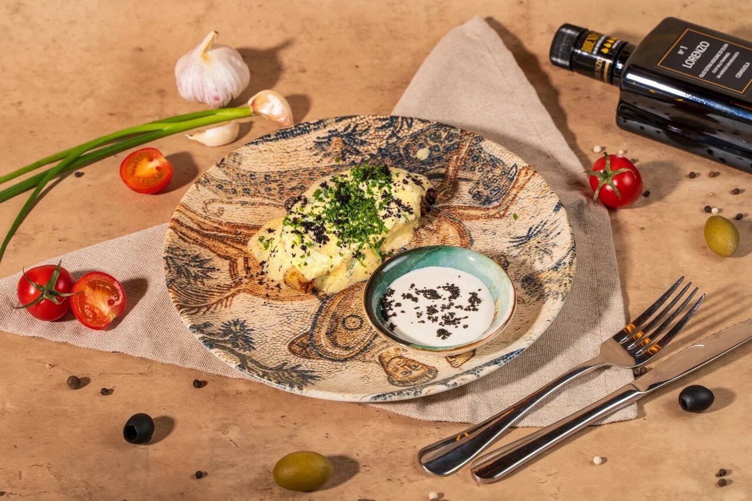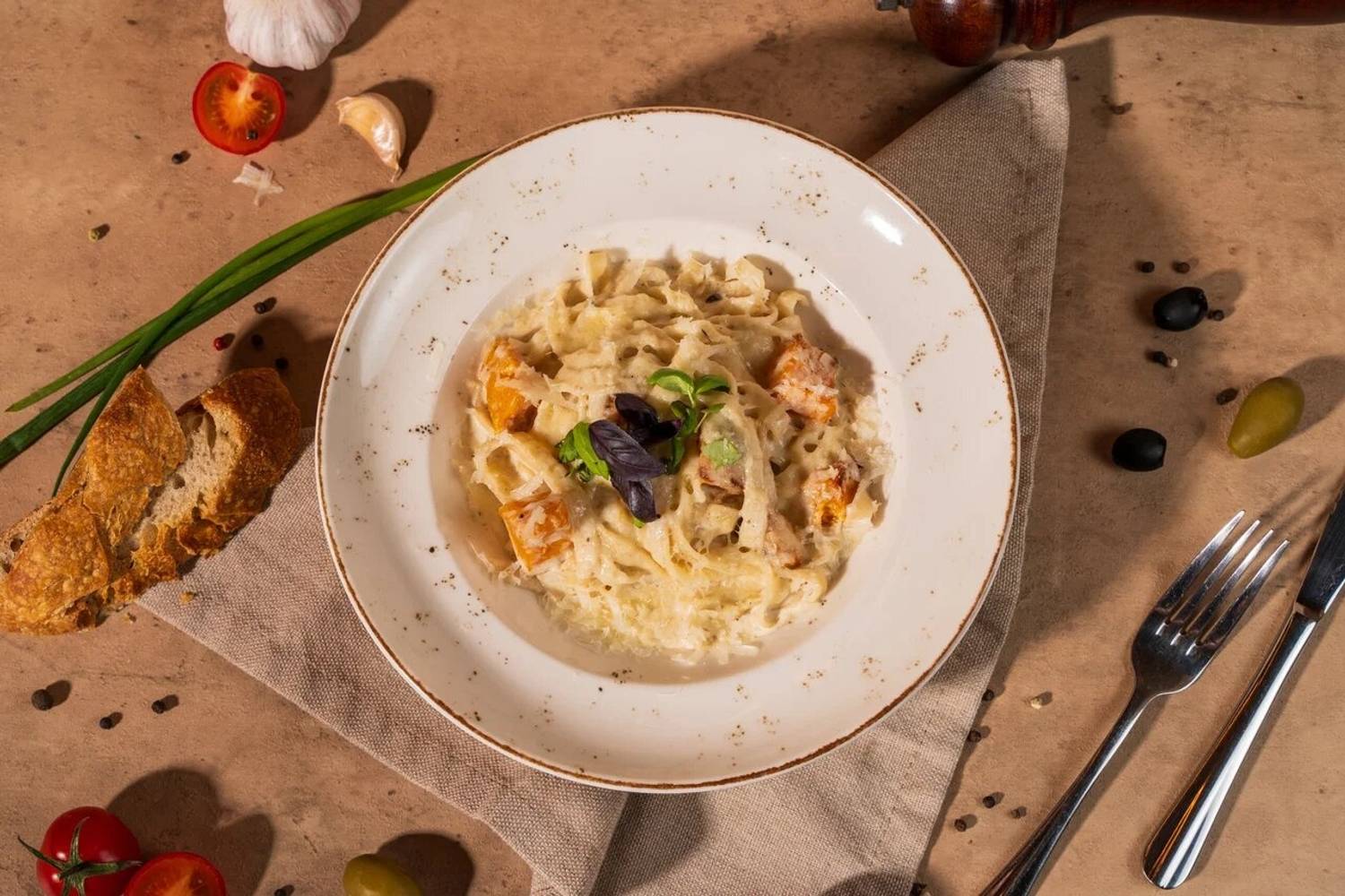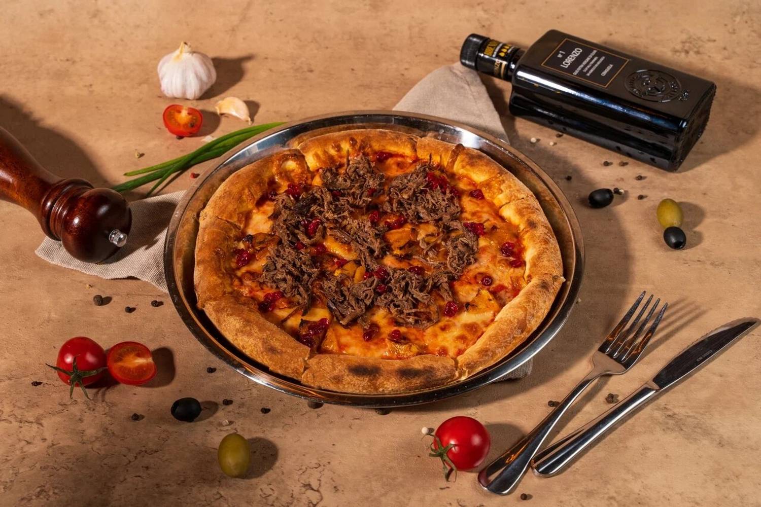 Еда и напитки. В меню — паста тальятелле с форелью, пицца «Парма» с прошутто, оссобуко и салат с утиной печенью. Блюда готовятся по рецептам разных регионов Италии с акцентом на традиционные техники и свежие продукты.