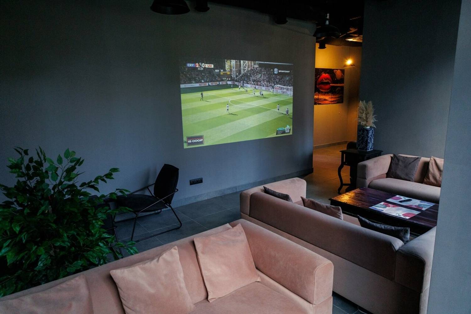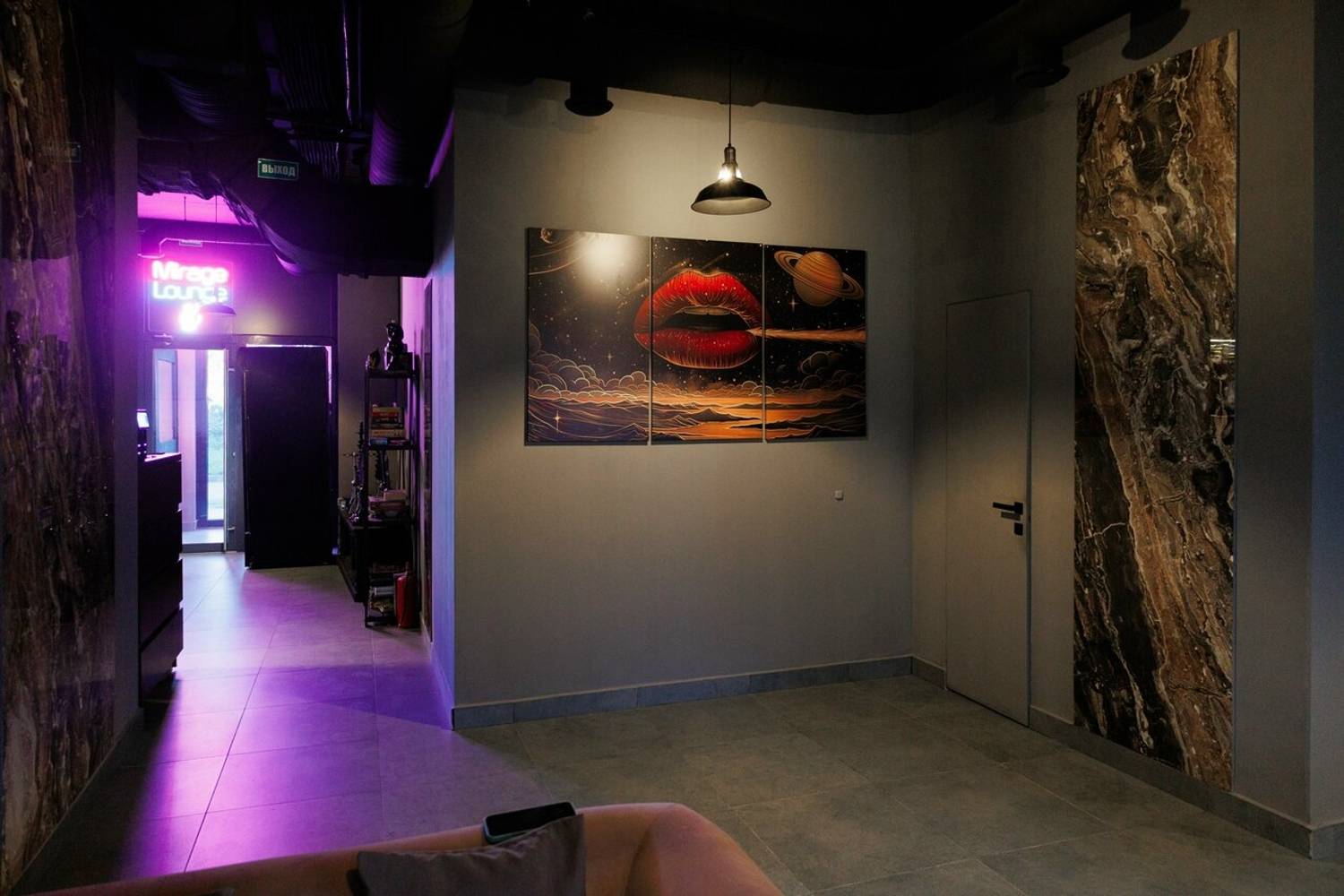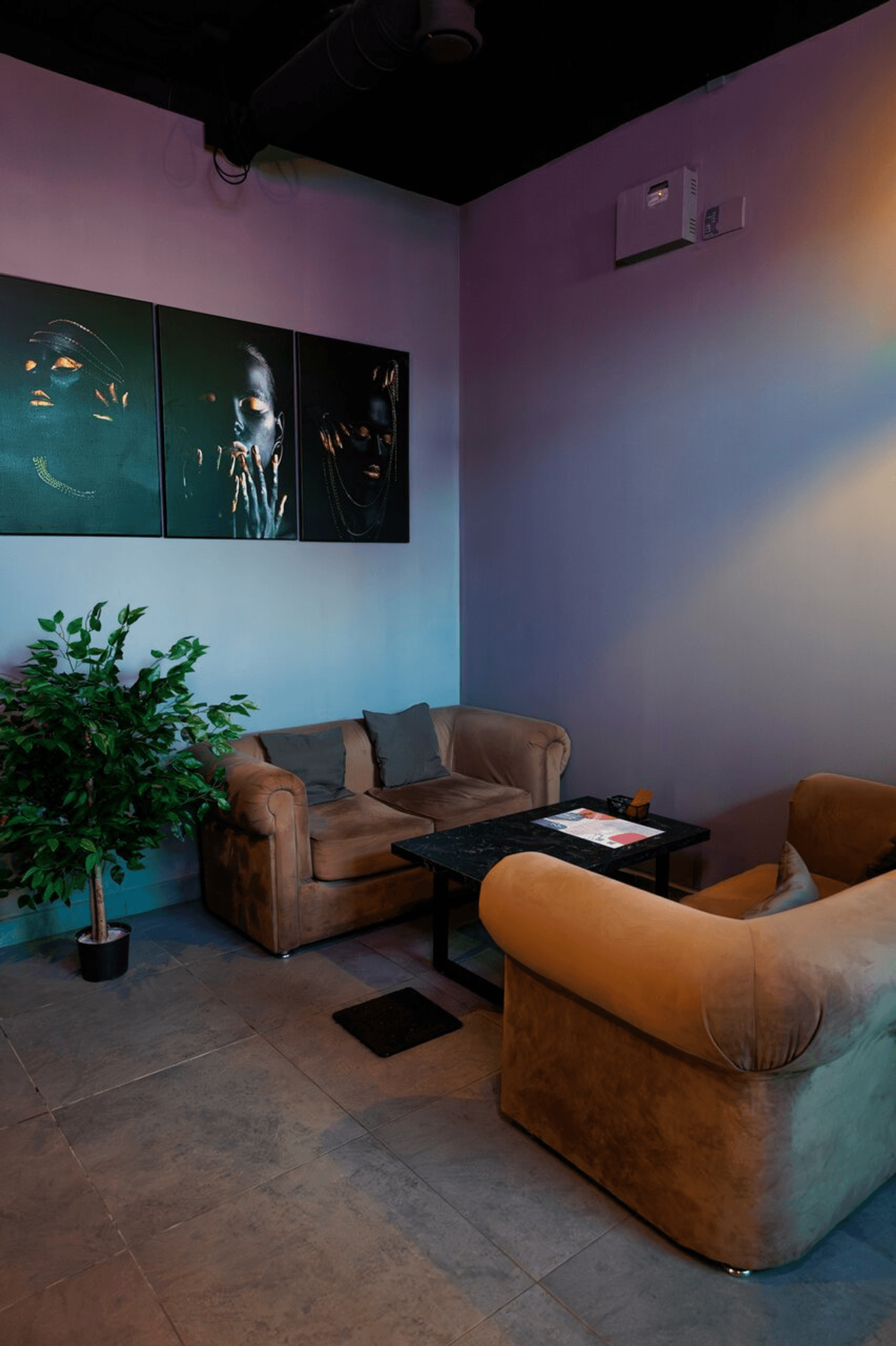 Атмосфера. Пространство с серыми стенами, мягкими диванами, мраморной отделкой и неоновой подсветкой погружает в расслабляющую обстановку. Живые растения добавляют уюта, а внимание гостей сосредоточено на общении, играх и кальянах.