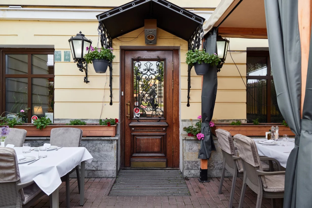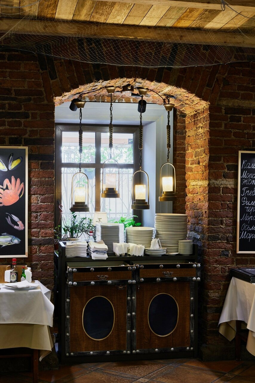 Атмосфера. Пространство сохранило дух старины с кирпичными стенами и сводчатыми потолками, а из окон открывается живописная панорама. Здесь можно расположиться на уютных стеганых диванах или резных стульях, а также полюбоваться различными деталями из прошлого: резными арками или изящными статуями. В теплое время года гости могут расположиться на летней террасе, любуясь закатом над Малой Невкой.